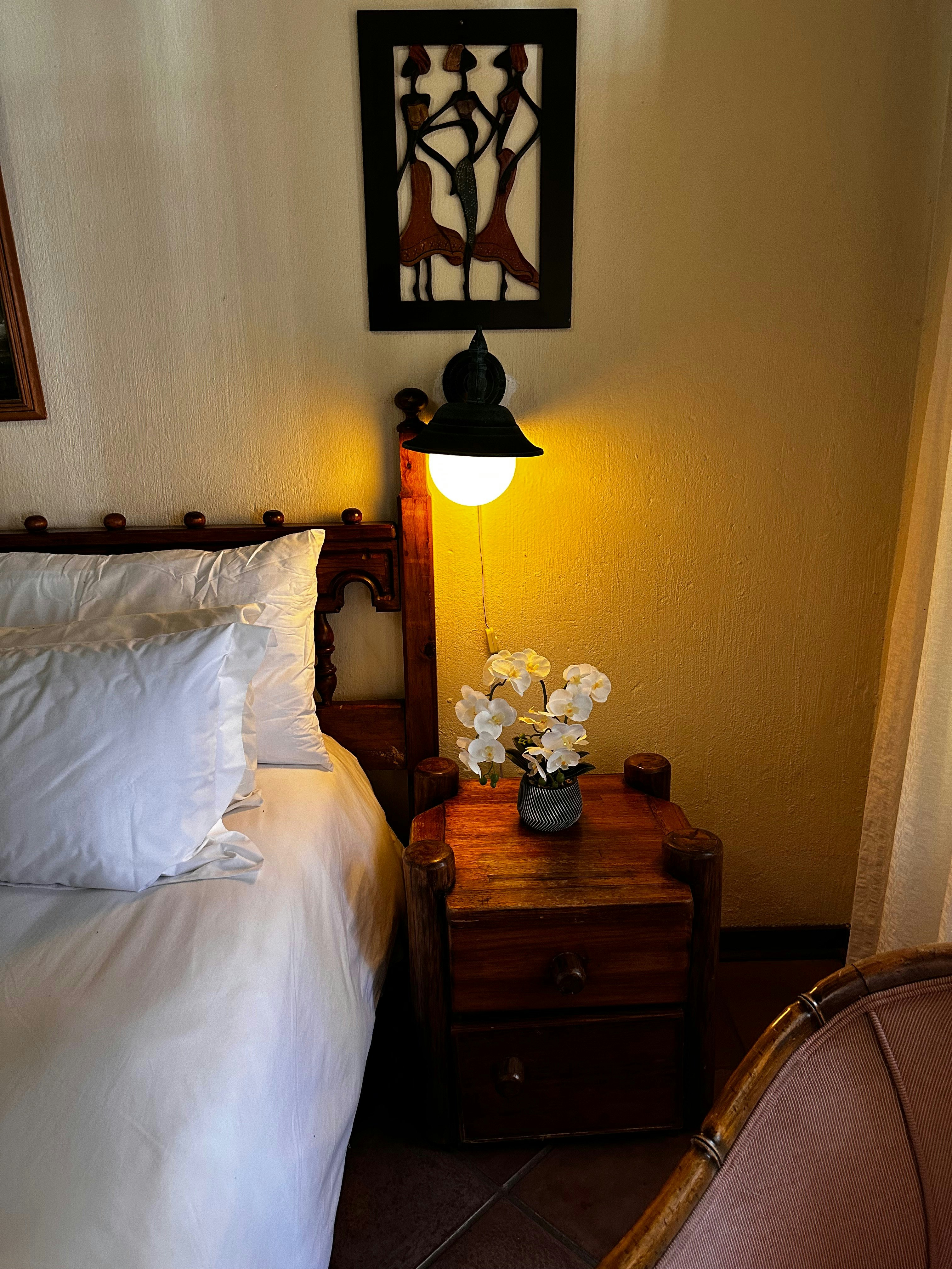 Guests can enjoy breakfast, lunch, and dinner in the dining room or on the patio, both overlooking lush gardens that provide the perfect setting for relaxation. There is also a communal swimming pool and braai areas available for guests to use.