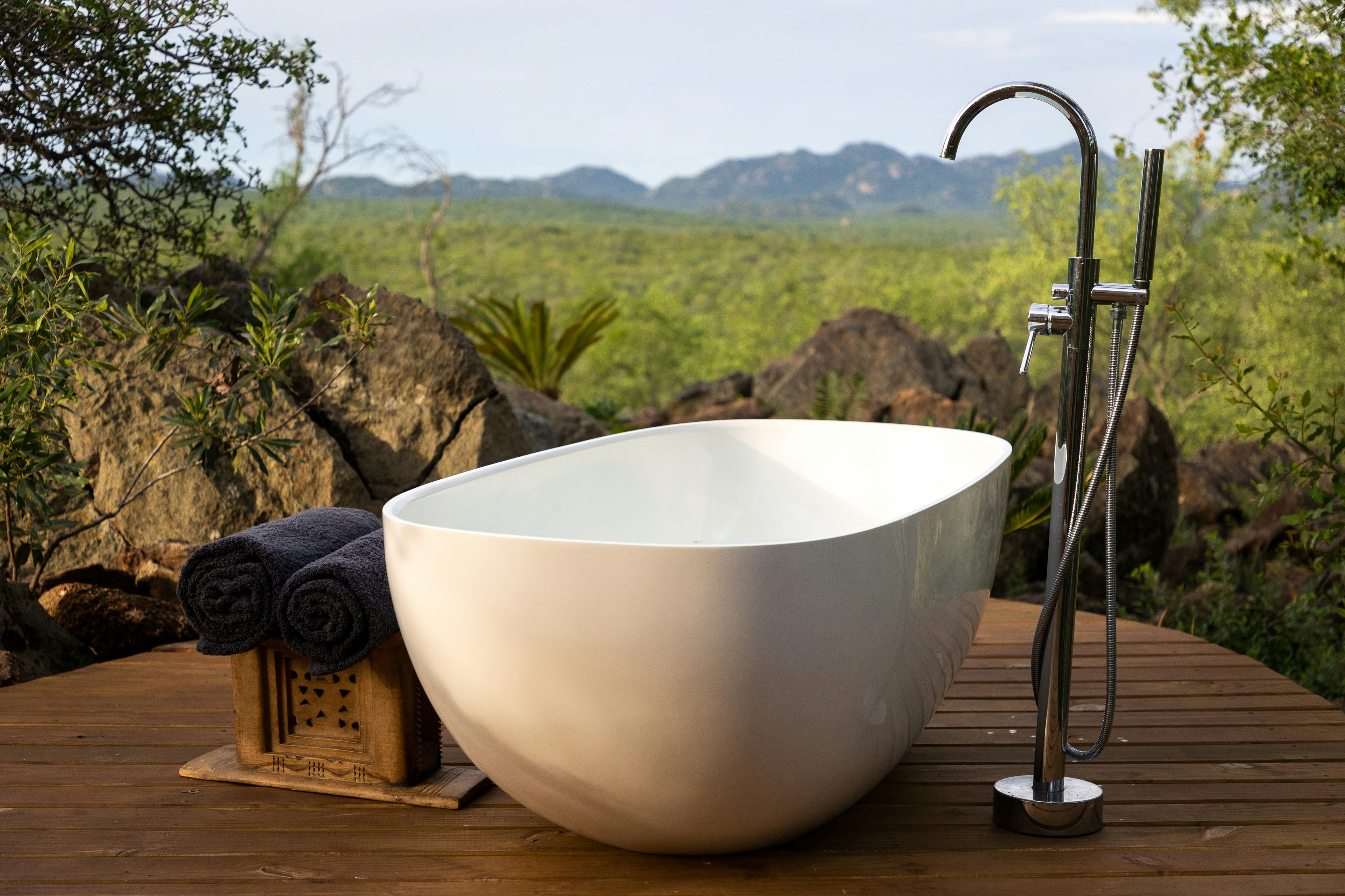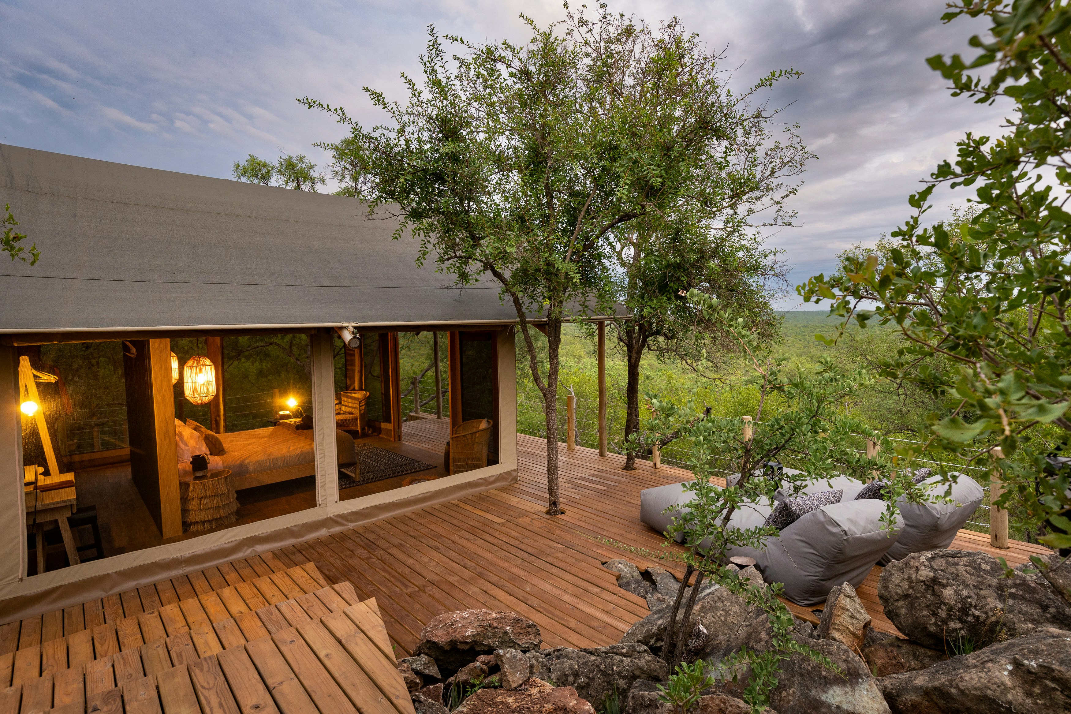 This elevated private, luxury tent can accommodate 2 adults and 2 children. Seringa features 3 platforms; an entertainment deck, a sleeping deck, and a bathroom deck offering a romantic outside bath facing the hills of the GaMashishimale. The bedroom tent is furnished with a king-size bed, ceiling fan, cupboard space, and a complimentary tea and coffee station. A camp bed will be provided for 2 children. It features a bathroom fitted with a shower, toilet, and washbasin.