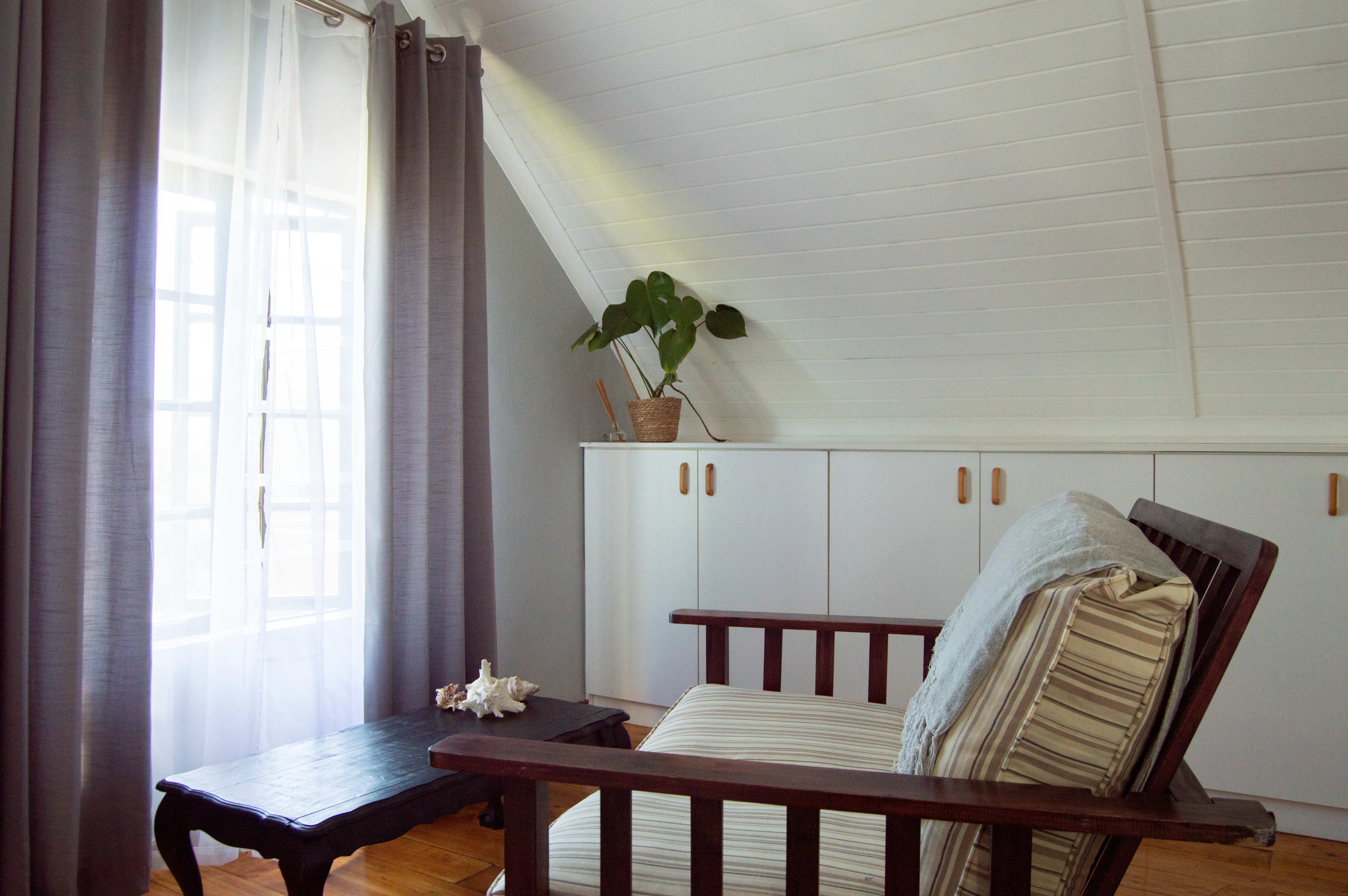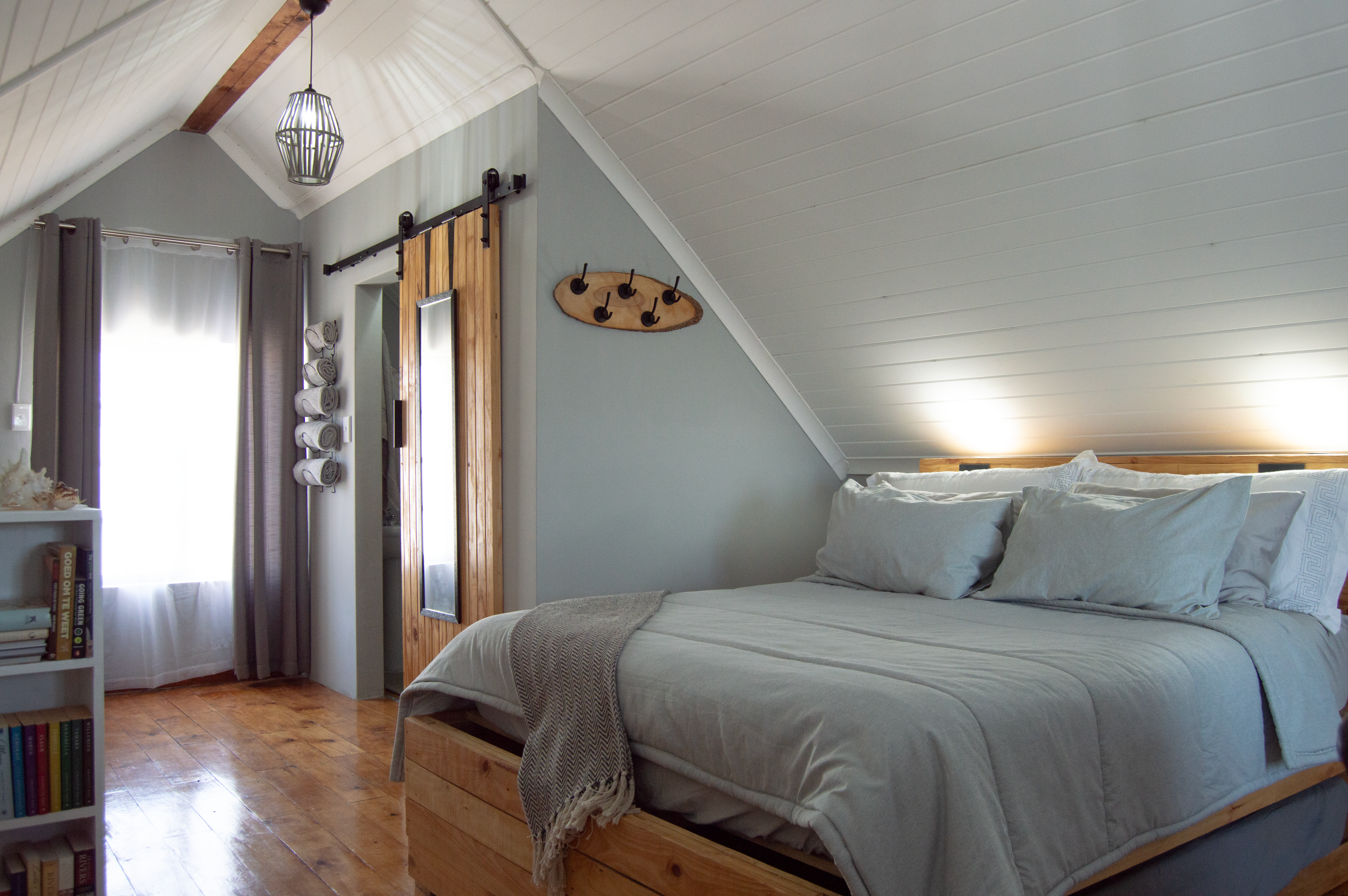 This cottage accommodates 4 adults and 1 child and comprises 1 en-suite bedroom. The loft bedroom is comfortably furnished with a queen-size bed and a child-only mattress, offering stunning ocean views. The en-suite bathroom is fitted with a shower, toilet, and washbasin. Linen and bath towels are provided for guests' convenience. The open-plan lounge area offers comfortable seating, a single sleeper couch, and an additional floor mattress, making it suitable for extra guests. Please note that there is no separate second bedroom; the sleeper couch is located in the living area.