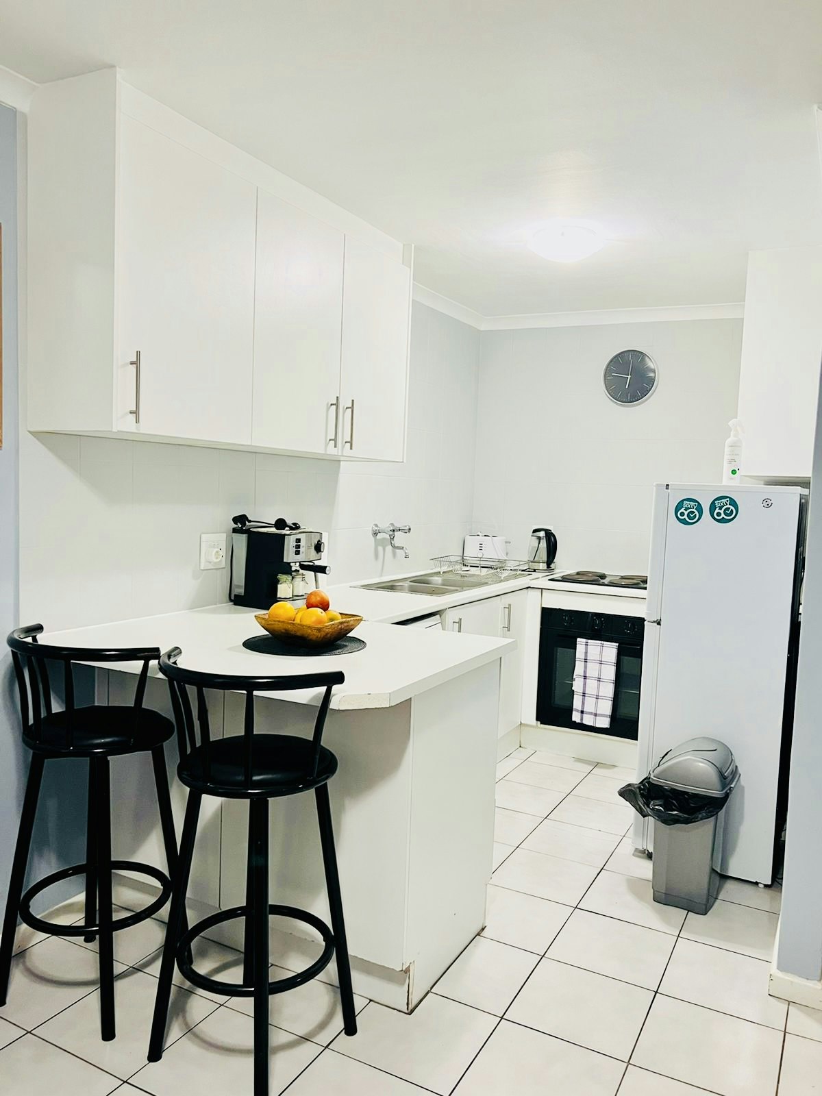 Die woonstel het 'n oopplan-kombuis, -sitkamer en -leefarea. Die kombuis het 'n yskas, stoof en oond, mikrogolf, tee- en koffiemaakgeriewe, broodrooster, en 'n wasmasjien. Die oopplan-leefarea het 'n etenstafel met sitplek vir 2 en 'n sitkamer met 'n TV en sekere DStv-kanale.