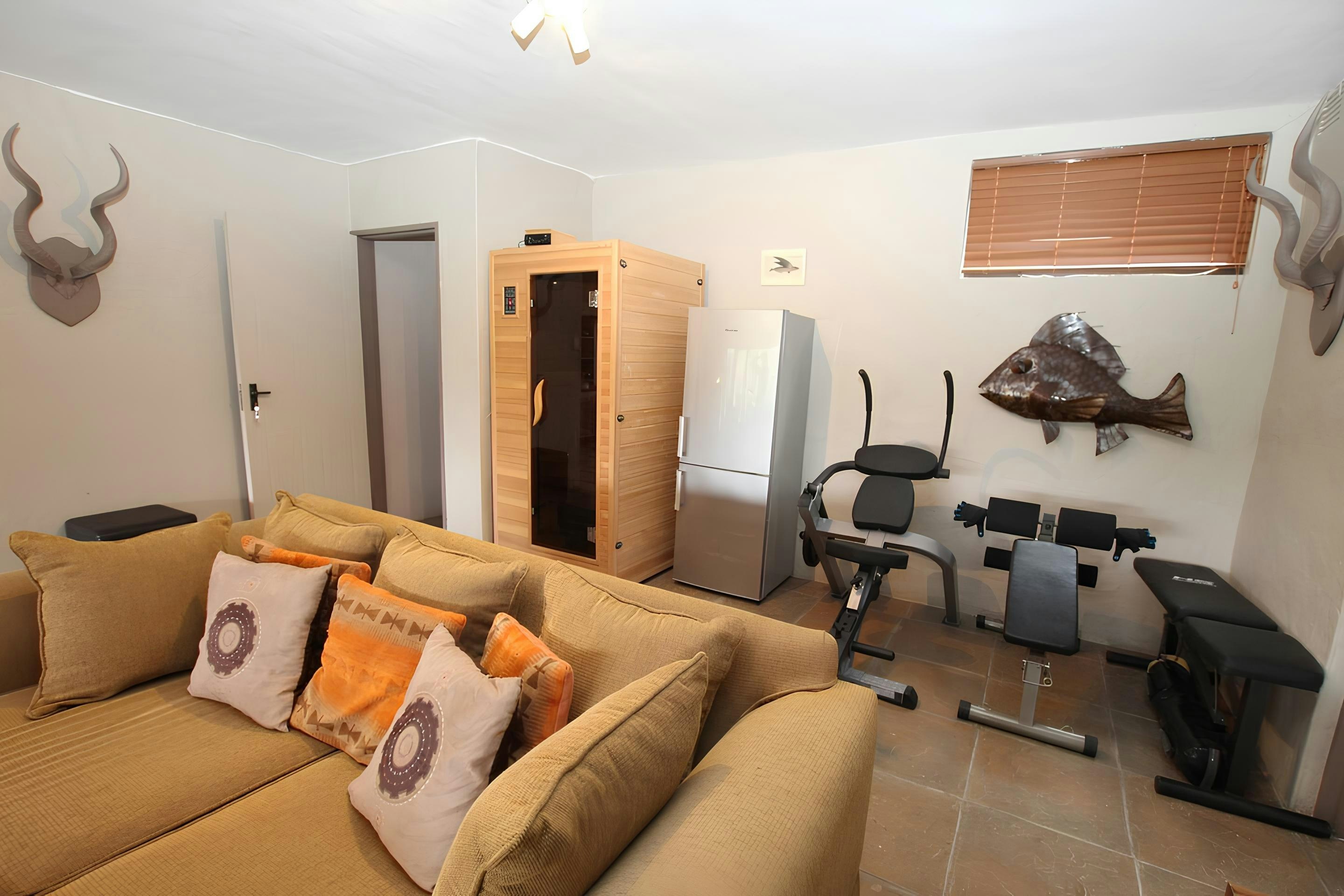 Die leefarea lei na 'n ruim houtdek met buitesitplek, 'n vuurput en 'n swembad. Daar is ook 'n gimnasium en sauna. Veilige parkeerplek is op die perseel beskikbaar.