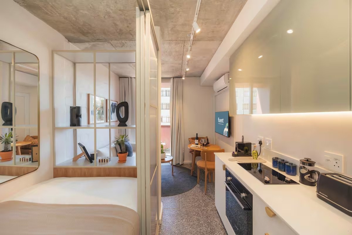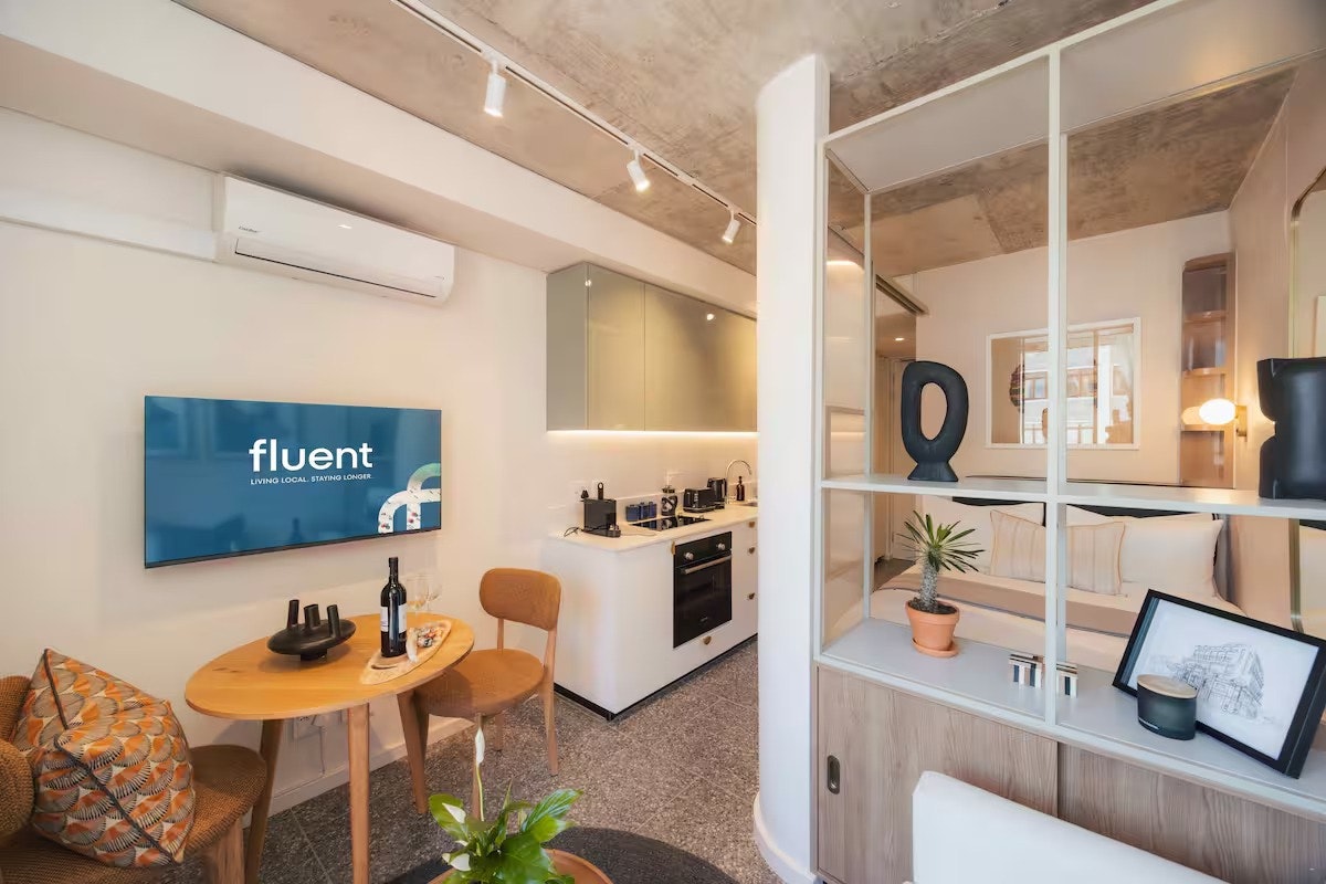 The unit includes a small modern kitchen equipped with a fridge-freezer, 2-plate stove, oven, microwave, cutlery, and crockery, as well as tea- and coffee-making facilities. The adjacent lounge offers a 2-seater dining table, a comfortable couch, and a wall-mounted smart TV with streaming services. Wi-Fi access is available.