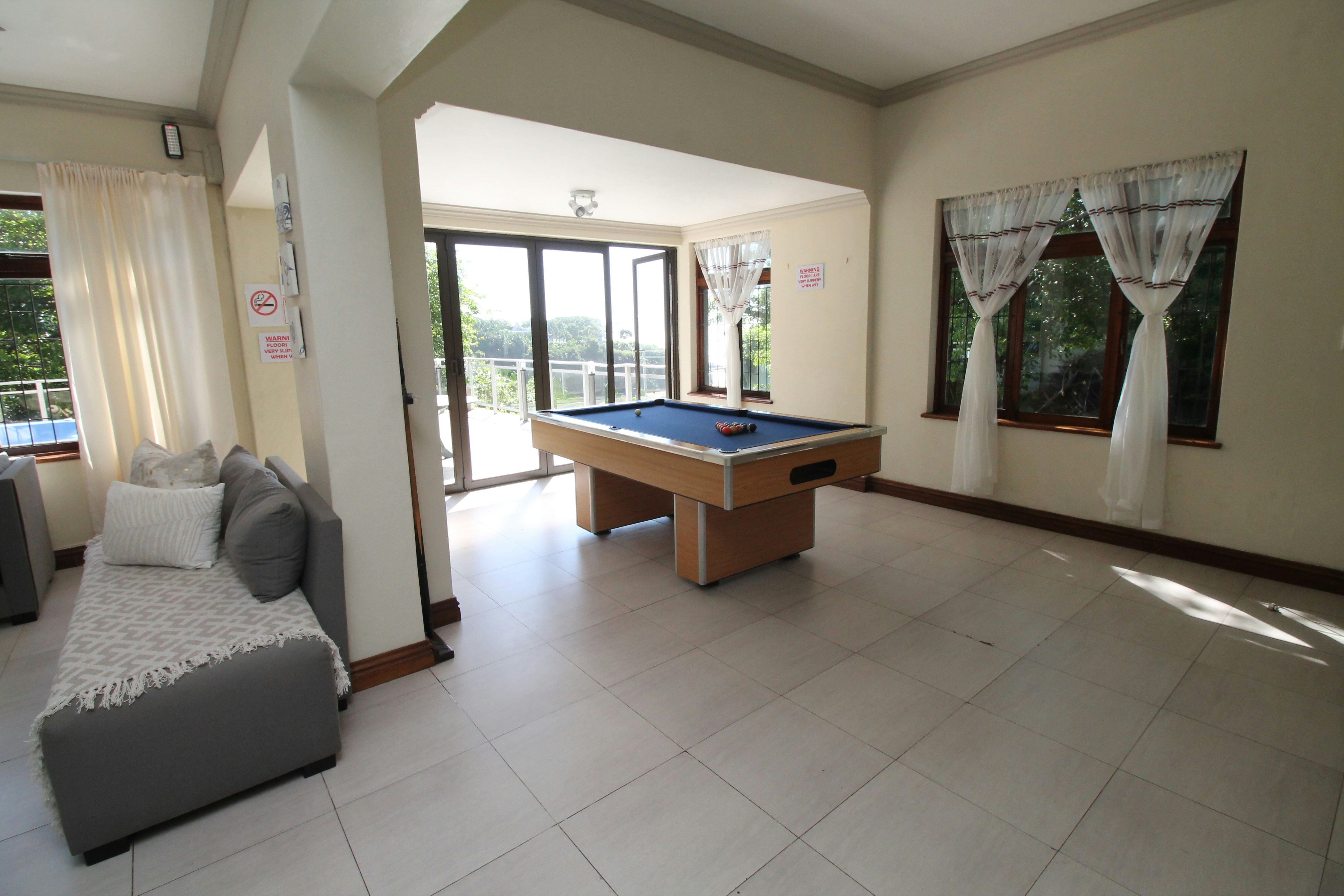Daar is 2 slaapbanke in die oopplan-leefarea. Die vermaakarea is langs die leefarea en het 'n pylbord, 'n biljarttafel en tafelsokker. Die vermaakarea bied toegang tot die patio met 'n Jacuzzi en 'n ingeboude braai-area.