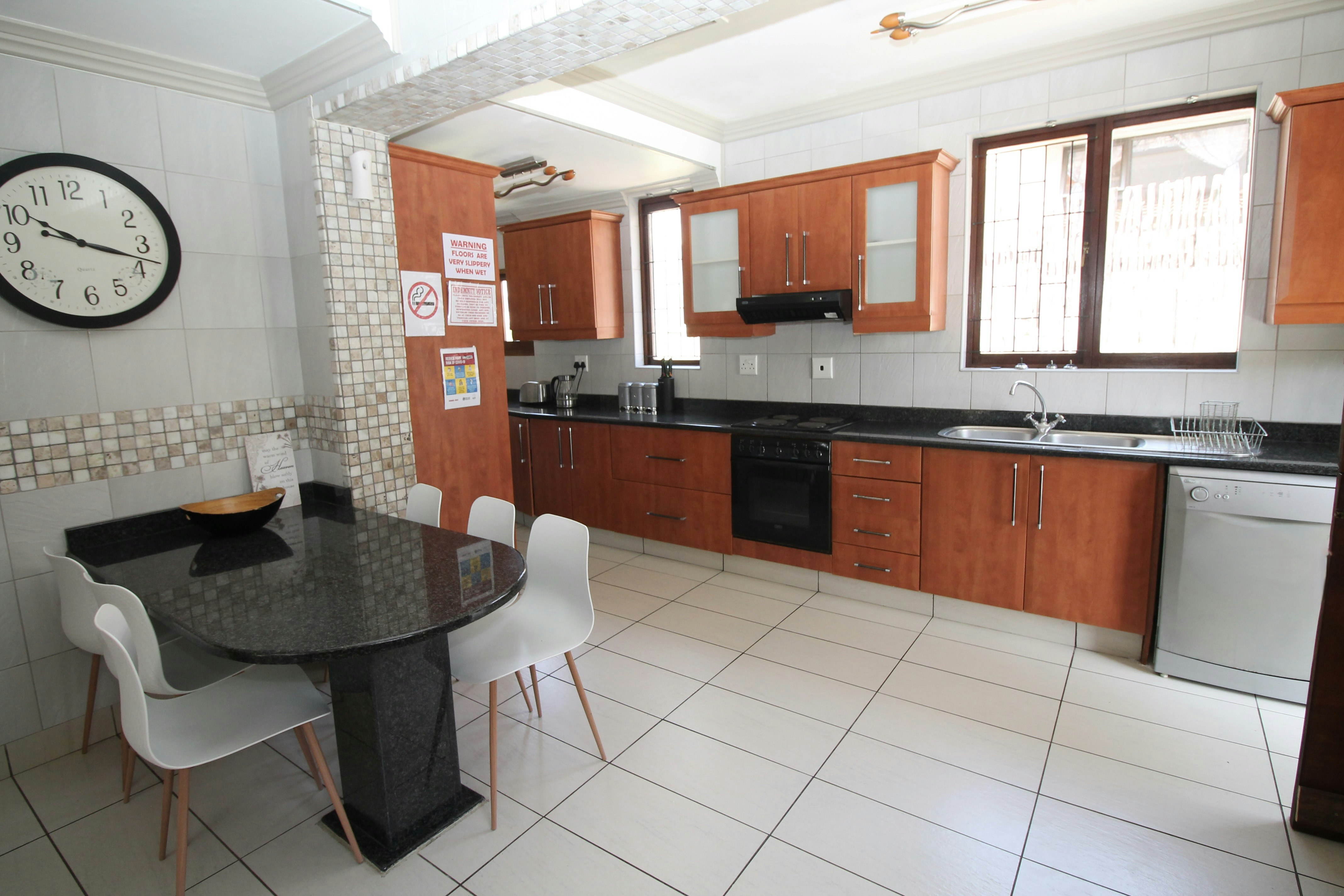 Dié ruim huis beskik oor 5 slaapkamers waarvan 3 en suite-badkamers het, terwyl die ander 2 'n badkamer deel. 4 slaapkamers het koningingrootte-beddens en 1 kamer het 2 enkelbeddens wat ideaal is vir 2 kinders. Die kombuis is volledig toegerus met al die nodige toebehore, asook 'n skottelgoedwasser, wasmasjien en 'n tuimeldroër.