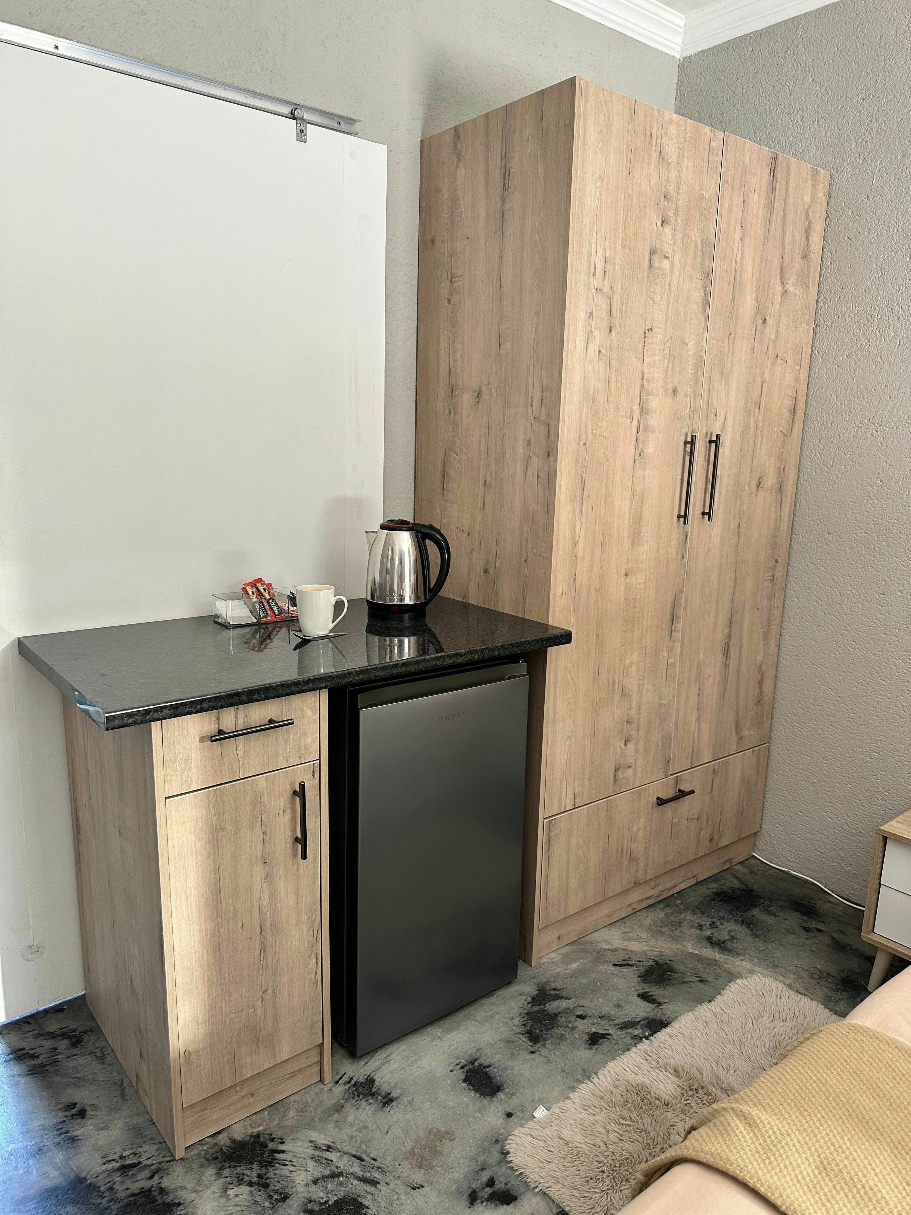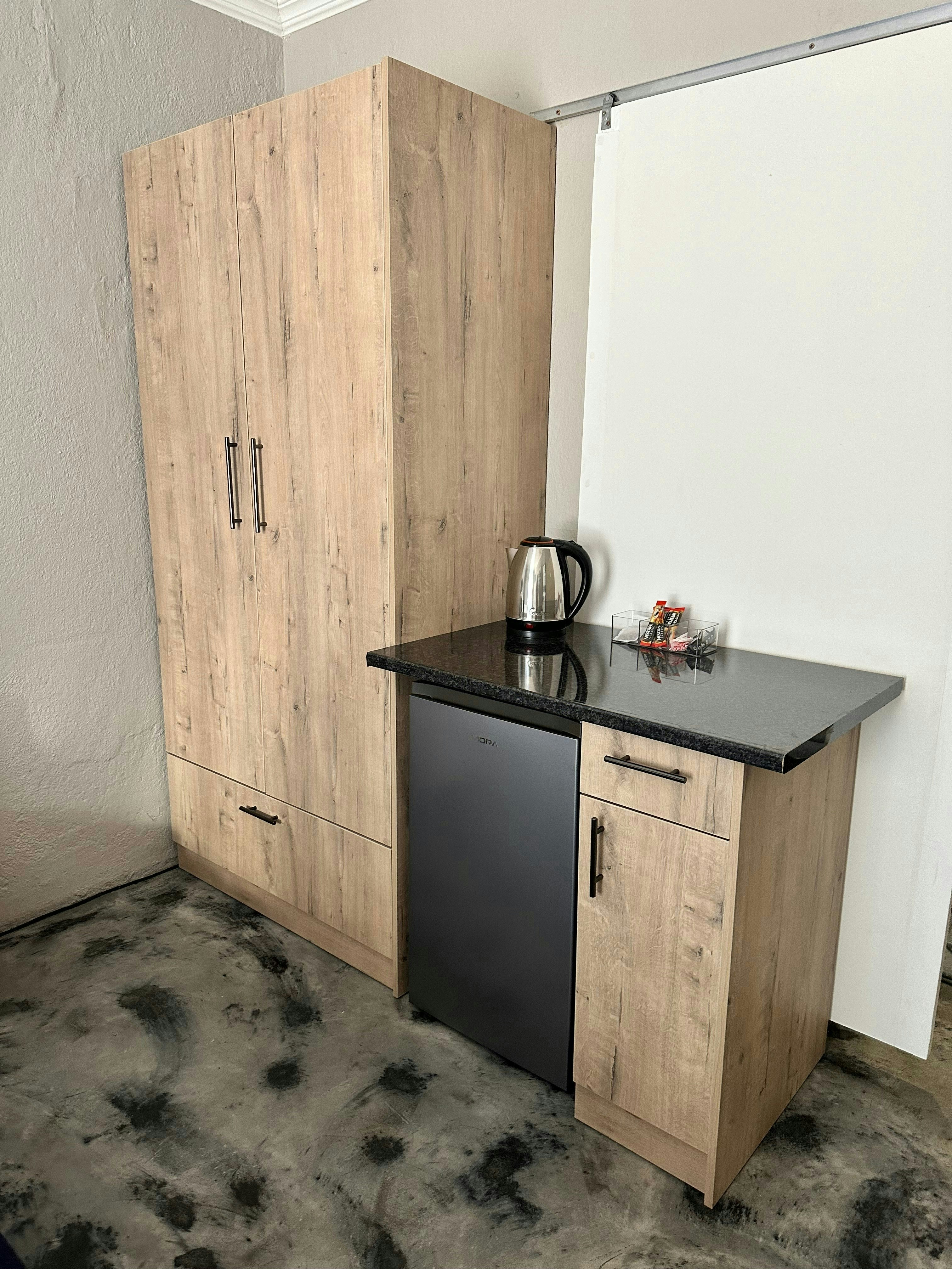 Die oopplan-leefarea sluit 'n volledig toegeruste kombuis in met 'n tweeplaatgasstoof, mikrogolfoond, yskas-vrieskas, eetgerei en breekware. Die sitkamer bied gemaklike sitplek, 'n slim-TV met YouTube en Netflix, en gratis WiFi-geriewe.