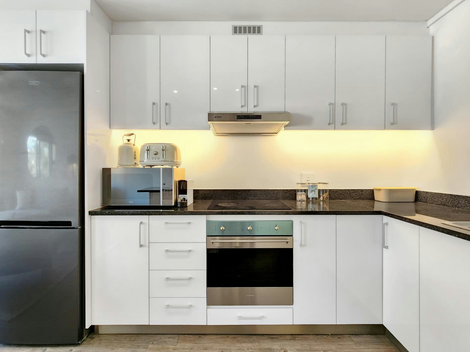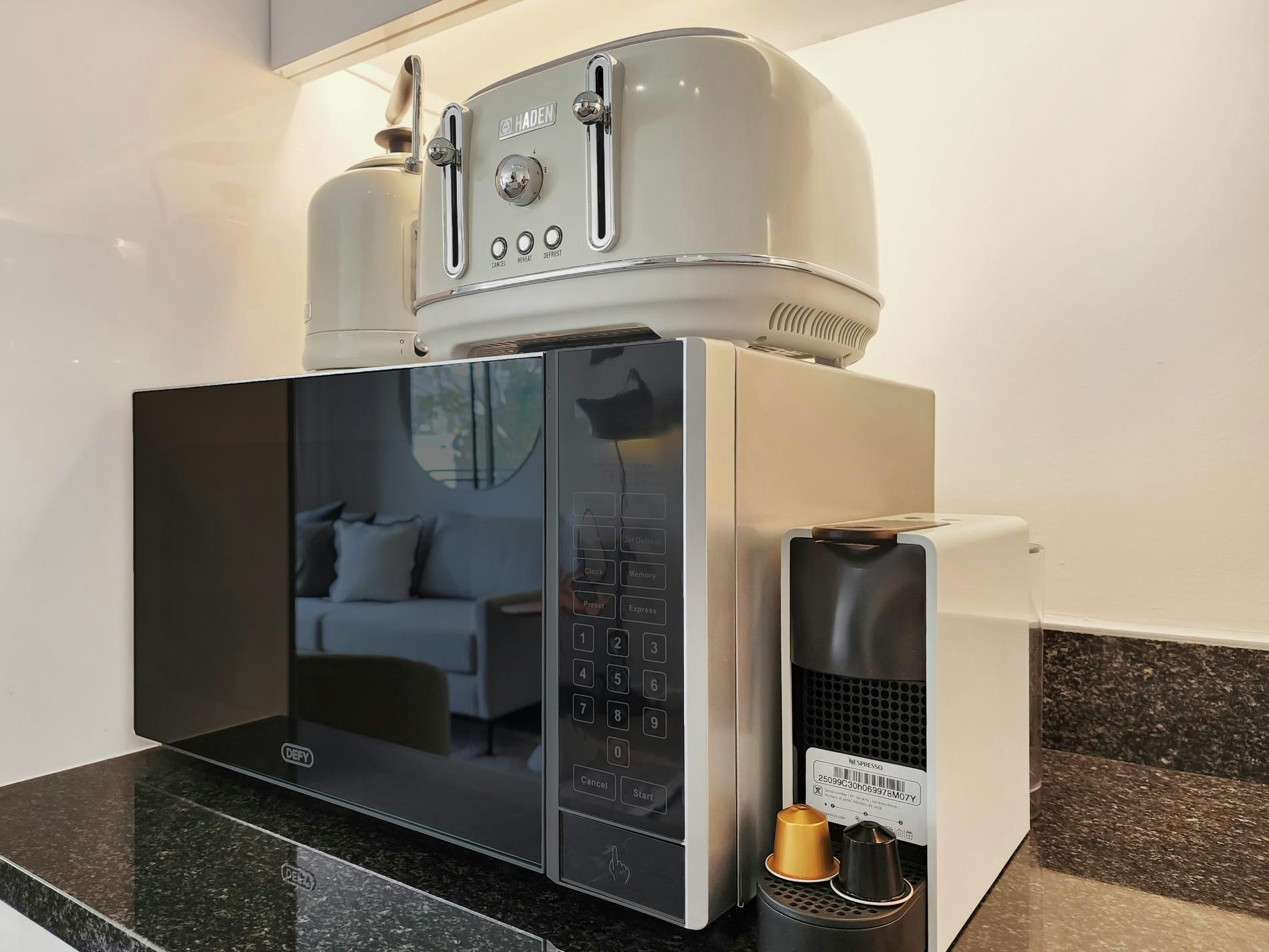 The unit boasts a well-equipped kitchen that includes a stove, oven, microwave, kettle, coffee machine, toaster, fridge-freezer, washing machine, and a breakfast bar with stools. The lounge offers comfortable seating for guests to relax, while a smart TV and free Wi-Fi provide entertainment.