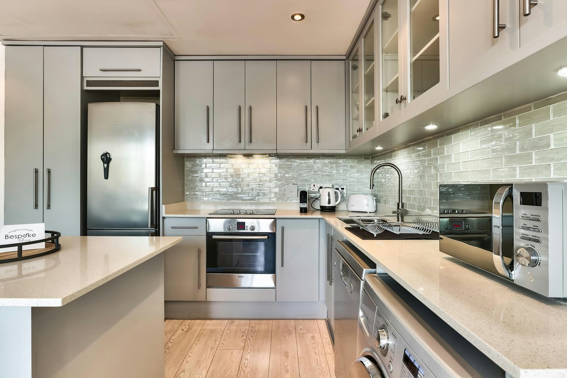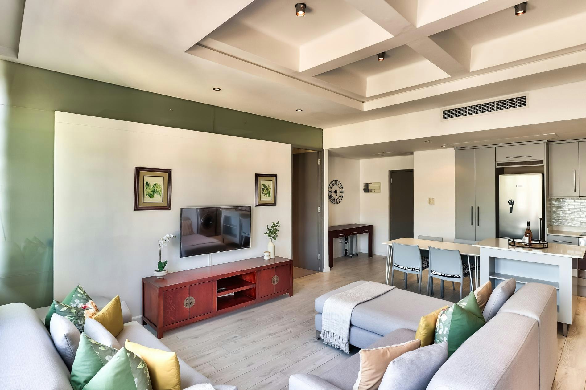 Die oopplan-leefarea beskik oor 'n sitkamer met gemaklike rusbanke en 'n TV. Die kombuis is volledig toegerus met 'n yskas-vrieskas, stoof, oond, broodrooster, koffiemasjien, ketel, wasmasjien en skottelgoedwasser.