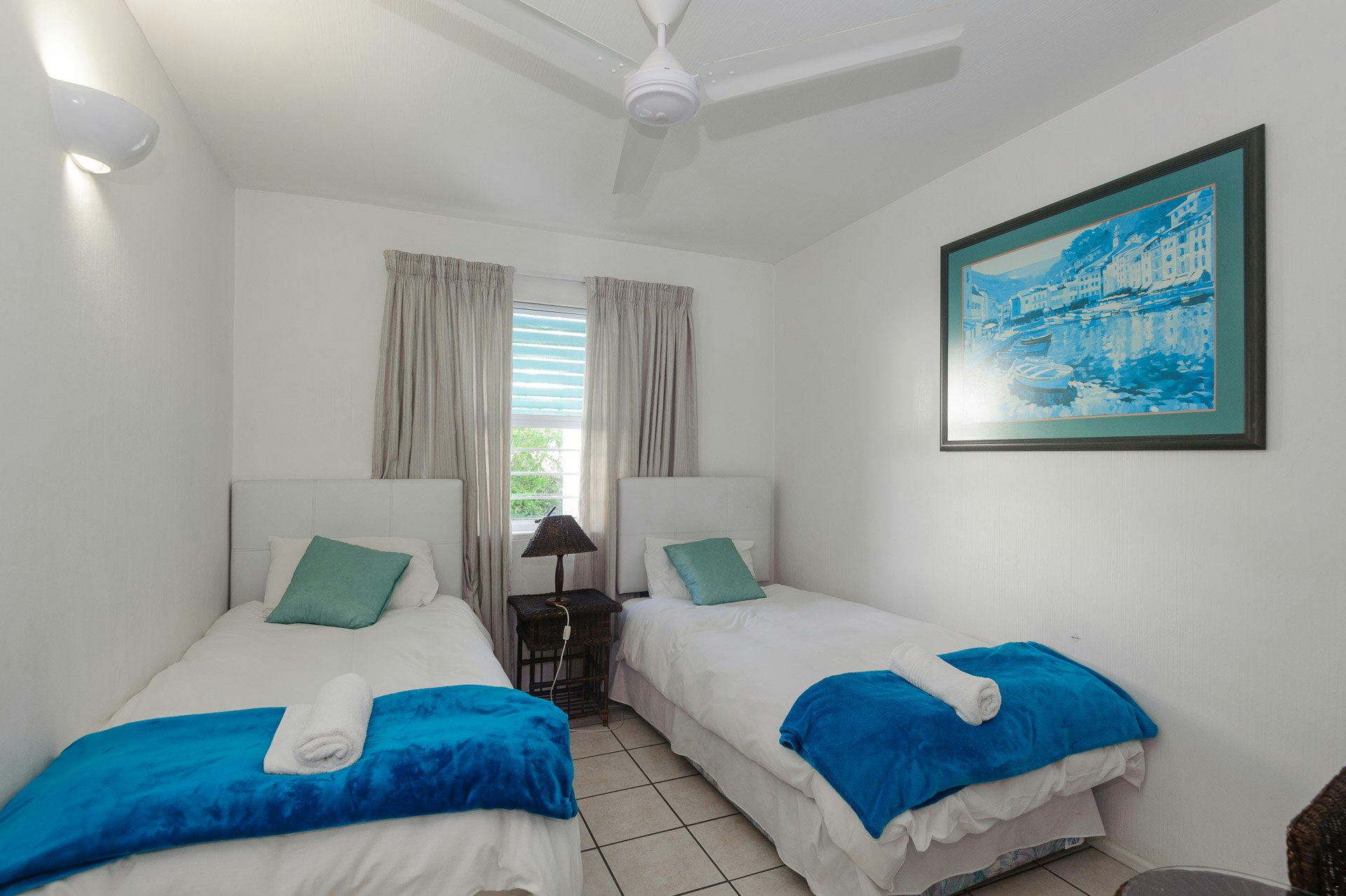 Hierdie lieflike woonstel op die tweede verdieping bied slaapplek vir tot 6 gaste. Die hoofslaapkamer is gemeubileer met 'n koningingrootte-bed en beskik oor 'n en suite-badkamer met 'n bad, toilet en wasbak. Die tweede slaapkamer het 'n dubbelbed en die derde slaapkamer het 2 enkelbeddens. Die tweede badkamer is toegerus met 'n stort, toilet en wasbak. Die aparte badkamer is slegs toegerus met 'n toilet en wasbak. Al 3 slaapkamers het plafonwaaiers.