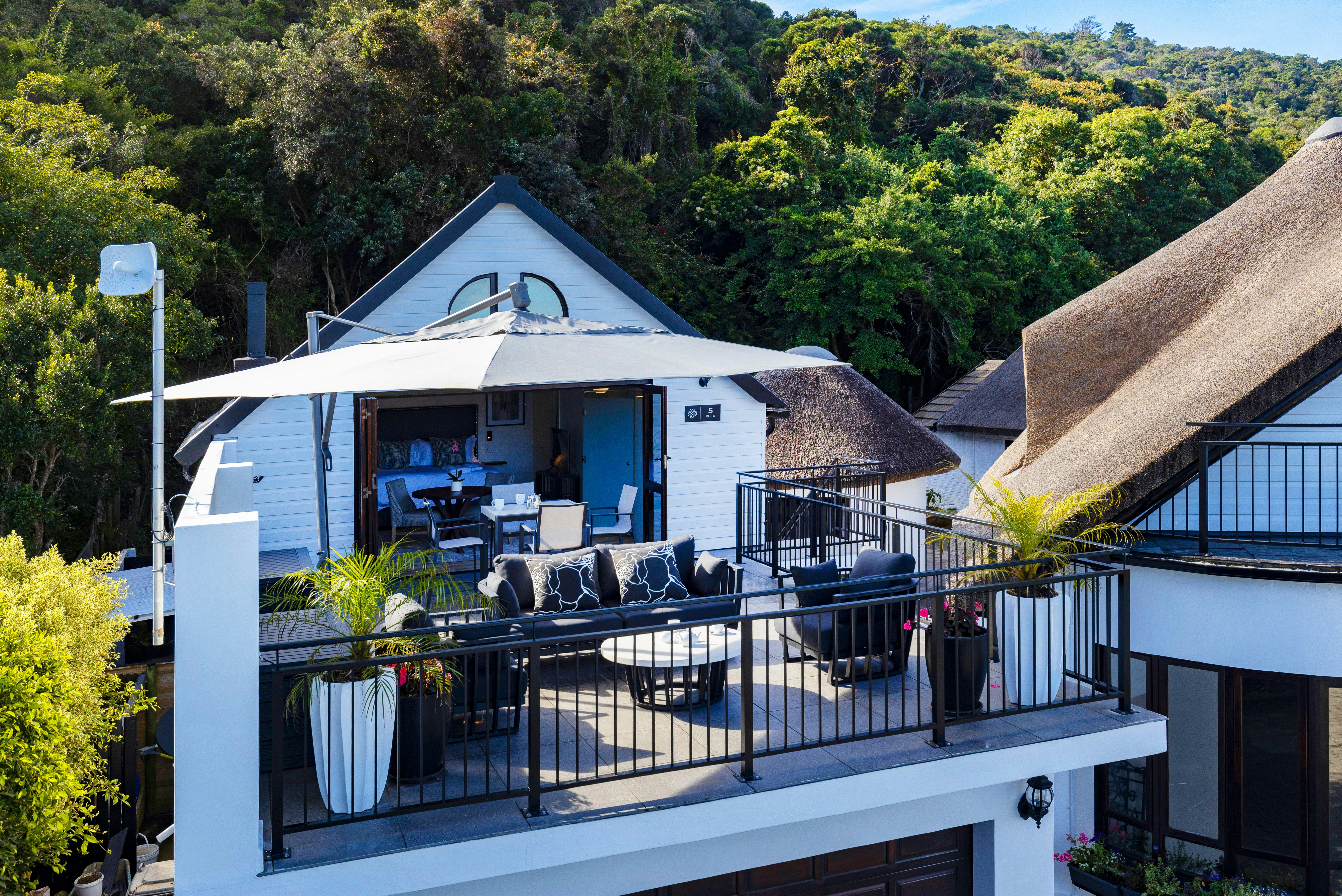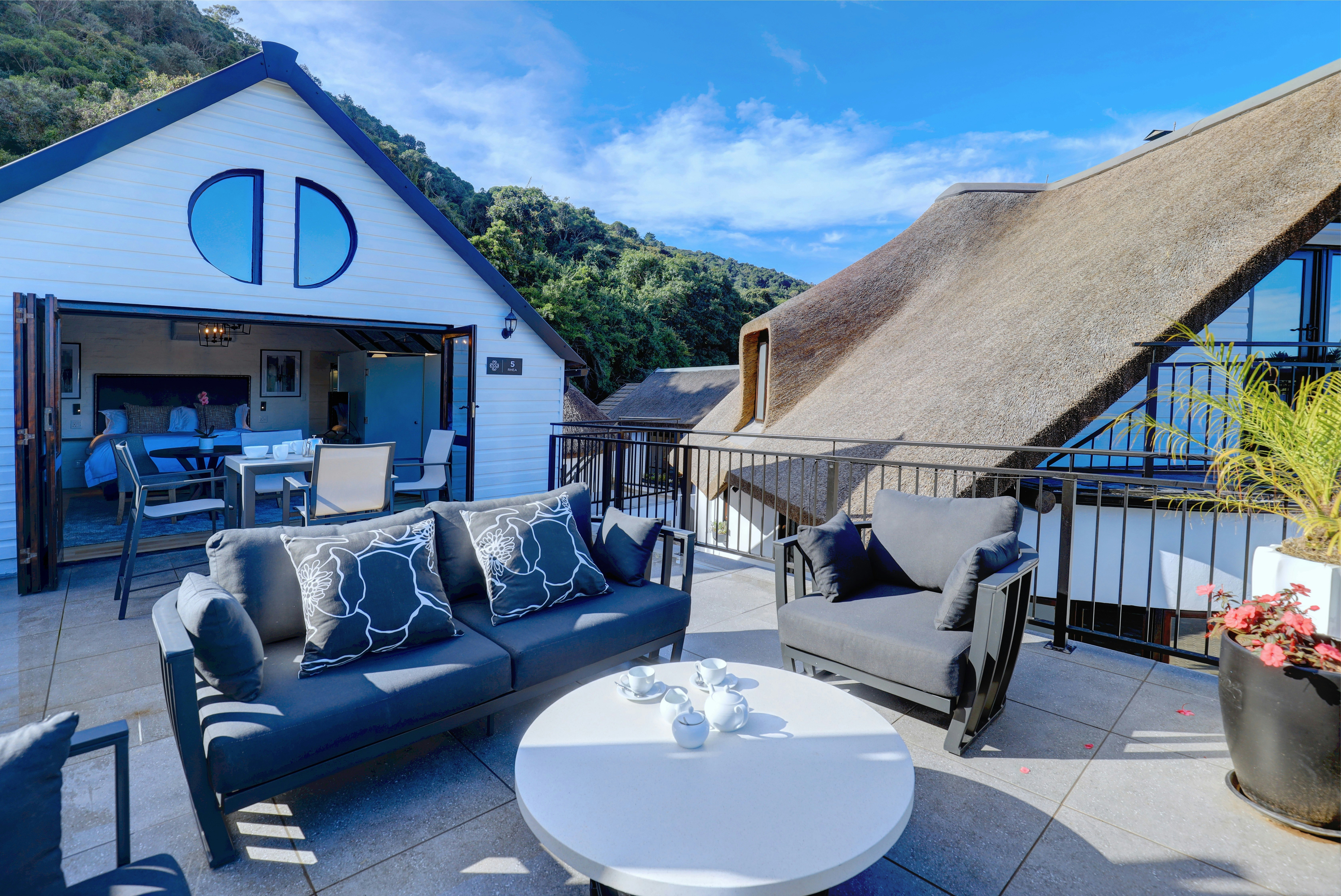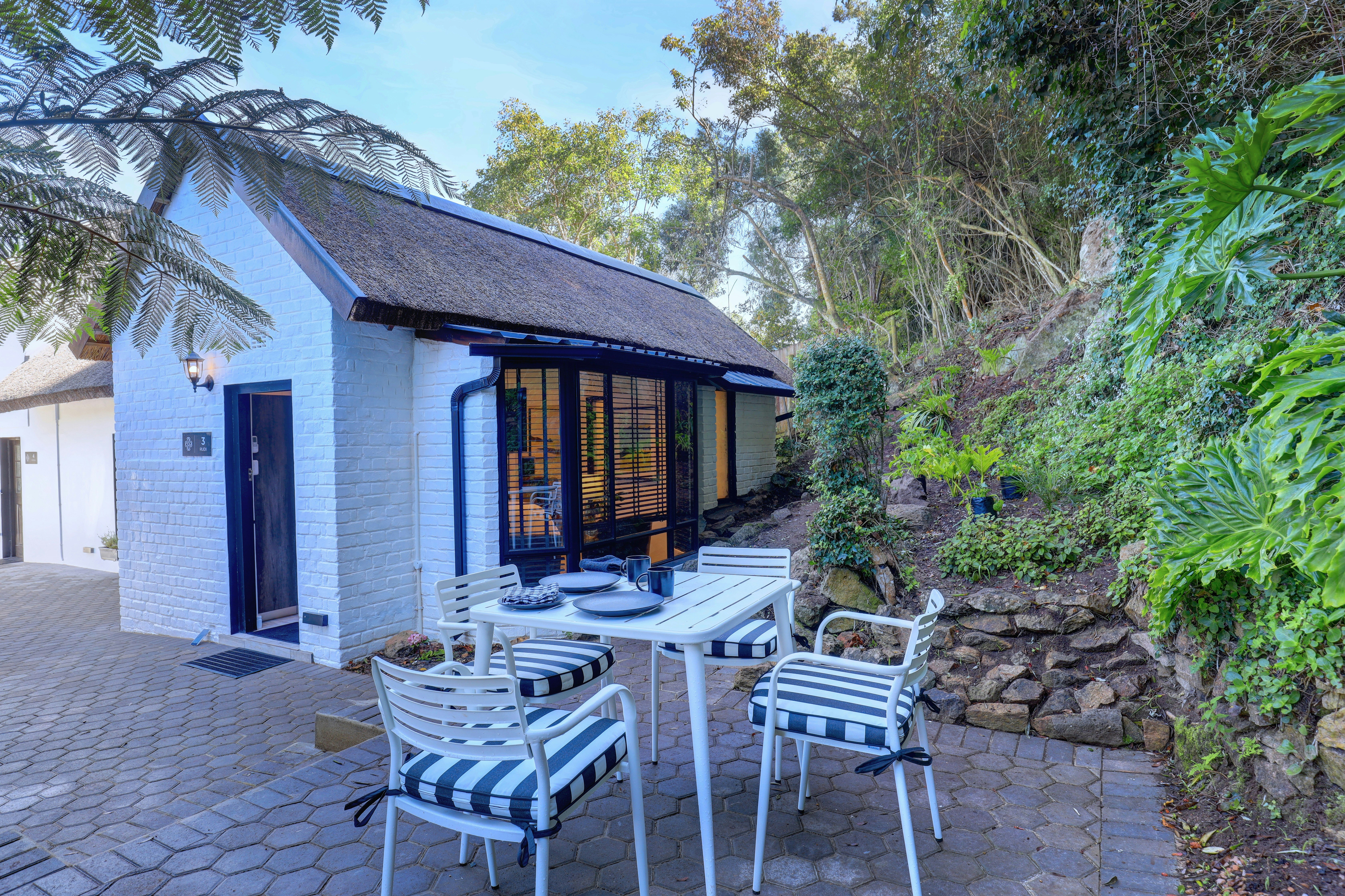 Verder het hierdie kothuise elkeen 'n kombuis wat met 'n induksieplaat, mikrogolfoond, yskassie, eetgerei, breekware en 'n toonbank met stoele toegerus is. Hierdie area het ook 'n spieëltafel en 'n TV met DStv. Gratis WiFi is beskikbaar. Buite elke kothuis is daar 'n privaat stoep met 'n tafel en stoele waar gaste 'n oggendkoffie of 'n buitelug-ete kan geniet.
