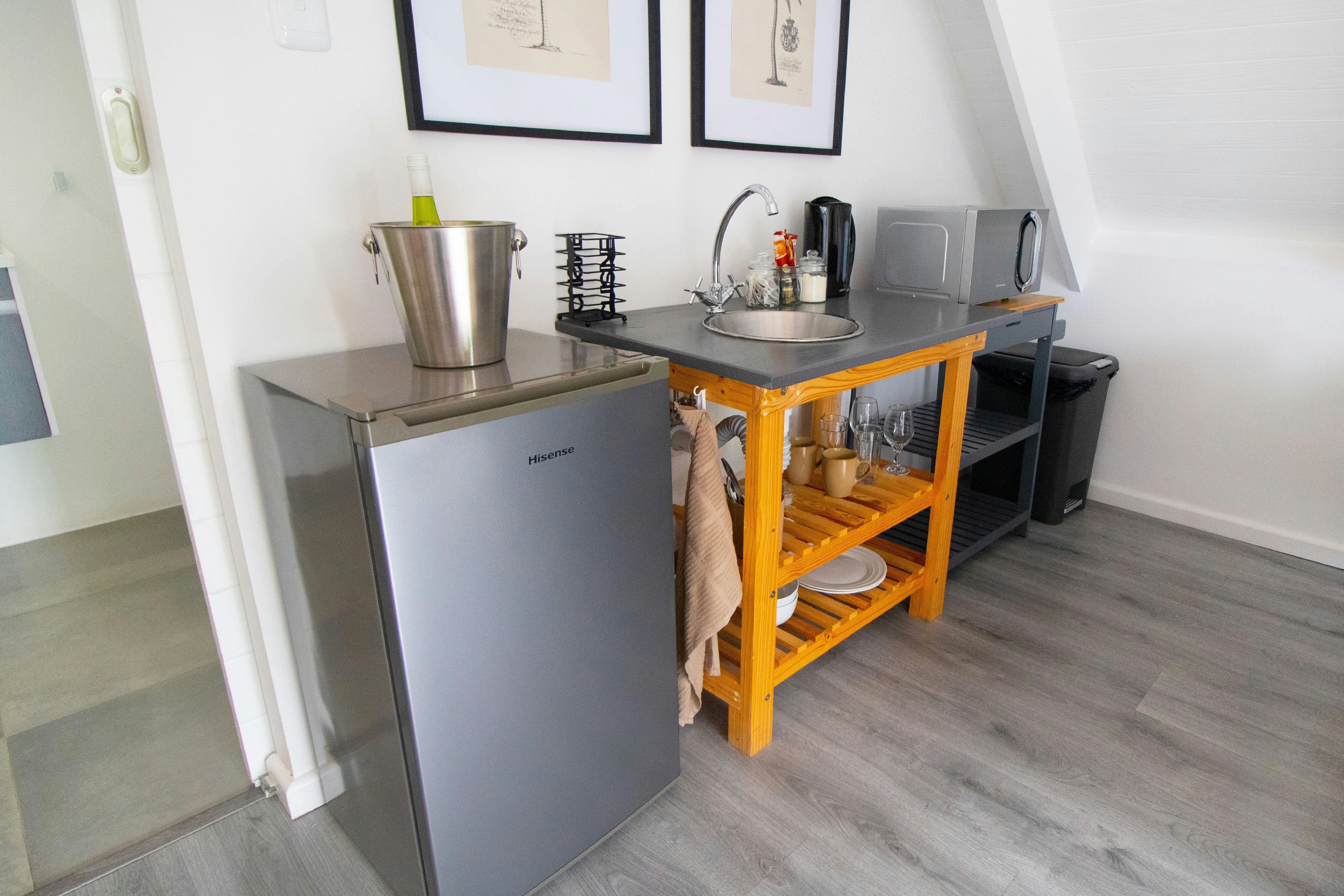 The kitchenette is equipped with a microwave, bar fridge, and tea- and coffee-making facilities. The chic lounge area is furnished with a comfy couch, and for entertainment, a TV and Wi-Fi access are available.