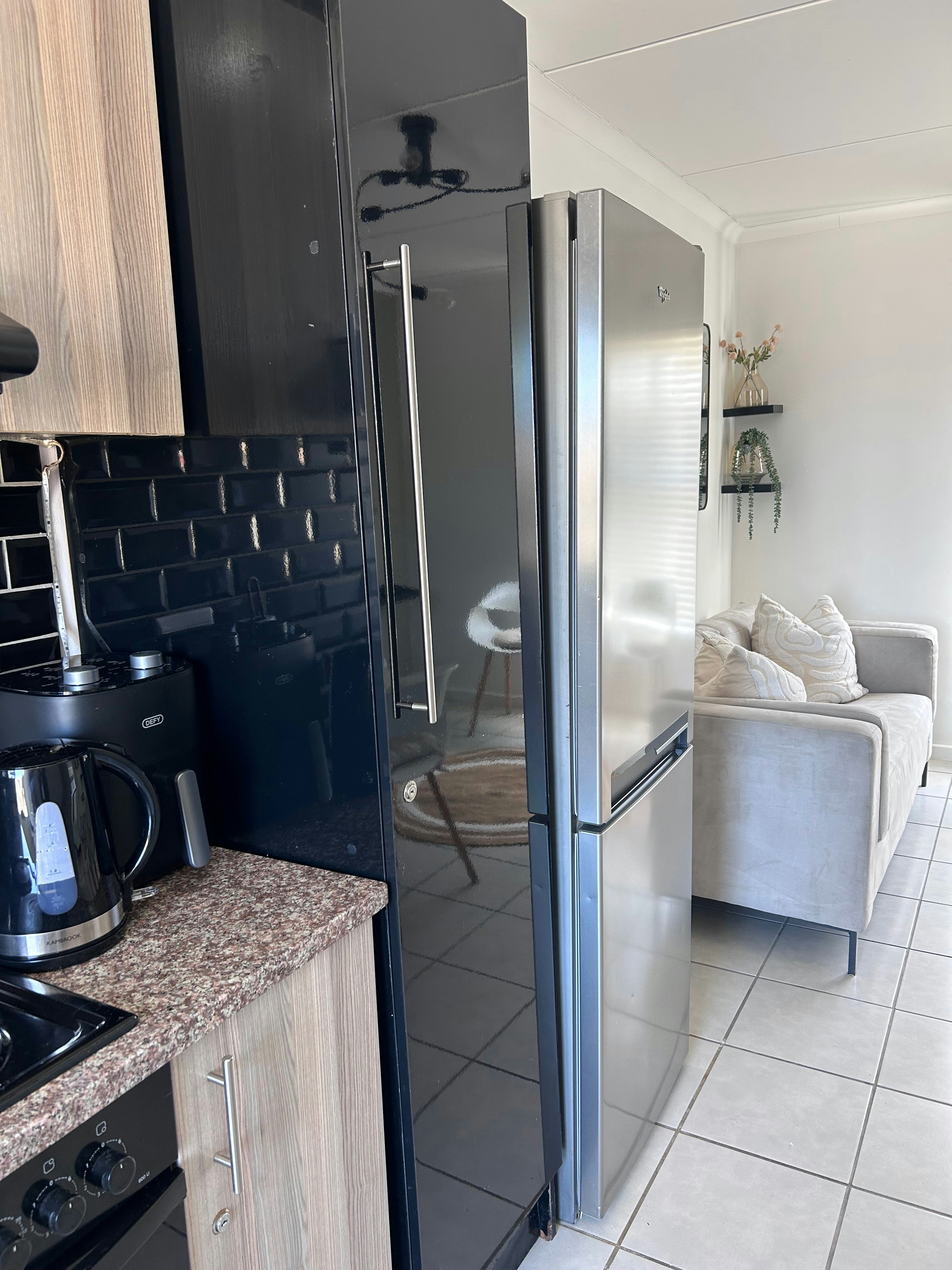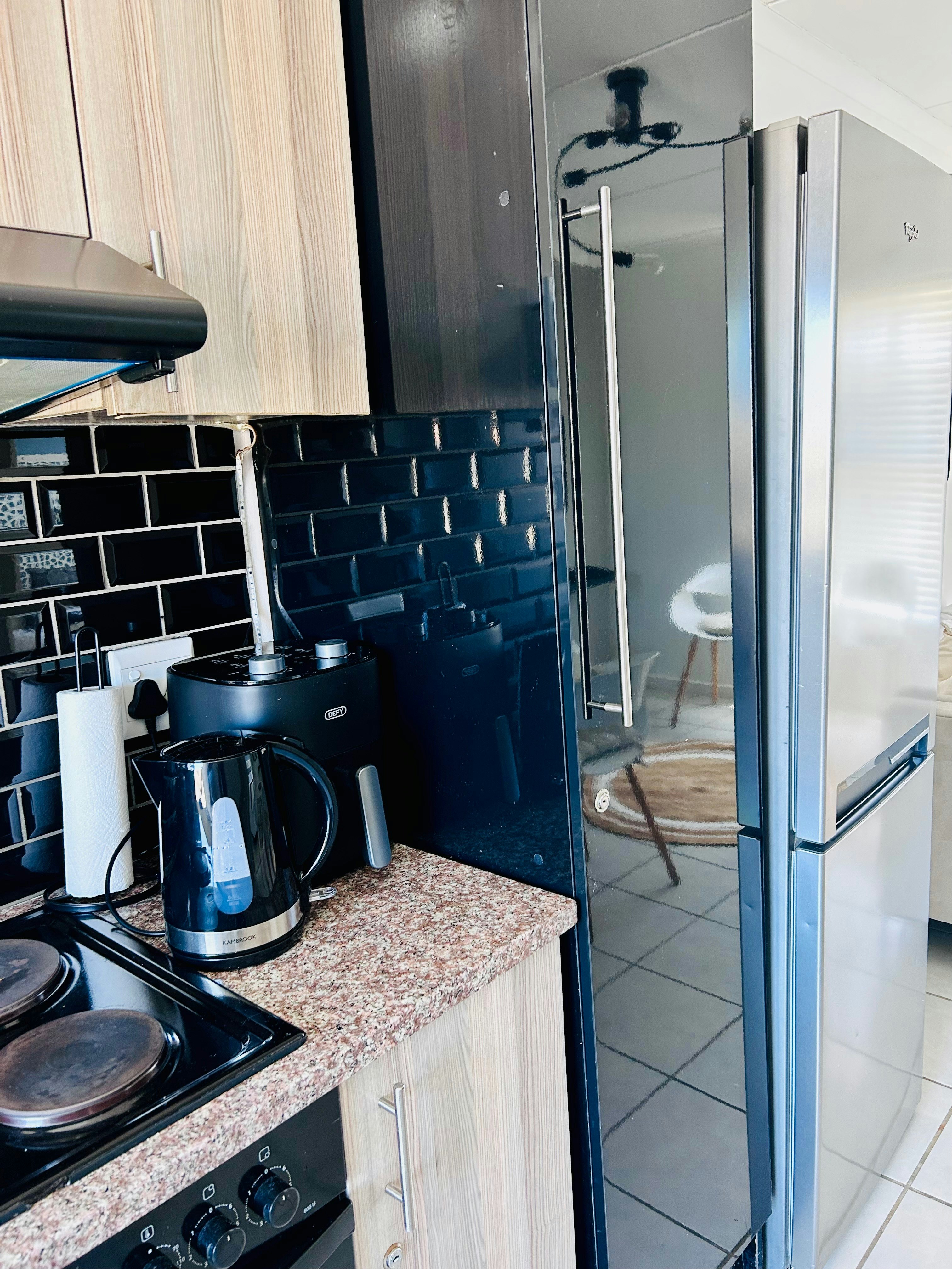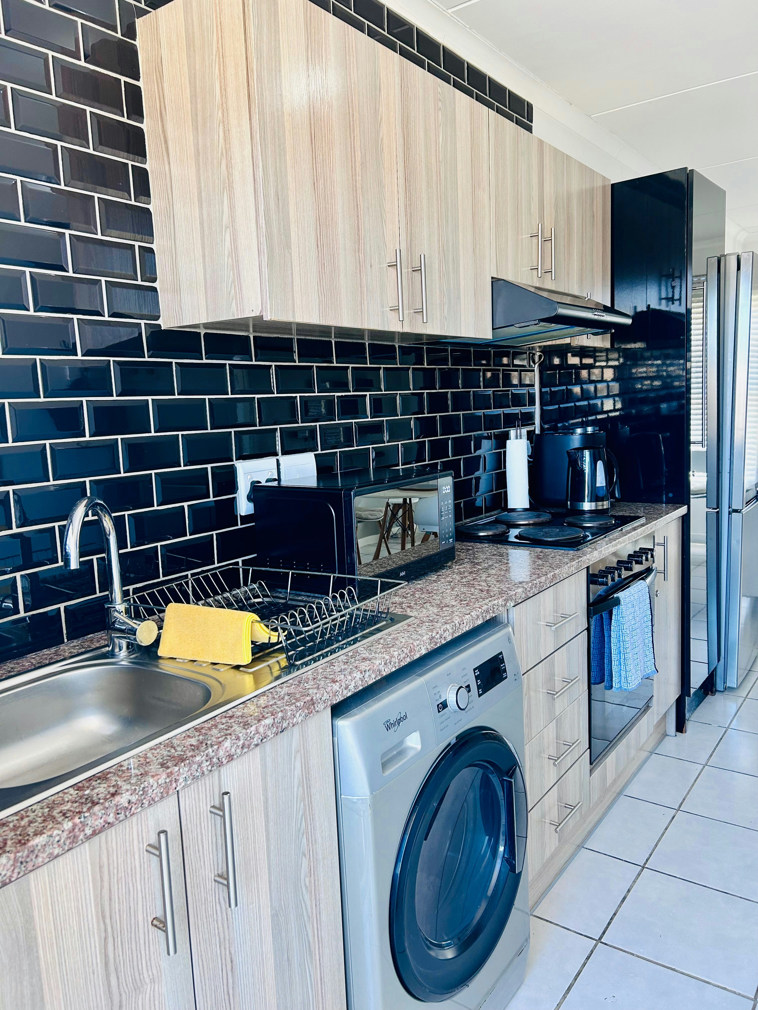 Die oopplan-kombuis is met 'n yskas-vrieskas, stoof, oond, mikrogolf, basiese eetgerei, breekware en tee- en koffiemaakgeriewe toegerus. Daar is ook 'n wasmasjien. Die kombuis lei na die etenstafel met stoele en lei verder na die sitarea met gemaklike sitplek en 'n TV met Netflix. Gratis WiFi is beskikbaar.