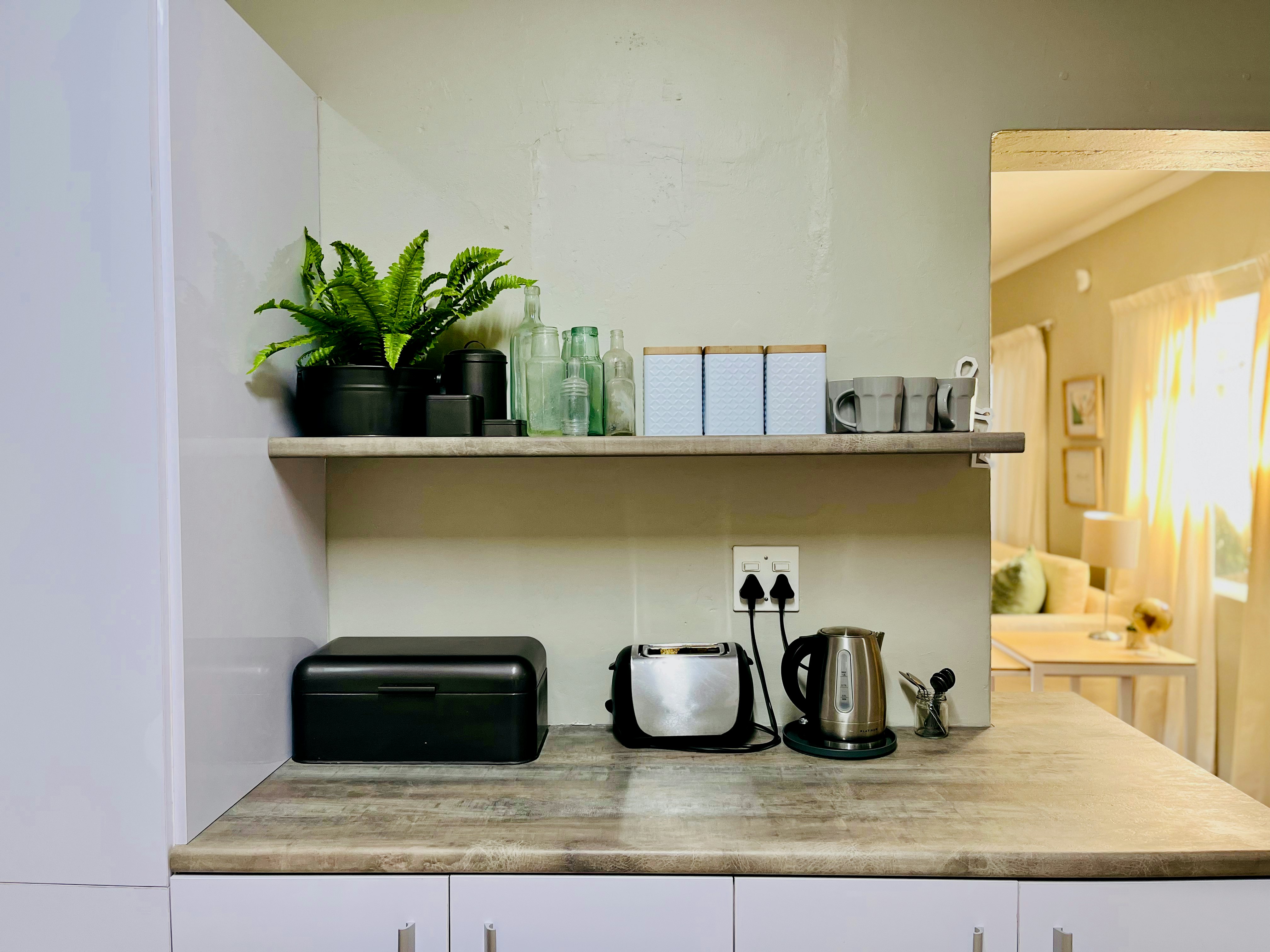 The cottage also comprises an open-plan kitchen, lounge and dining area. The kitchen is well-equipped and features a gas stove, oven, fridge-freezer, kettle, toaster and microwave. The dining area has seating space for 2 people, while the lounge has comfy seating and a TV with selected DStv channels. Wi-Fi access is also available.