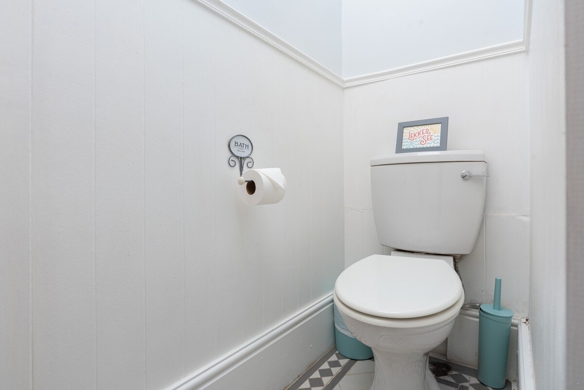 The living area features a kitchen fully equipped with a stove, oven, microwave, fridge-freezer, cutlery, and crockery, as well as a central dining table with chairs perfect for meals. The open-plan lounge is furnished with a comfortable couch as well as a fireplace ideal for the colder nights. A TV with Netflix, along with free Wi-Fi facilities, are available. The house has a Jackery mobile battery to charge devices during load shedding, as well as a UPS to keep the Wi-Fi connected.