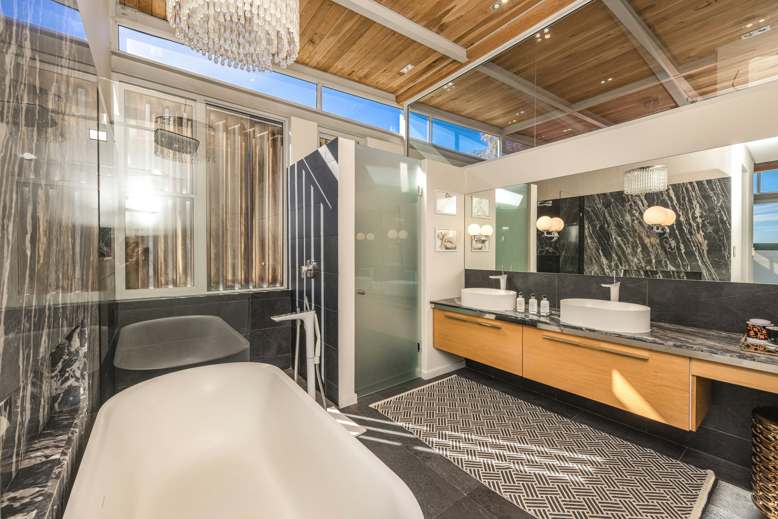 This house has a sleeping capacity of 10 guests and comprises 5 tastefully furnished bedrooms, 5 bathrooms, and an open-plan kitchen and living room area. The main and second bedrooms are each furnished with a king-size bed and have an en-suite bathroom fitted with a bath, shower, basin, and toilet. The third bedroom has a king-size bed and an en-suite bathroom with a shower. The fourth bedroom is furnished with a king-size bed and an en-suite bathroom fitted with a shower-over-bath, basin, and toilet. The fifth bedroom is also furnished with a king-size bed and can make use of the guest's bathroom fitted with a bath, basin, and toilet. Crisp linen and towels are provided.