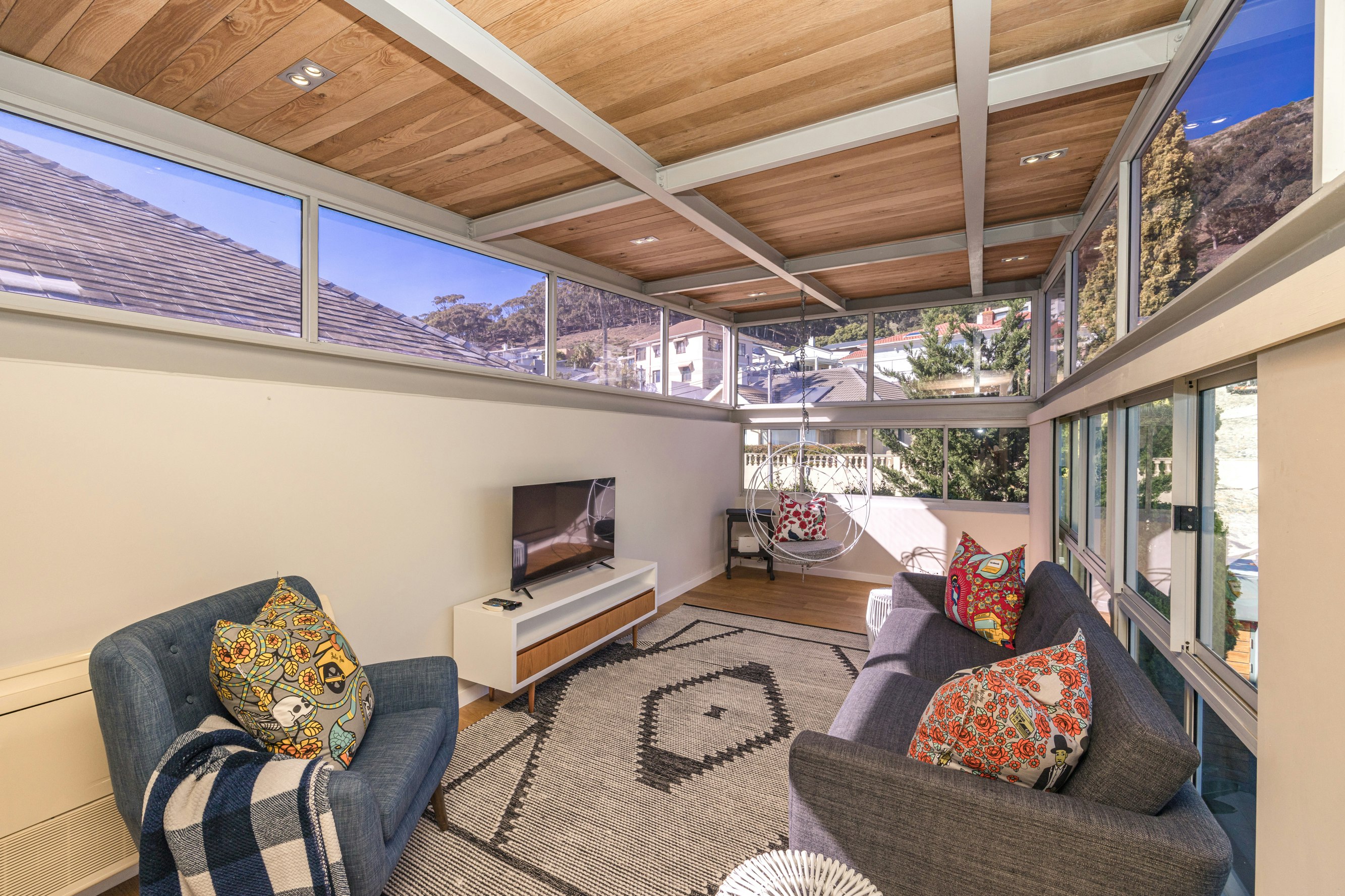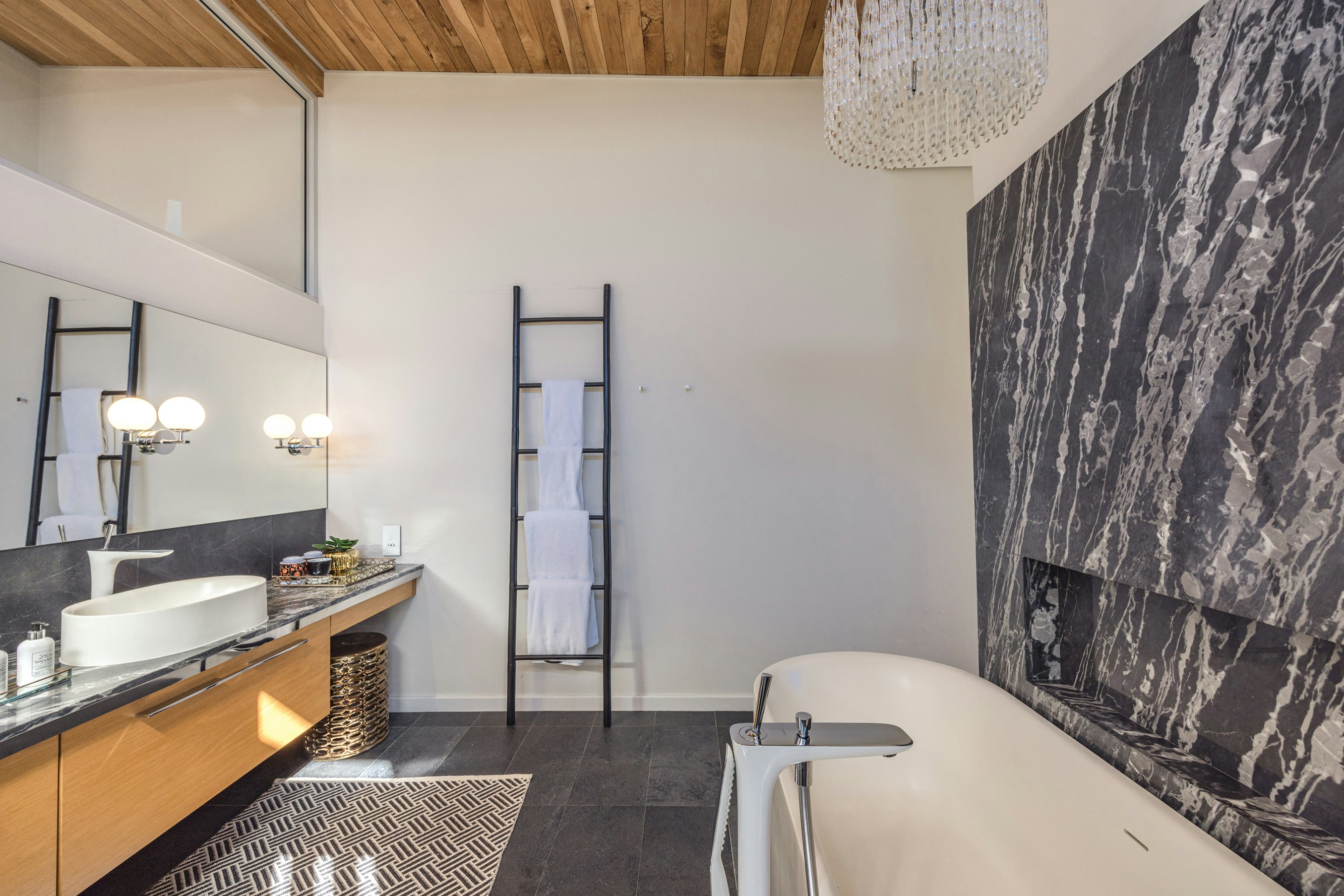 The modernly designed open-plan kitchen is fully equipped for self-catering with a fridge-freezer, gas stove, oven, microwave, cutlery, crockery, and tea- and coffee-making facilities. It leads out to an 8-seater dining table and boasts a beautiful view. The adjacent living room area is furnished with comfortable couches and a TV. Free Wi-Fi is available throughout the house. Upstairs, is a lounge room that can accommodate guests who wish to get some work done as there is a working station, with comfy couches, a swing chair, and a TV.