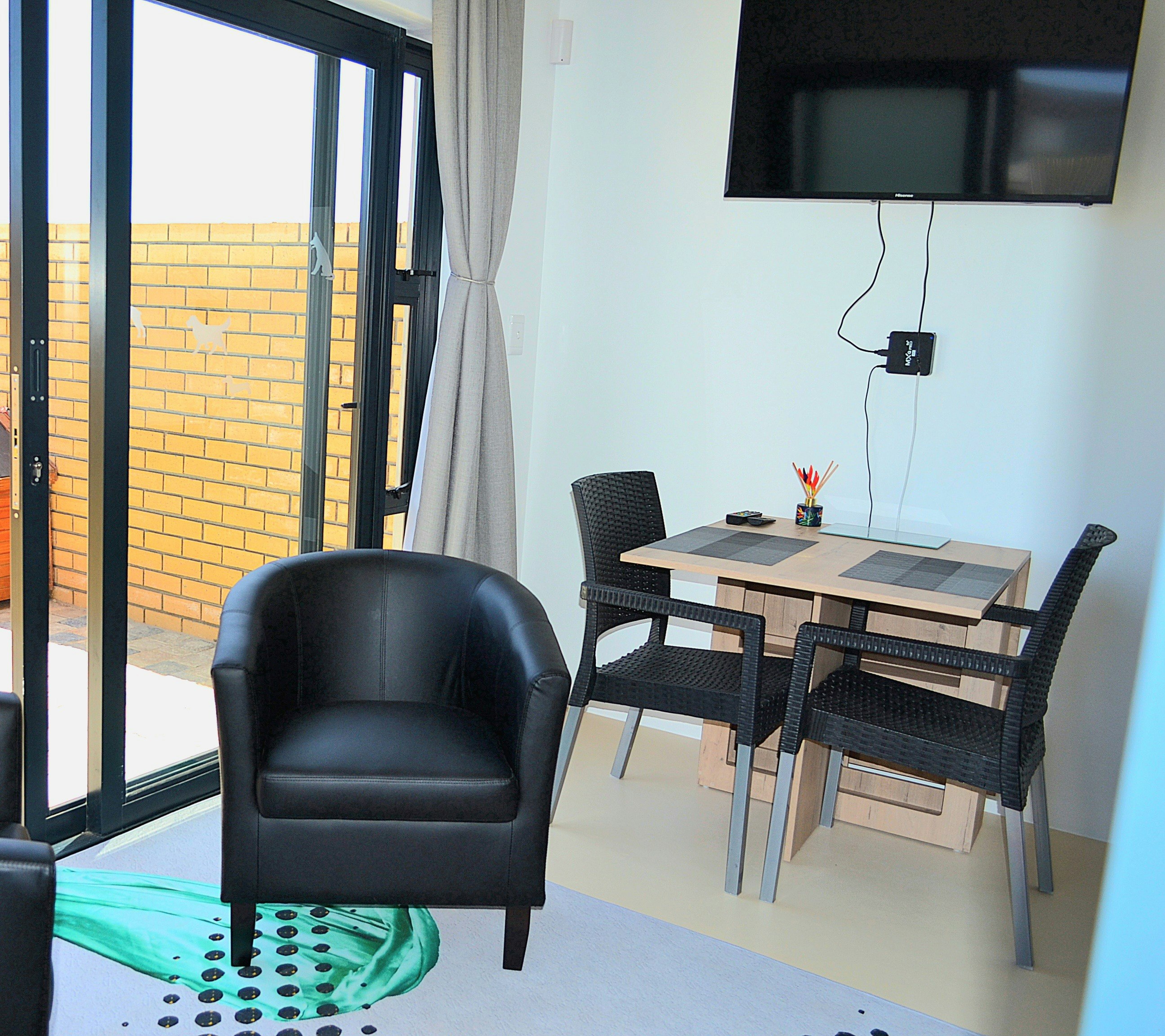 Die kombuisie is met 'n yskas-vrieskas, tweeplaatgasstoof, mikrogolf, en koffie- en teemaakgeriewe toegerus. Die leefarea het 'n TV met stroomdienste, etenstafel en 'n binnebraai. Die woonstel het ook 'n privaat binnehof wat vir troeteldiere geskik is en veilige parkeerplek. Verder is daar sonkrag sodat gaste se verblyf nie deur kragonderbrekings geaffekteer word nie.