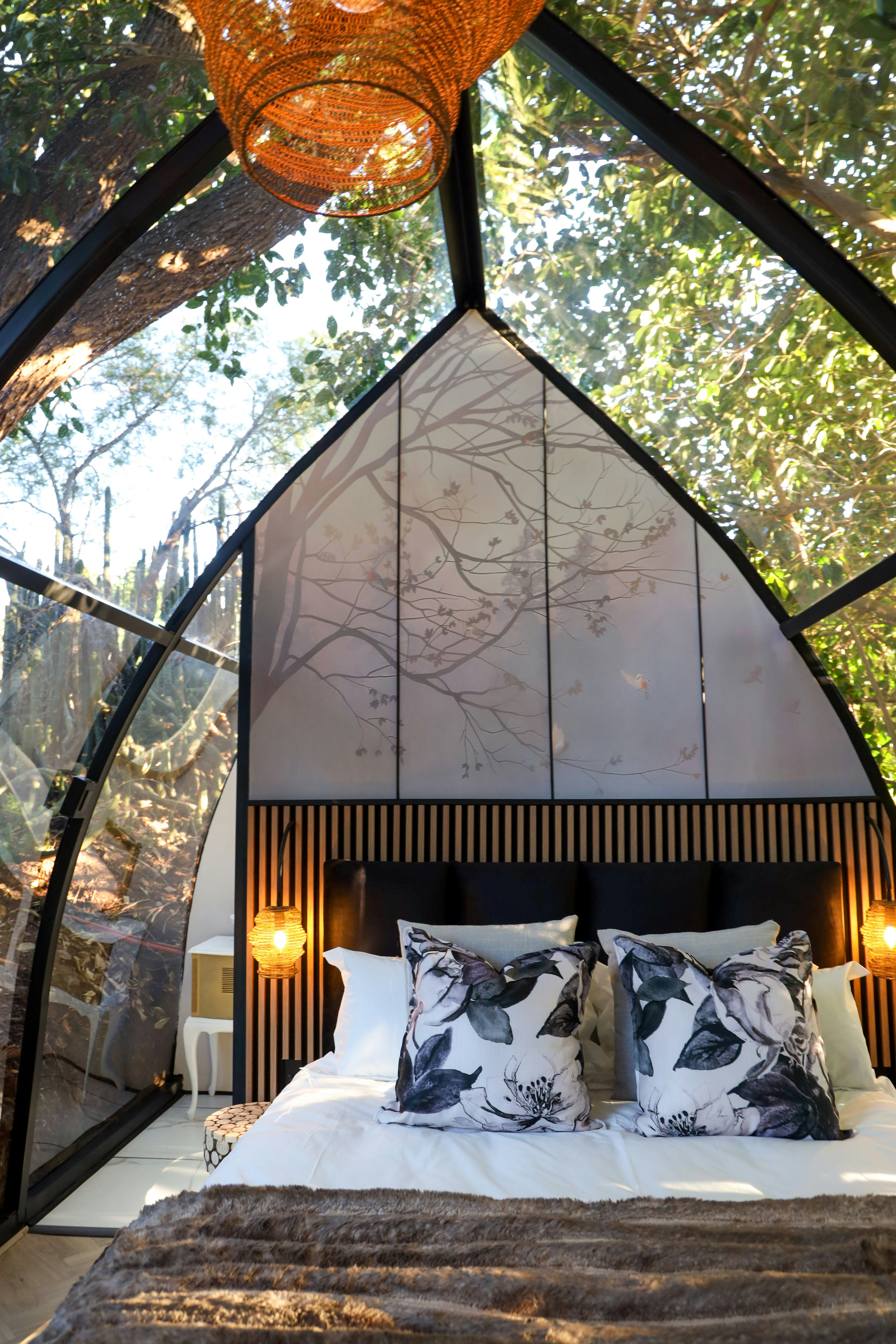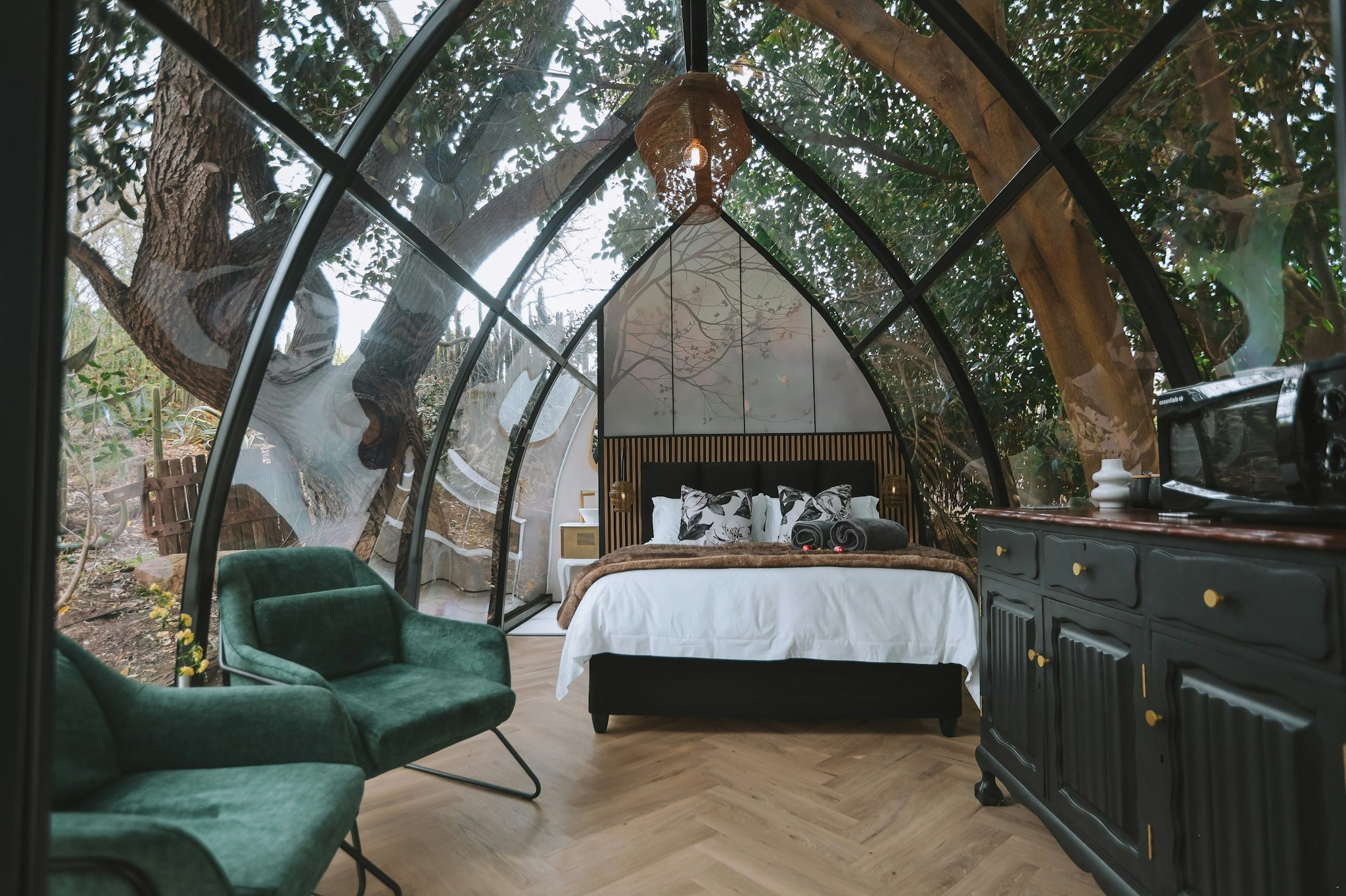 Binne is die ruimte warm en uitnodigend, met stylvolle, knus meubels omring deur deursigtige mure wat die binnekant naatloos met die natuurlike omgewing vermeng. Ten spyte van hierdie oopheid, voel die eenheid steeds privaat en intiem. Die koepel bied slaapplek vir 2 gaste en is smaakvol gemeubileer met 'n koningingrootte bed. Gaste kan wakker word met die geluid van voëlgesang en oggendlig wat deur die bome filter - alles sigbaar vanuit die gemak van die bed. Vars linne en handdoeke word voorsien vir u gerief.
