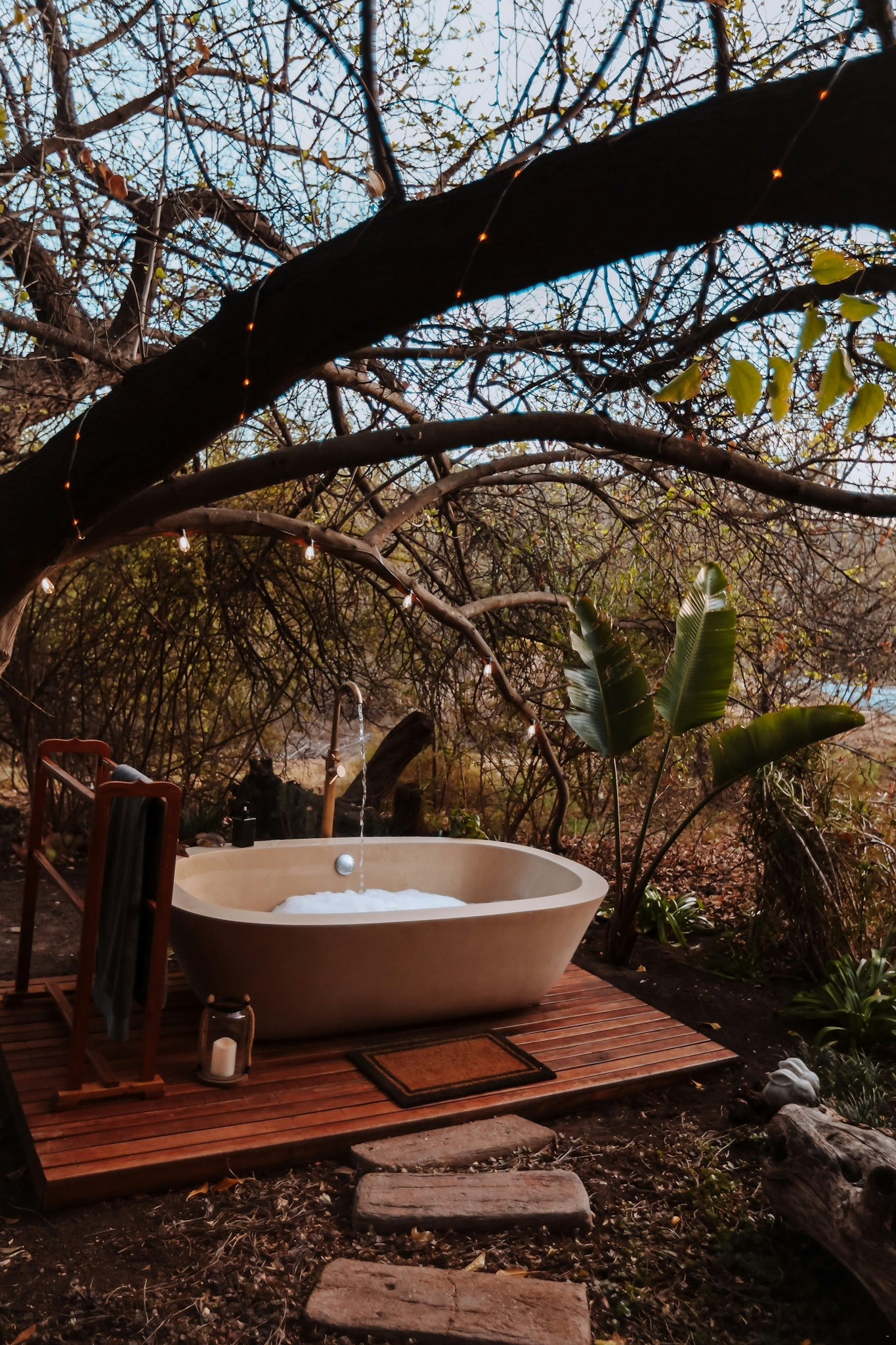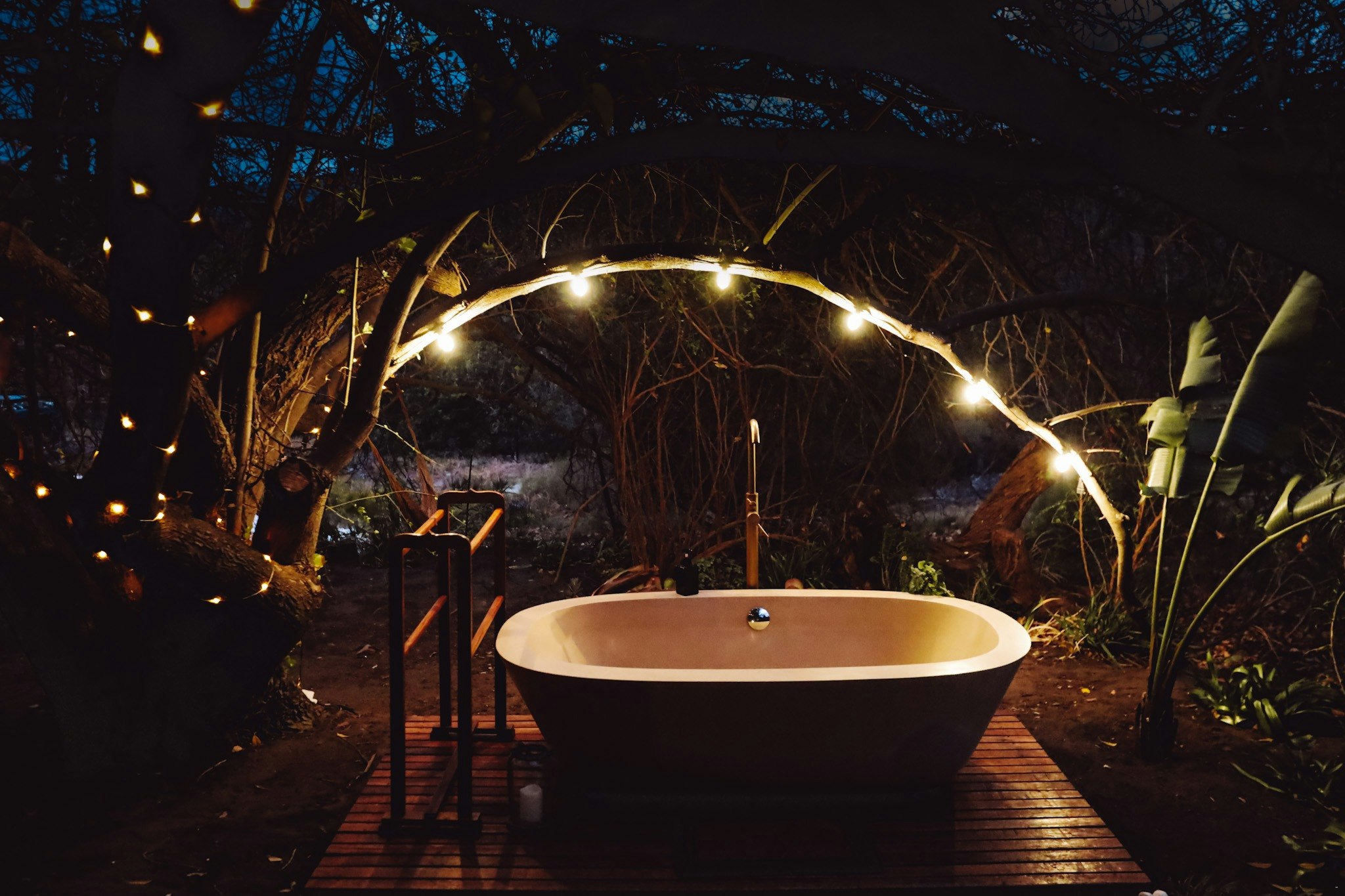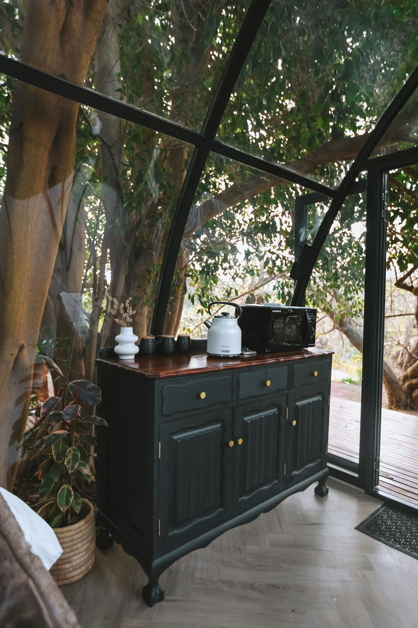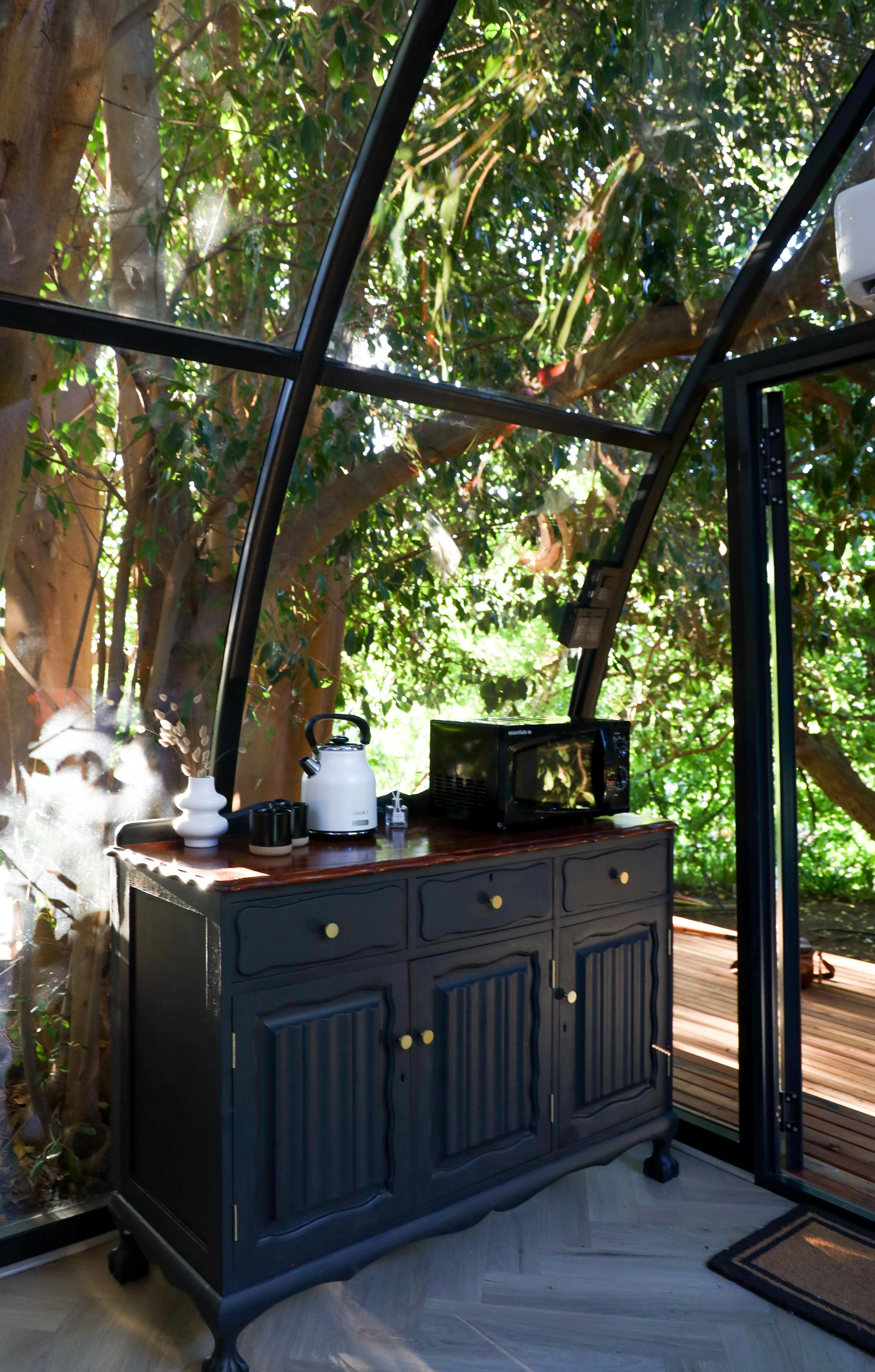Die eenheid beskik oor 'n goed toegeruste kombuisie met 'n mikrogolfoond, mini-yskas en tee- en koffiemaakgeriewe, sowel as 'n klein, gemaklike sitarea. Die badkamer is geïntegreer in die glaskajuit en sluit 'n stort, wasbak en toilet in met uitsigte oor die omliggende landskap, terwyl dit steeds 'n gevoel van privaatheid bied. 'n Aparte buitebad onder feetjieliggies bied die perfekte plek om na sonsondergang te ontspan en 'n romantiese einde aan die dag te bring.