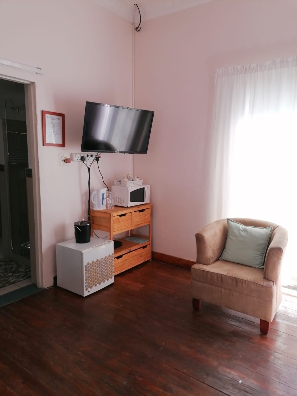 The room also features a TV with DStv, air-conditioning, and an alarm system for added security. Free Wi-Fi is available. There is a bar fridge and tea- and coffee-making facilities available for guests' use.