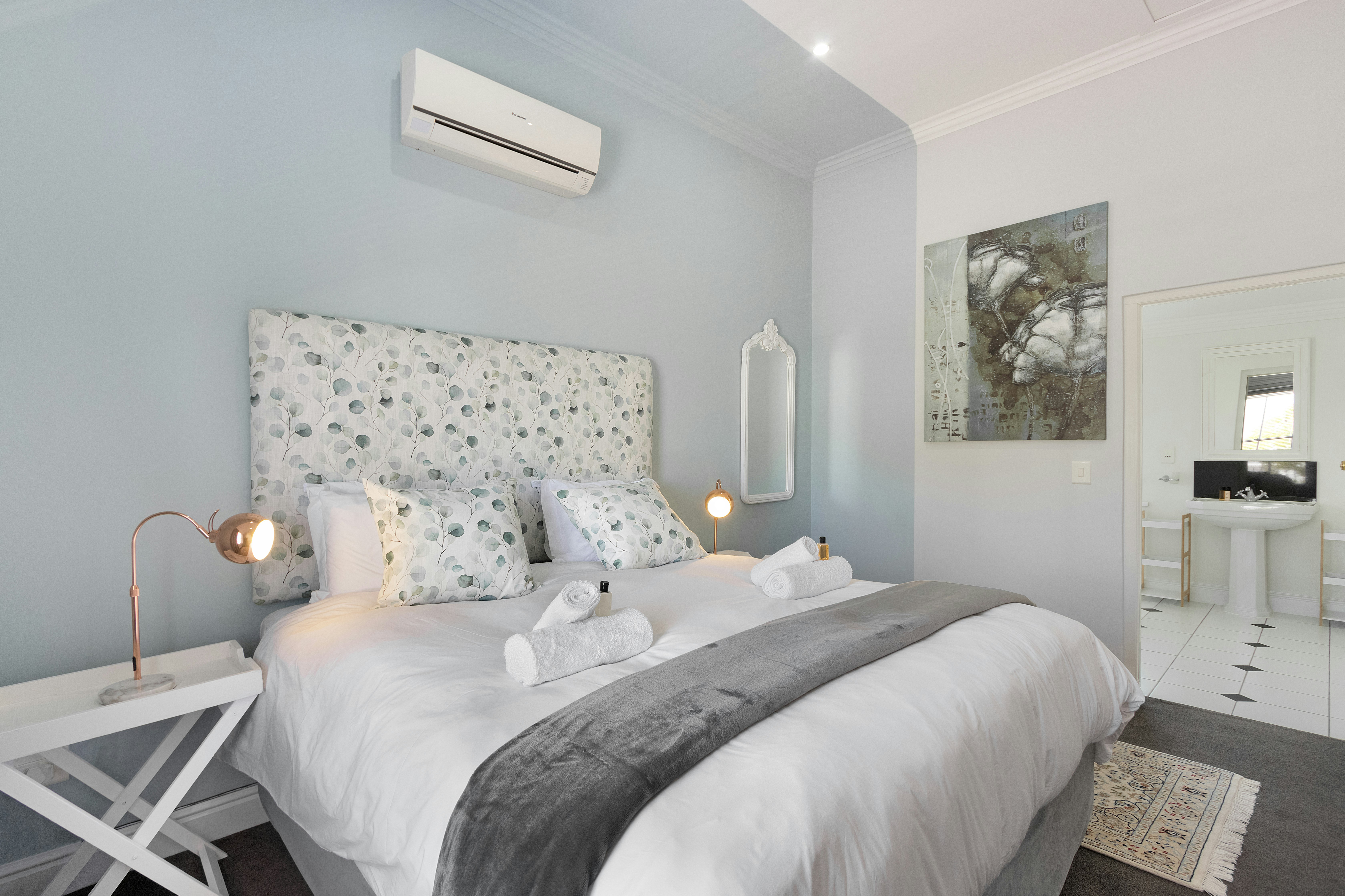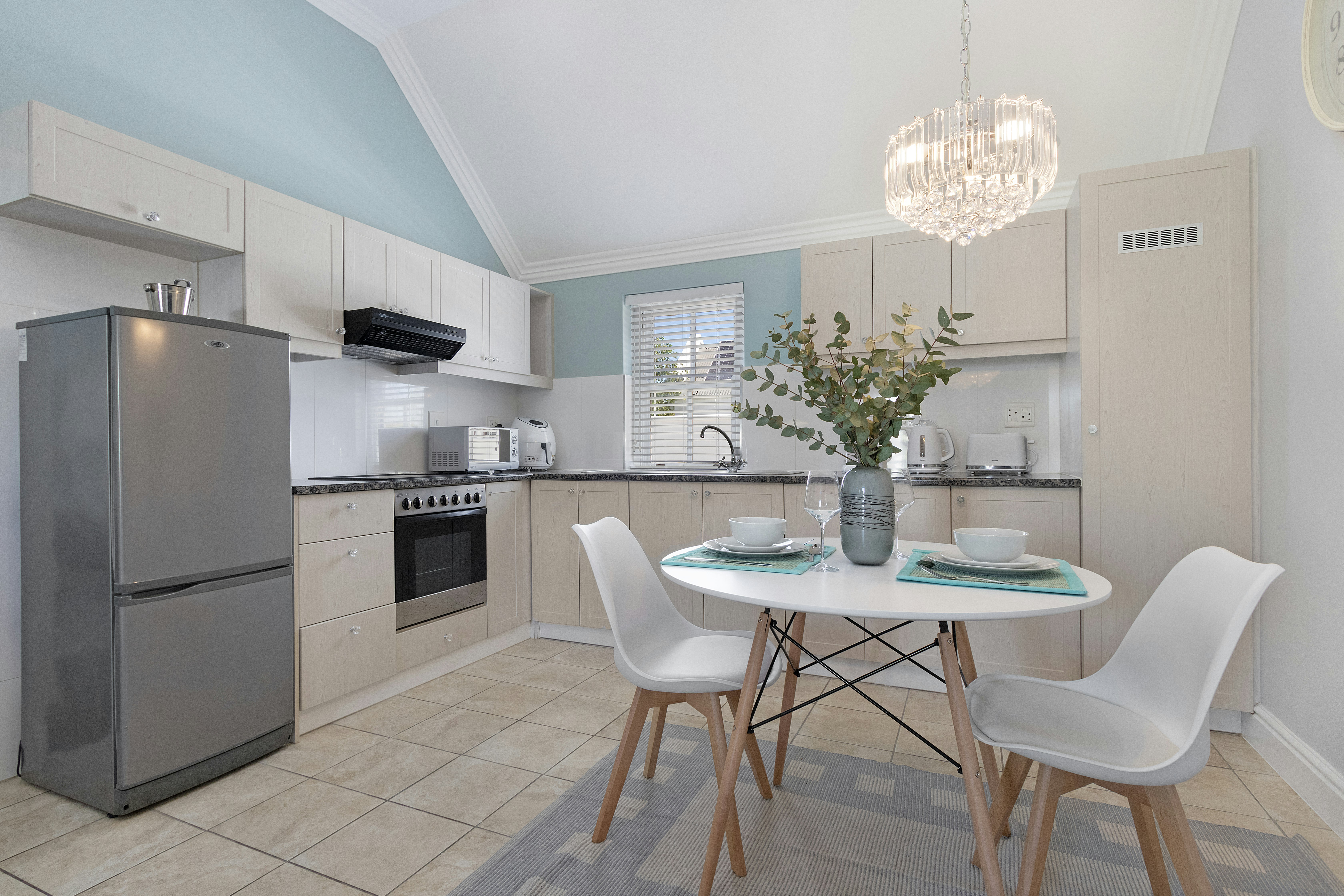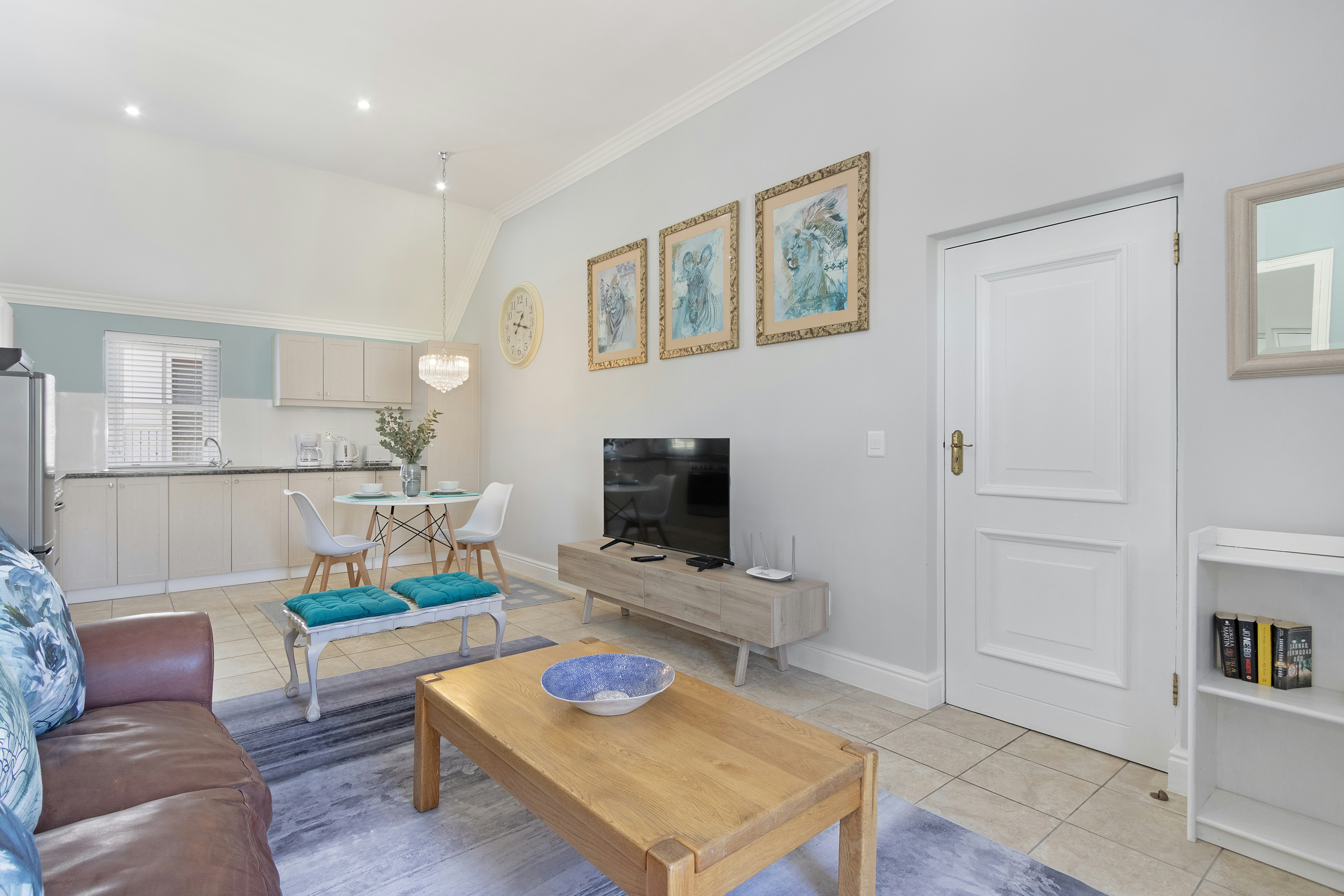 The open-plan main living area features a kitchen and a lounge with comfortable seating as well as a TV with a full selection of DStv channels. Access to free Wi-Fi is available. The kitchen is fully equipped with a stove, oven, microwave, fridge-freezer, coffee machine, cutlery and crockery as well as a 4-seater breakfast bar where guests can enjoy their meals together.