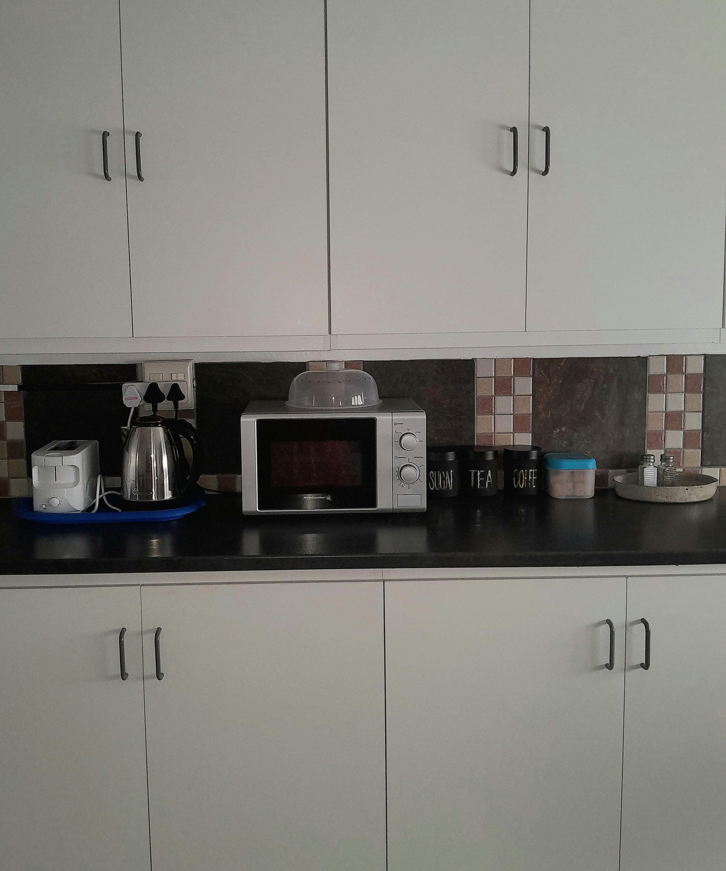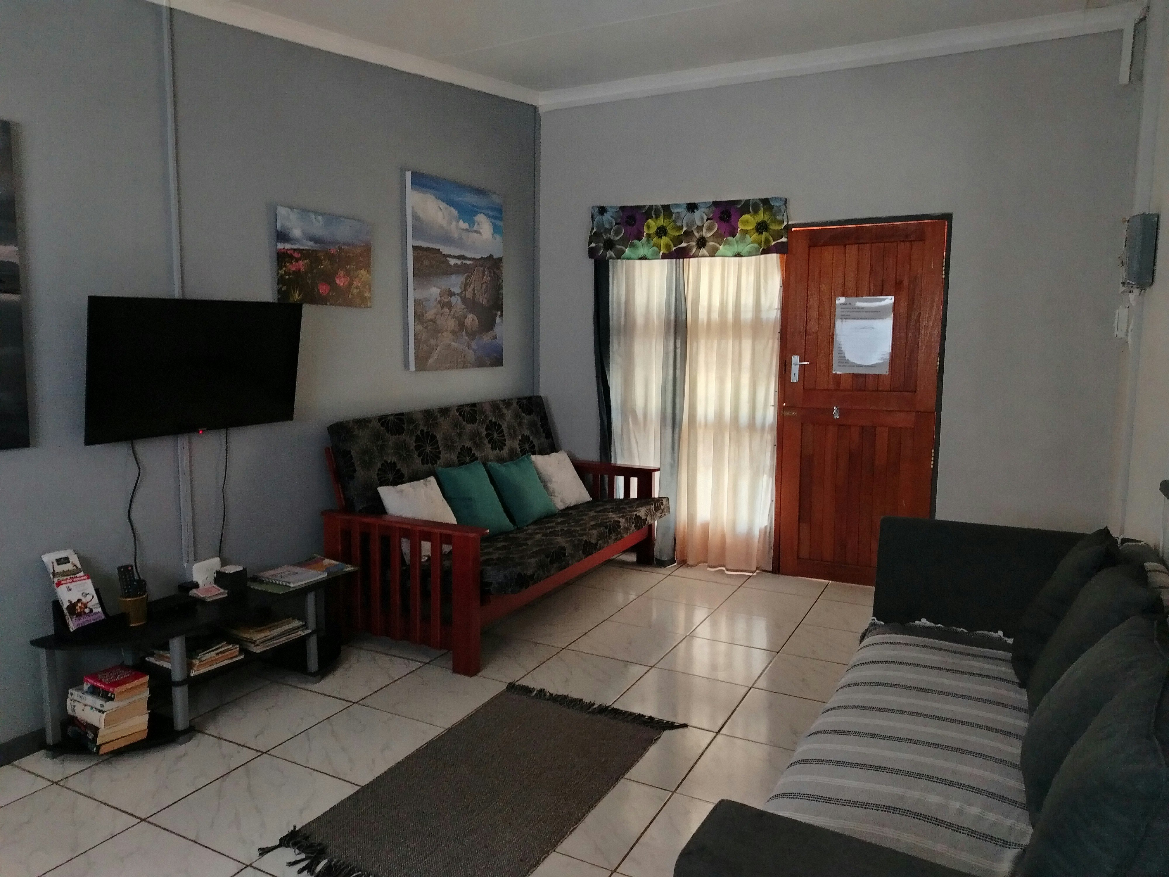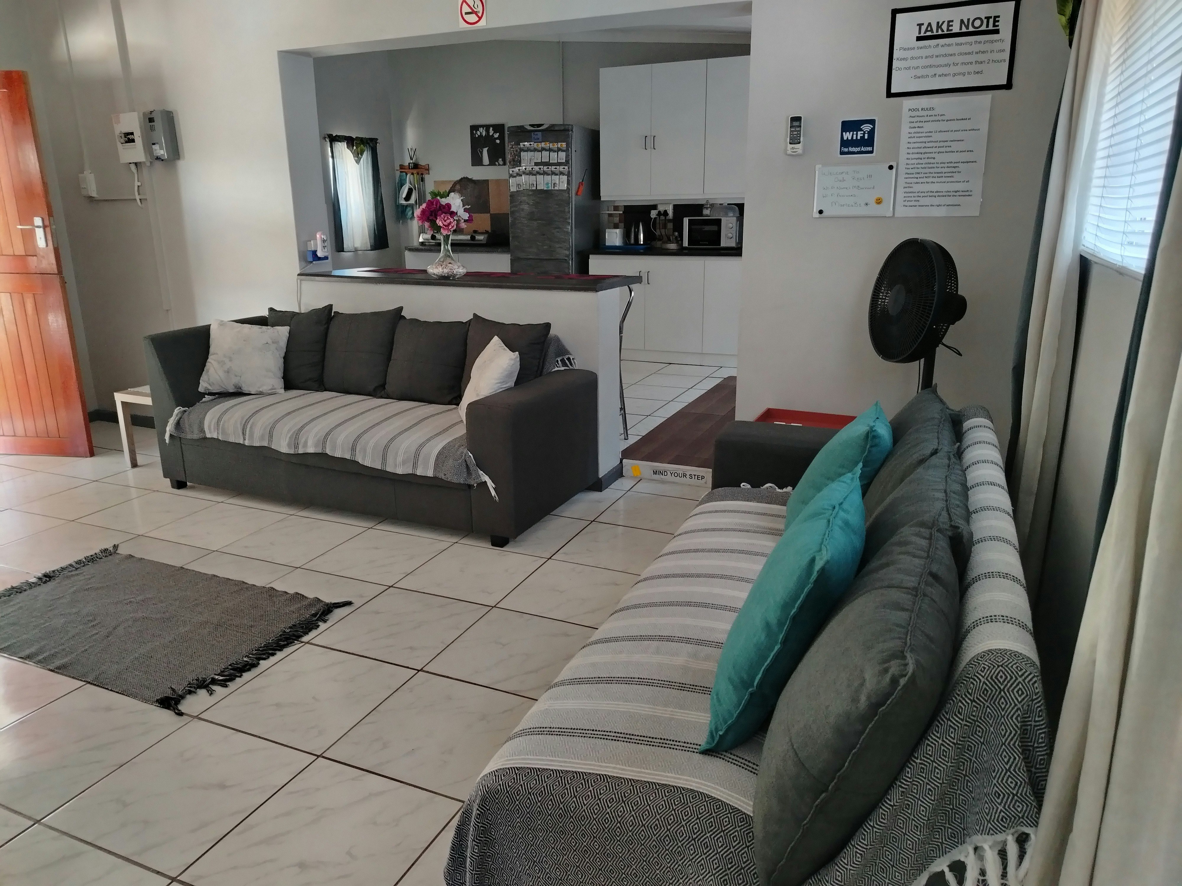 The open-plan living area features a kitchen equipped with a 2-plate stove, microwave, fridge-freezer, cutlery and crockery as well as a breakfast bar with stools. There is a washing machine and a drying rack for clothes. Washing powder is provided. The kitchen leads to a sitting area with two couches and a sofa bed. A TV with limited DStv channels and free Wi-Fi is also available.