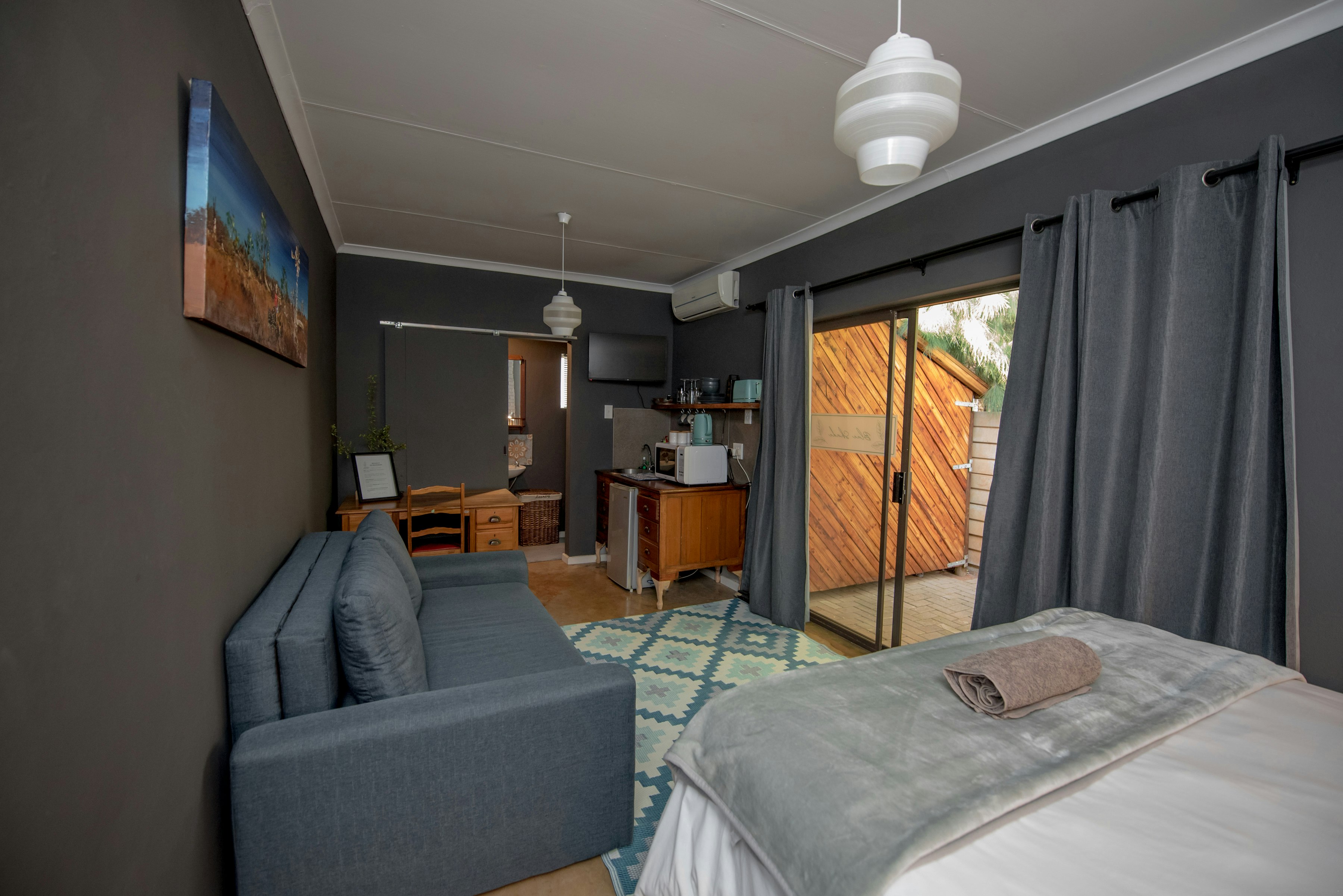 Blue Shade bied verblyf vir 3 gaste en bevat 'n koningingrootte-bed en 'n gemaklike dagbed. Die badkamer is toegerus met 'n stort, wasbak en toilet. Gaste het toegang tot 'n kombuisie, yskas, tee- en koffiemaakgeriewe, lugversorging, 'n TV en gratis WiFi.