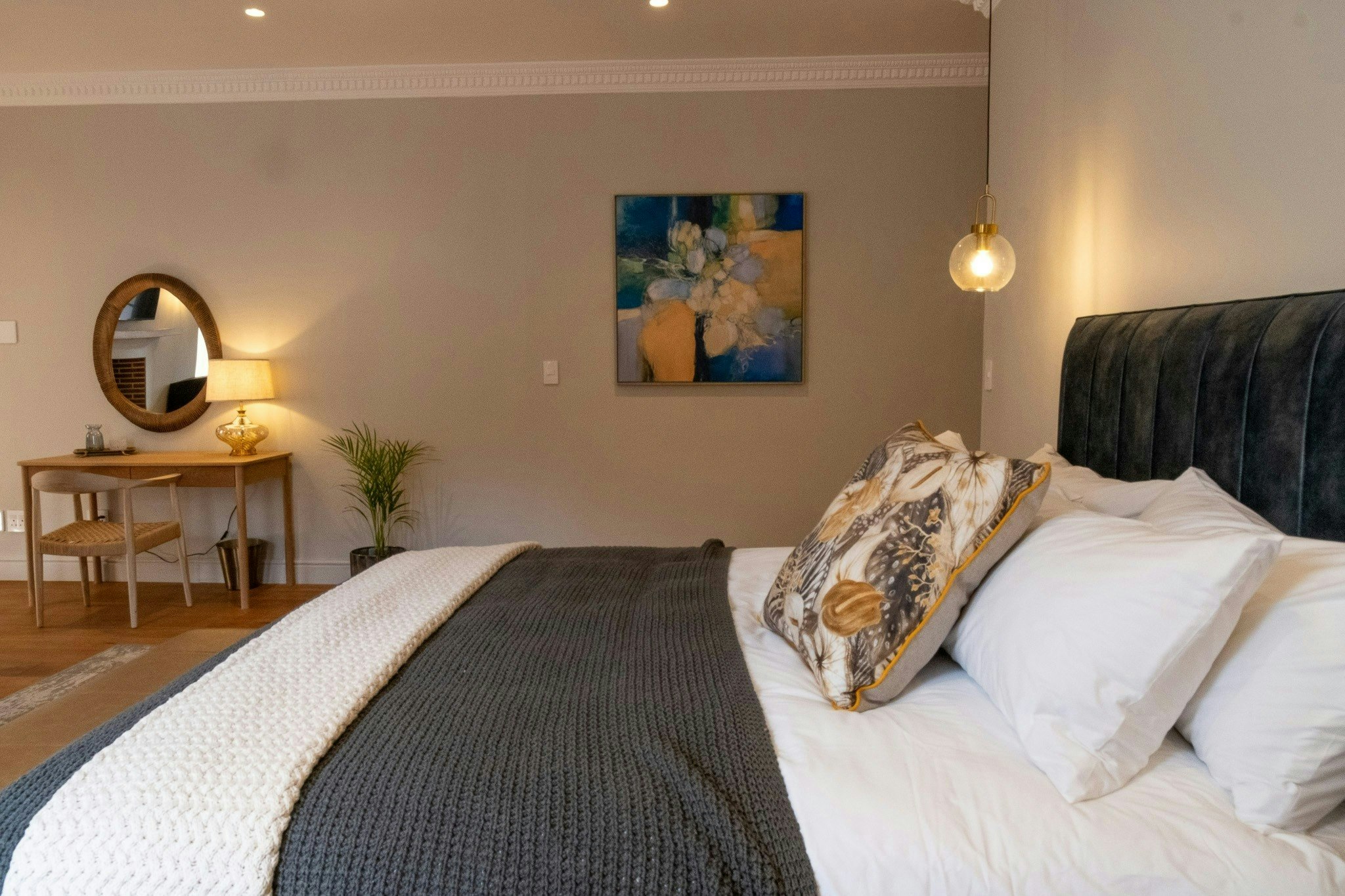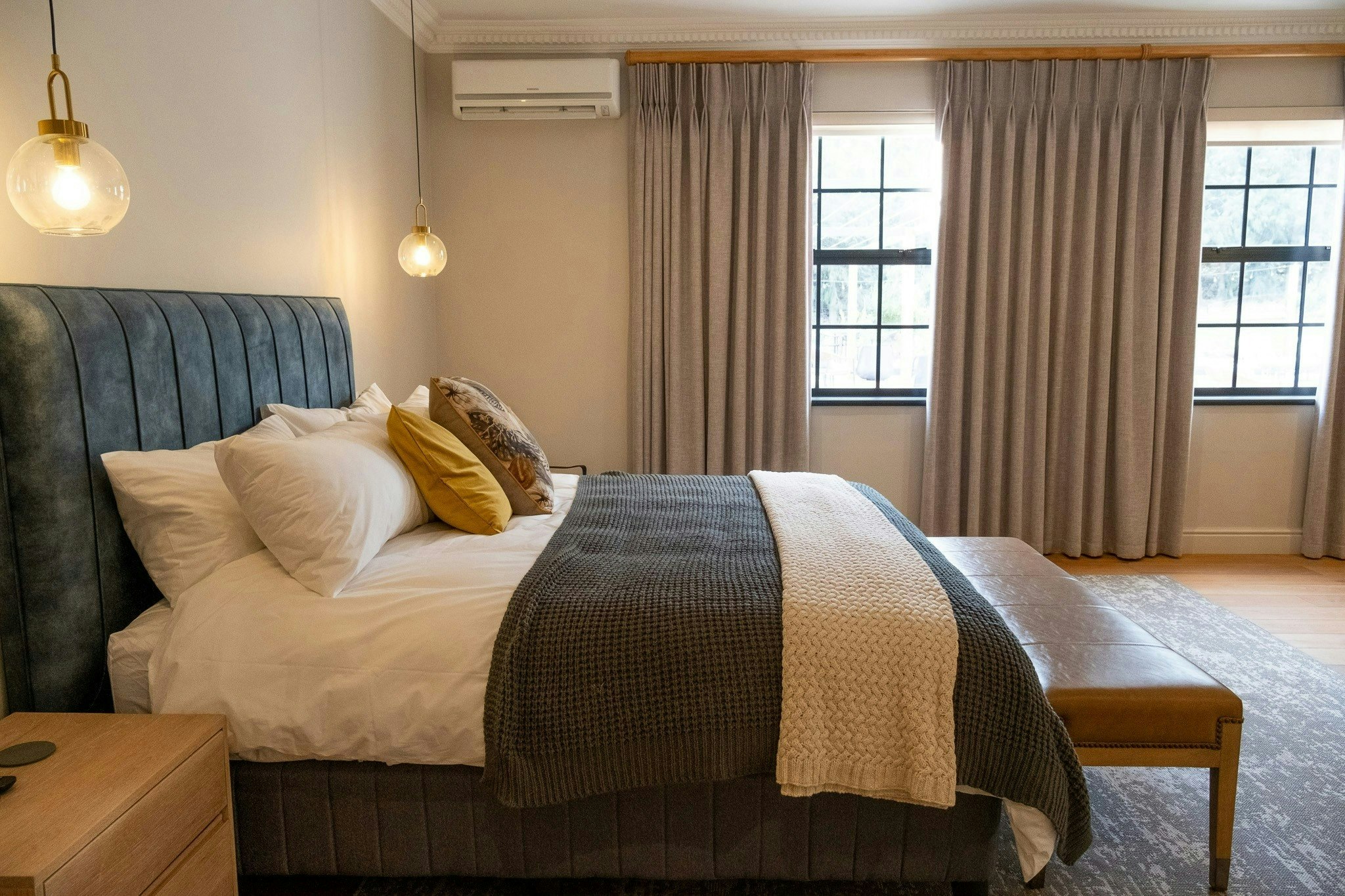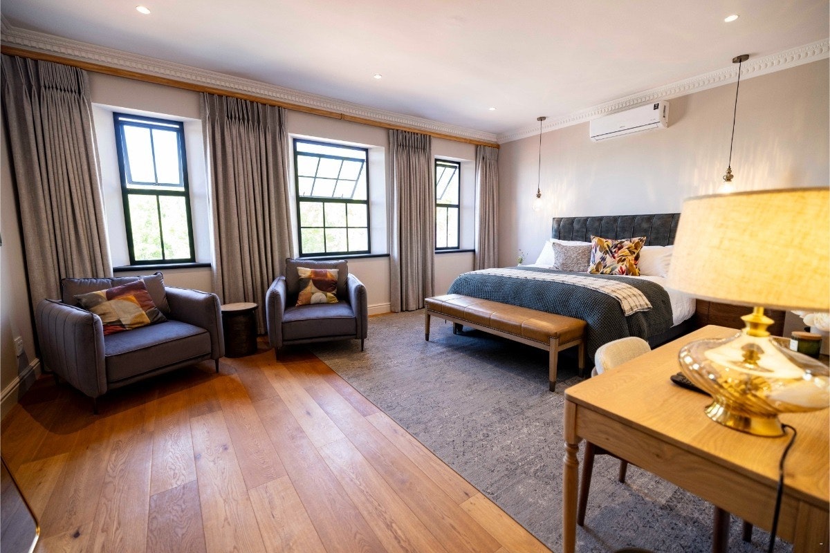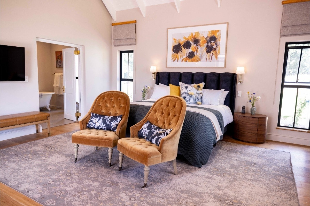 Die eiendom bied 6 individueel ingerigte luukse kamers, elk gemeubileer met 2 enkelbeddens wat in 'n koninggrootte-bed omskep kan word, met en suite-badkamers met 'n bad, stort, wasbak en toilet. Vars linne en handdoeke word voorsien. Twee is in die hoofgebou gehuisves, terwyl vier effens uitmekaar is, omring deur rustige natuurskoon. Elke kamer is ontwerp vir ruim gemak en stil verwennerij, wat 'n toevlugsoord vir rus en besinning bied.