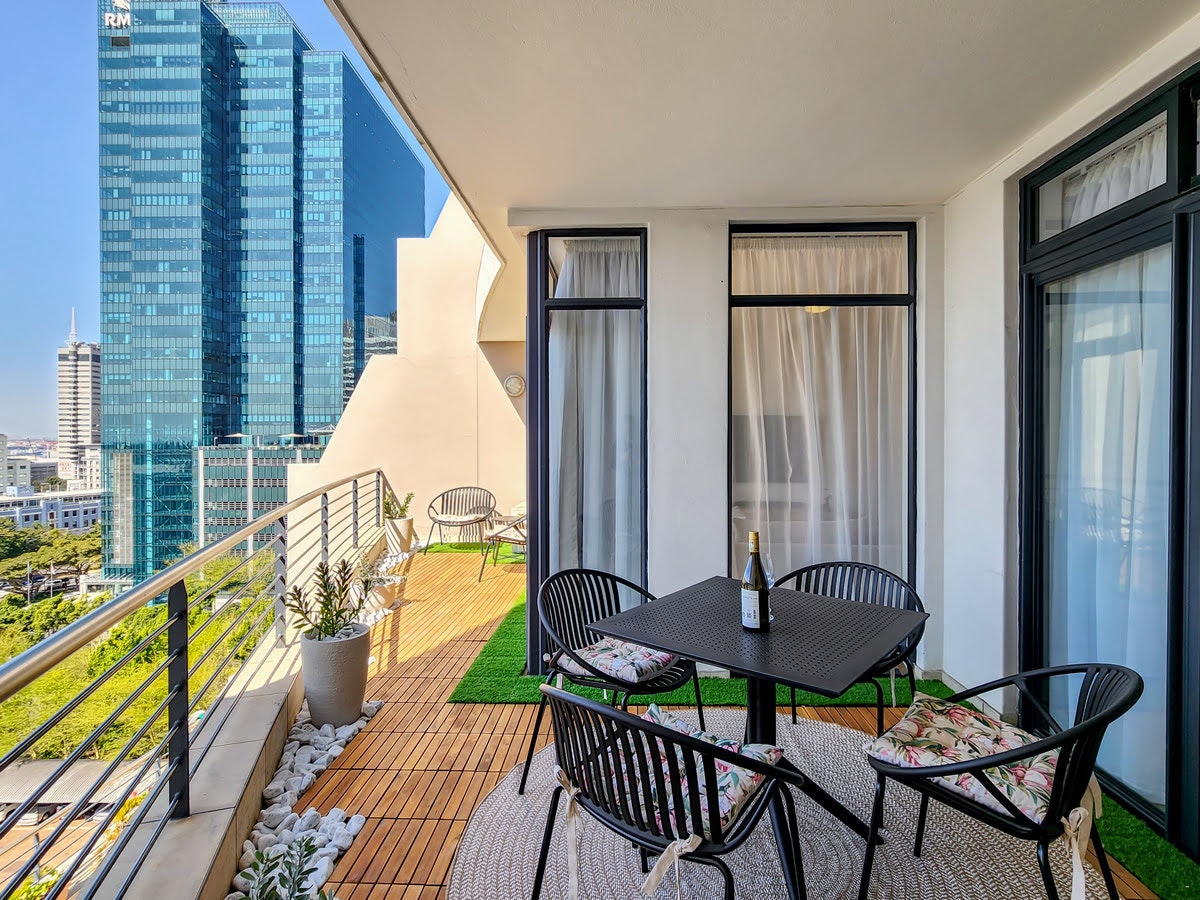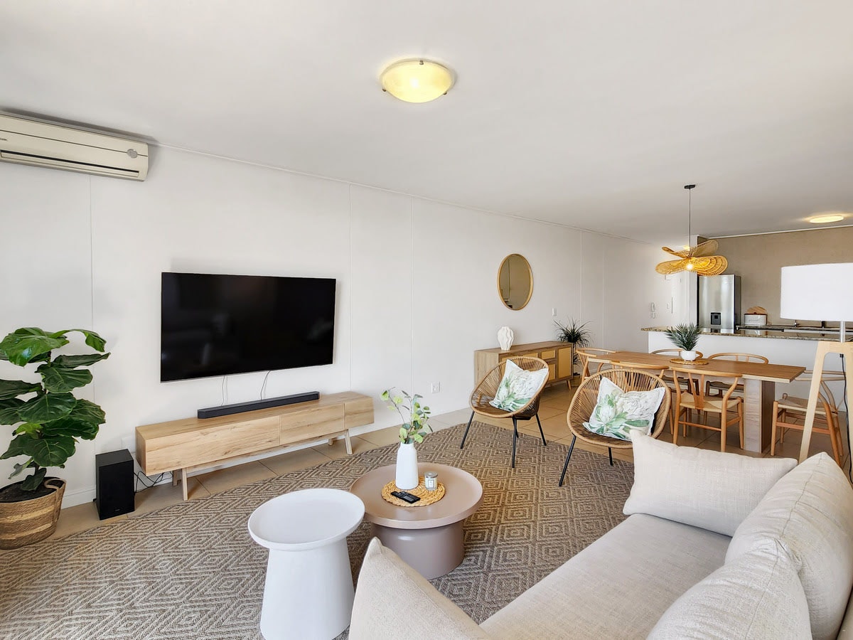 Die kombuis is volledig toegerus vir selfsorg en sluit 'n stoof, oond, yskas-vrieskas, mikrogolfoond, eetgerei en breekware in. Die leefarea bied 'n eetkamertafel, gemaklike sitplek, 'n TV en groot vensters wat natuurlike lig toelaat om die ruimte te vul. Skuifdeure maak oop na die privaat balkon, waar gaste verhewe uitsigte oor die omliggende stadsbeeld kan geniet.