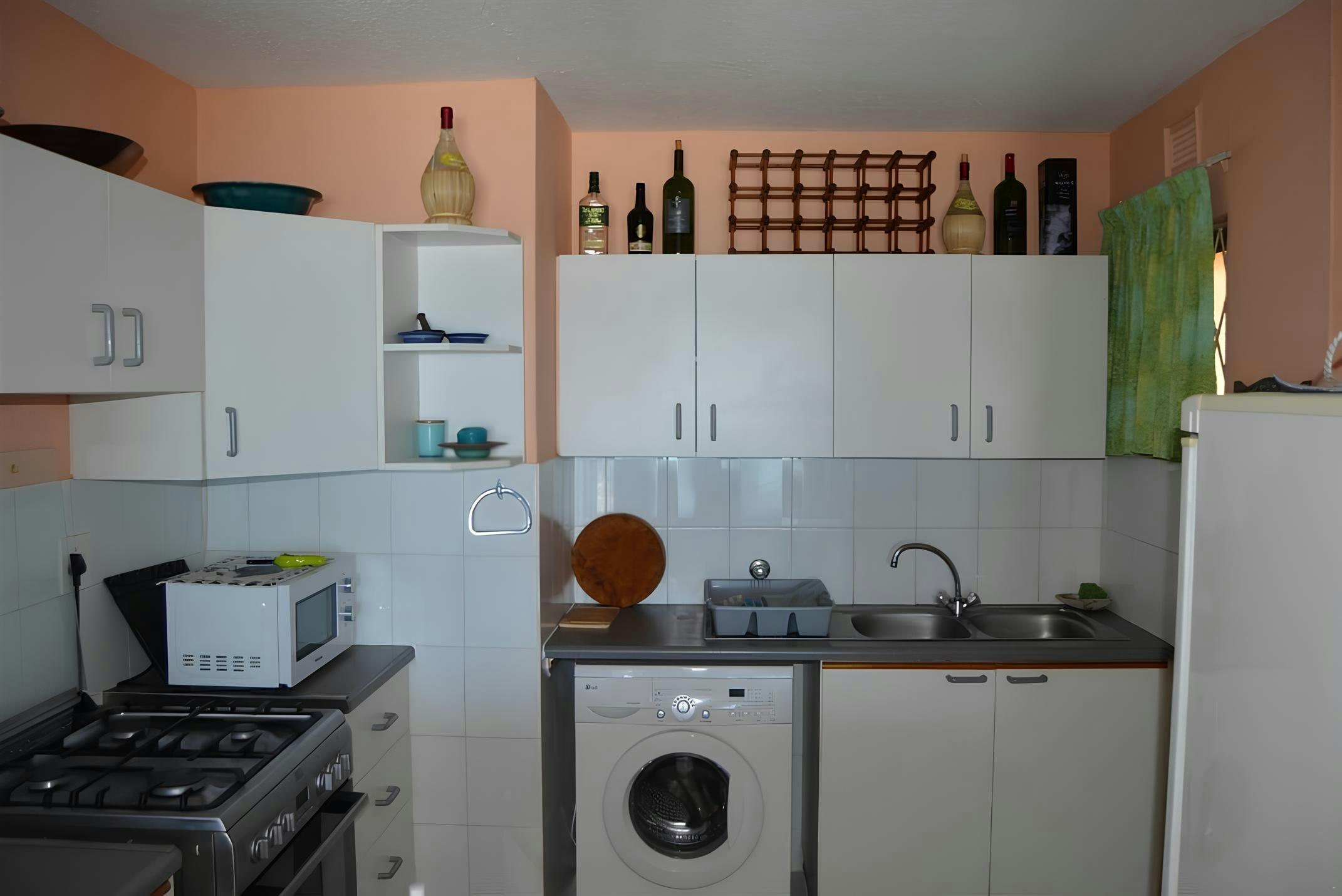 The apartment boasts a fully equipped kitchen with a gas stove, oven, microwave, toaster, kettle, cutlery, crockery, and a fridge, as well as a washing machine. The adjacent lounge has comfortable couches and a TV with DStv channels.