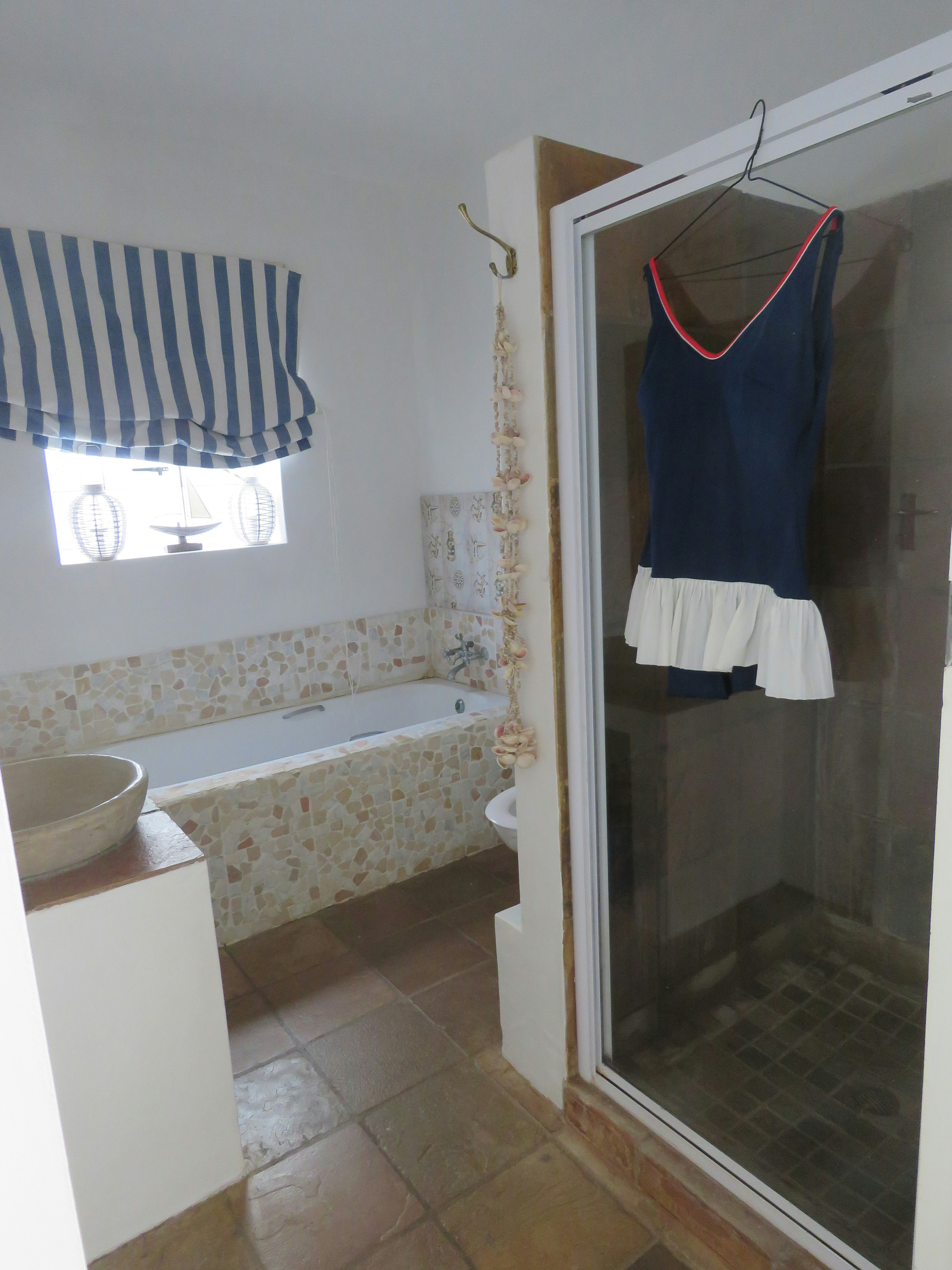 This pet-friendly apartment is located on the ground floor and consists of a private entrance with 2 bedrooms, 2 bathrooms, and a well-equipped kitchen and open-plan living area. It is best suited for 4 adults (2 couples) and 2 kids. The first bedroom is furnished with a double bed, and the second bedroom contains 1 queen-size bed and a bunk bed. The bathroom is fitted with a shower, bath, basin, and a toilet, and there is an outdoor shower with hot water. There is also a guest bathroom with a toilet and basin.
