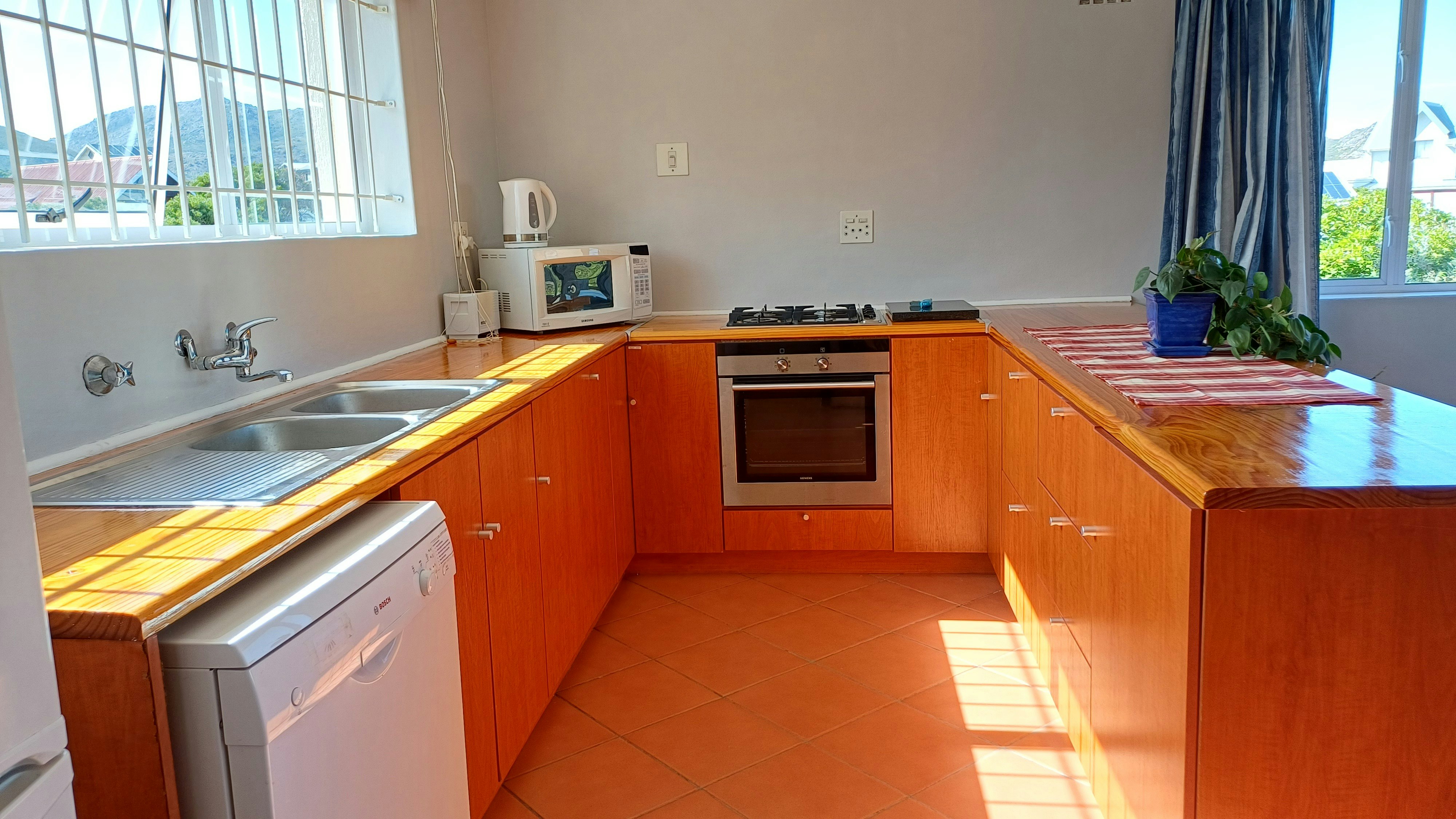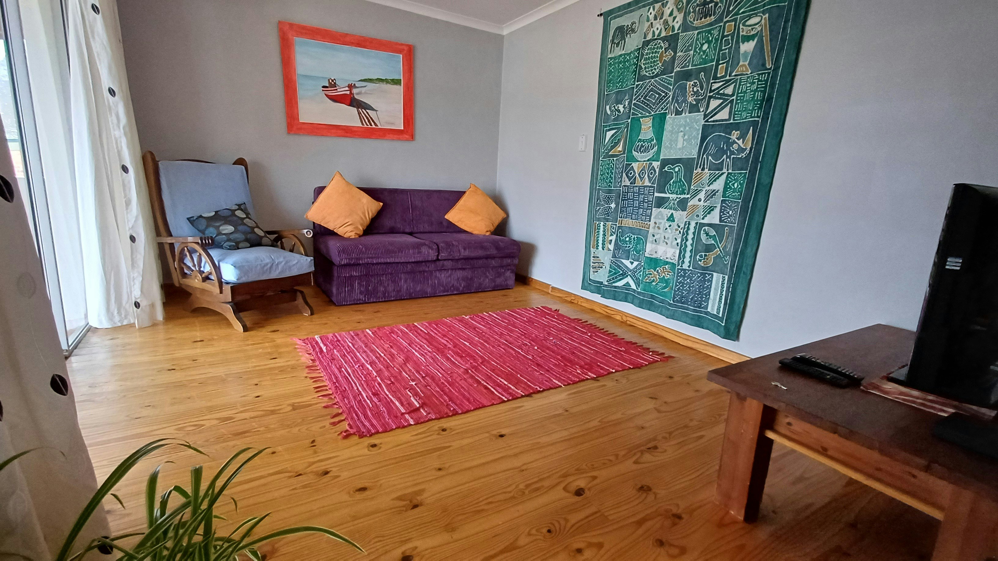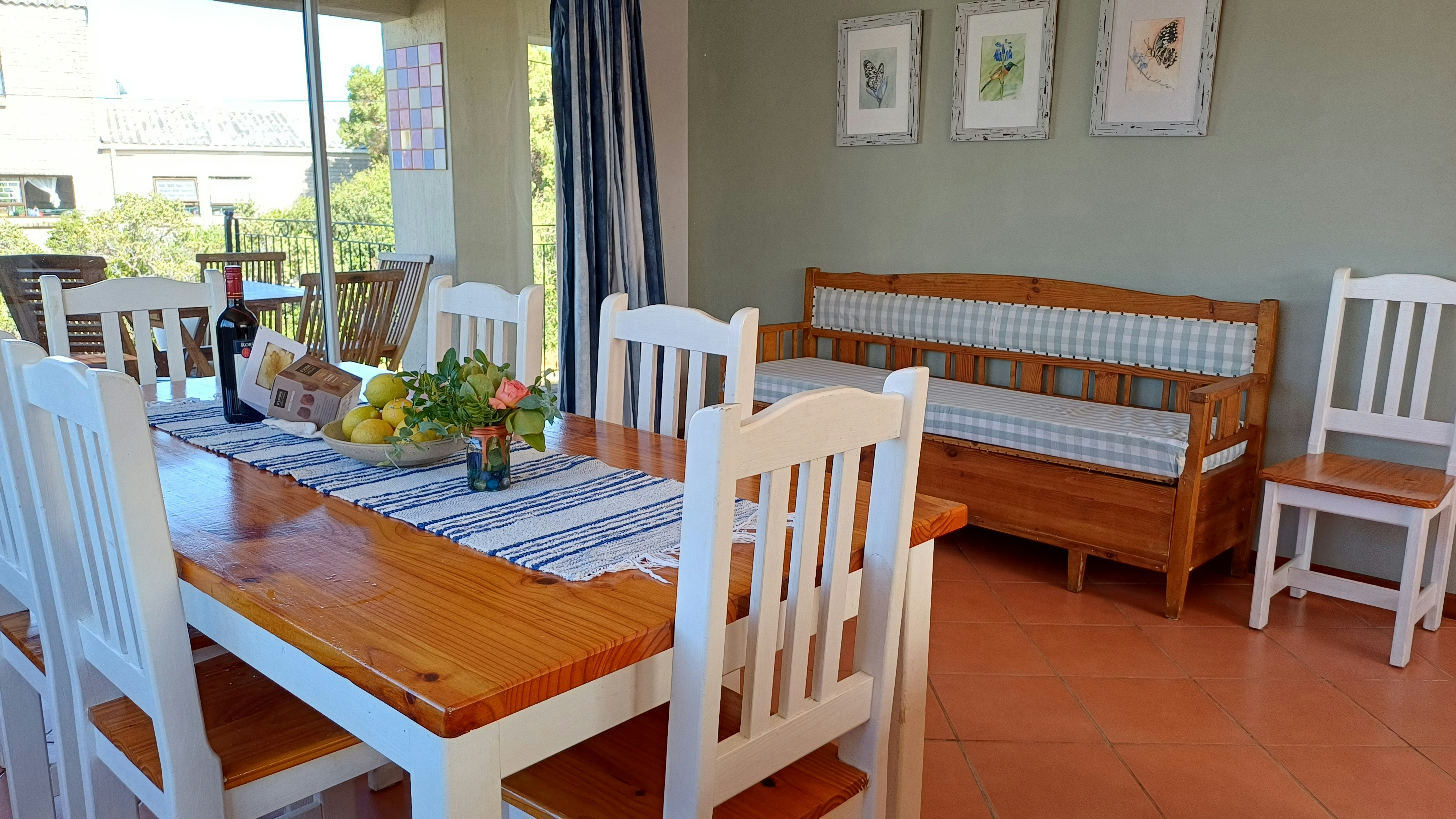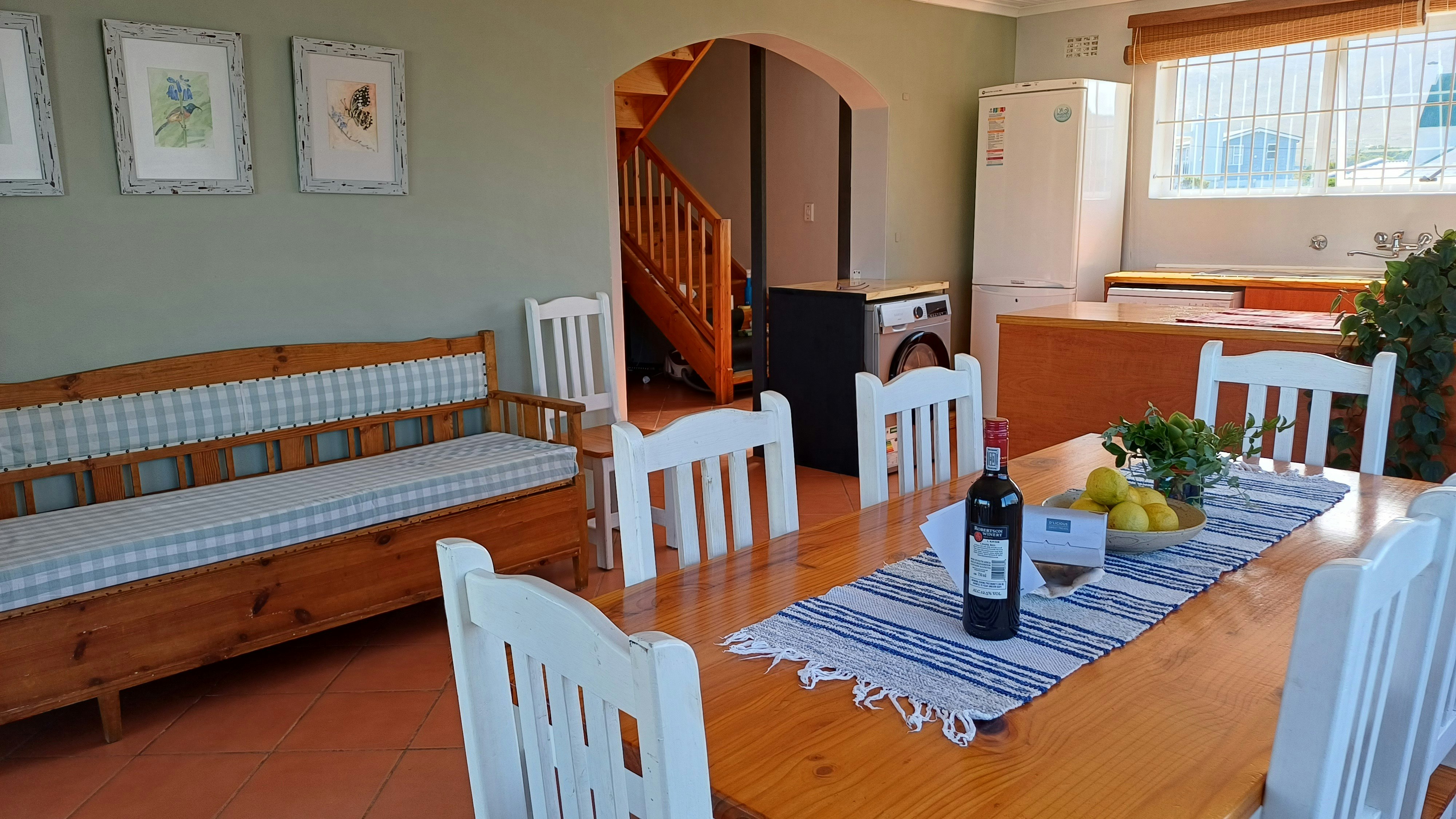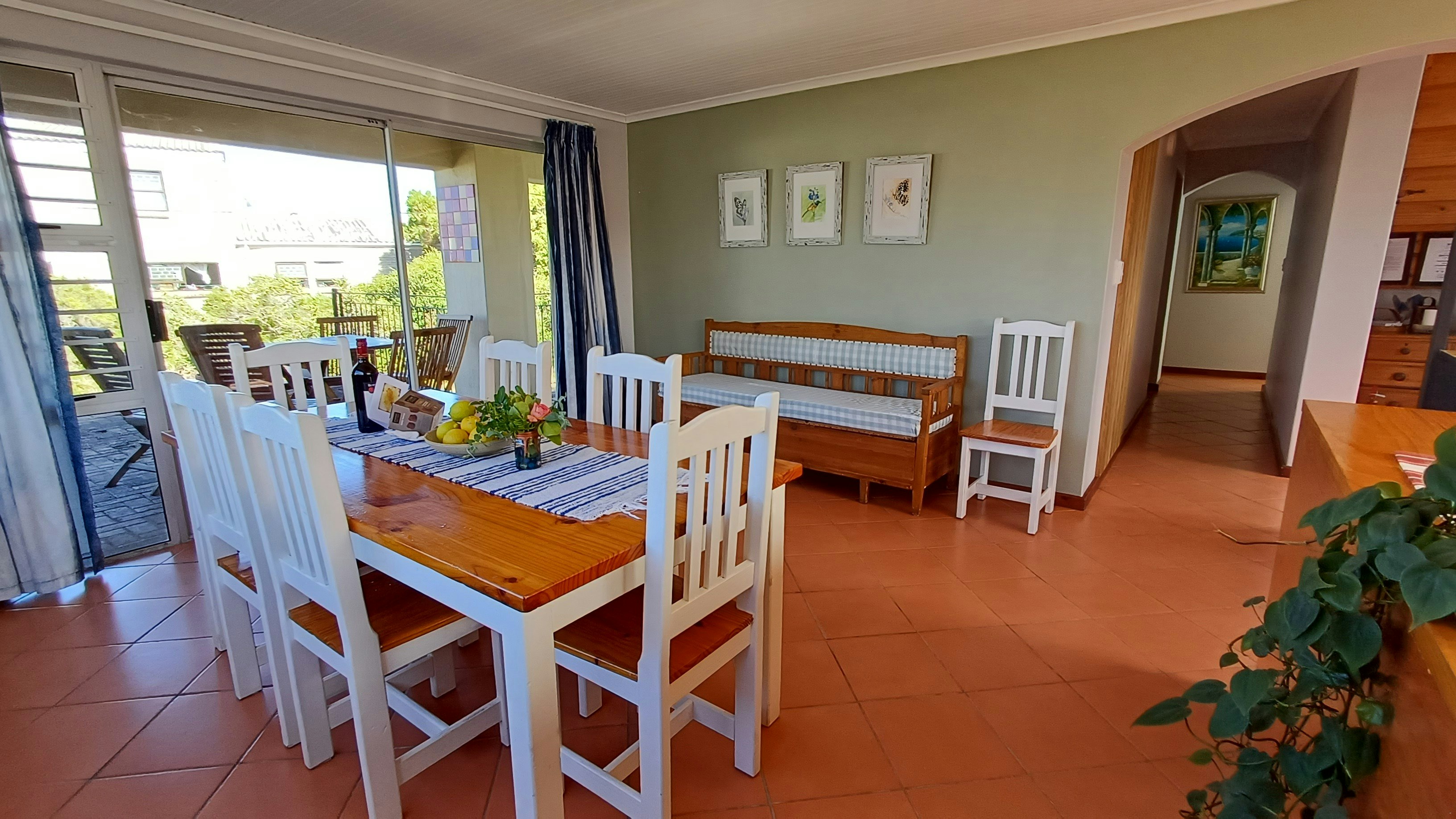 Die ruim leefarea op die eerste vloer spog met 'n uitsig op die berg en 'n skuifdeur wat na 'n onderdakbalkon lei. Langs die leefarea is daar 'n aparte TV-kamer, maar gaste moet asb. hulle eie DStv-dekodeerder saambring. Die oopplan-kombuis is netjies en volledig toegerus en sluit 'n skottelgoedwasser en 'n wasmasjien in. Die eetkamer het 'n groot etenstafel met 8 stoele. Daar is 'n skuifdeur wat vanaf die eetkamer na die onderdakbraai-area met 'n tafel en stoele lei.