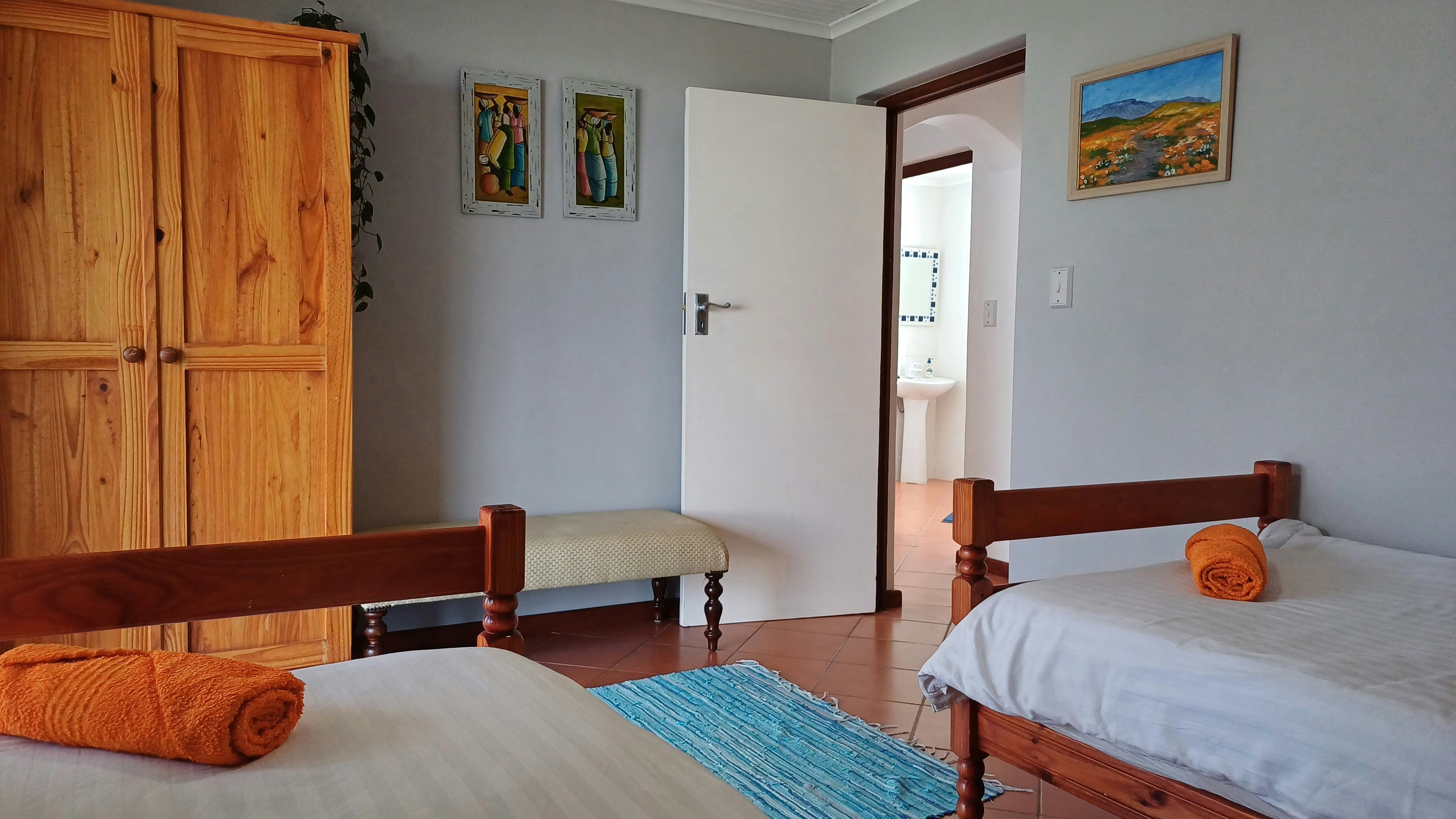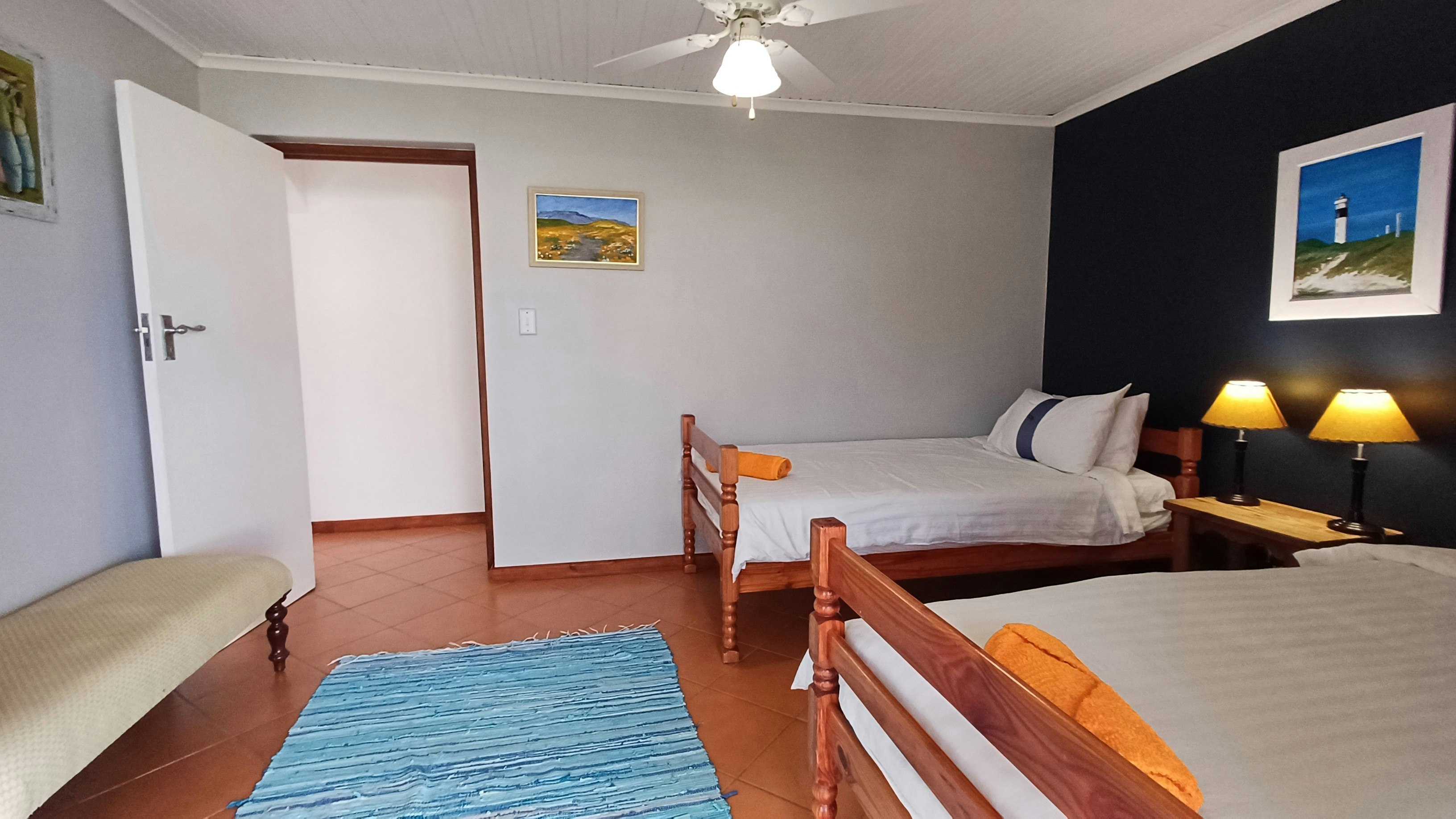 Die huis het 3 slaapkamers. Die hoofslaapkamer het 'n koningingrootte-bed, plafonwaaier en 'n balkon. Die ruim hoofbadkamer het 'n stort en 'n bad. Die 2 ander slaapkamers op die onderste verdieping het elkeen plafonwaaiers, 'n skuifdeur wat na 'n stoep lei en 2 enkelbeddens. Langs die slaapkamers is daar 'n groot badkamer met 'n stort.