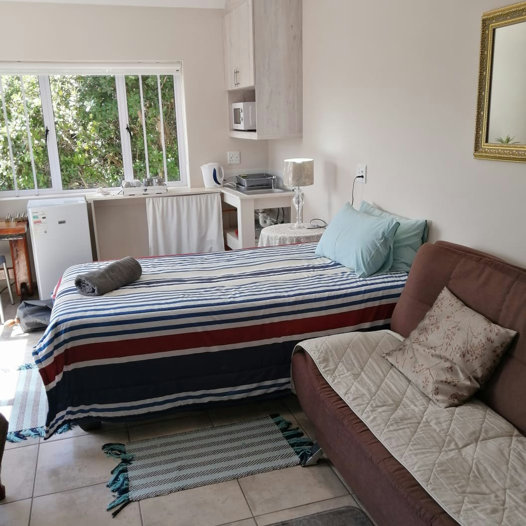 The upstairs apartment can accommodate 3 adults and 1 minor and comprises 2 rooms and 1 bathroom with a shower. The main bedroom contains a queen-size bed and a ceiling fan and the second room has a three-quarter bed, a double sleeper couch, and a kitchenette equipped with a fridge/freezer combo, microwave, and tea- and coffee-making facilities. This unit is also equipped with air conditioning. Braai facilities can be made available on request. The upstairs apartment features a private deck.