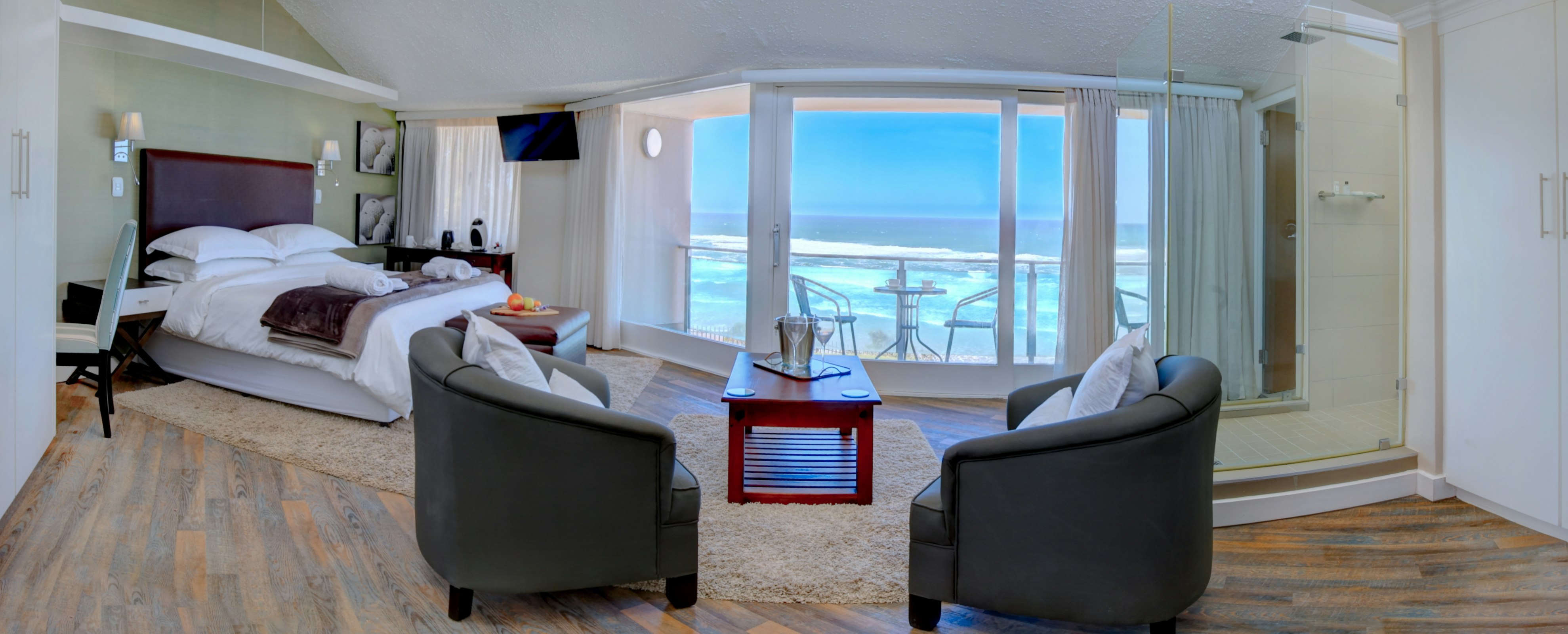 Die huis het slaapplek vir 10 gaste in 5 elegante slaapkamers met see-uitsigte en privaat balkonne. Elke kamer het 'n ekstra lang koninggrootte-bed en 'n en suite-badkamer met 'n bad en stort. Die kamer het ook 'n platskerm-TV met DStv en koffie- en teemaakgeriewe.