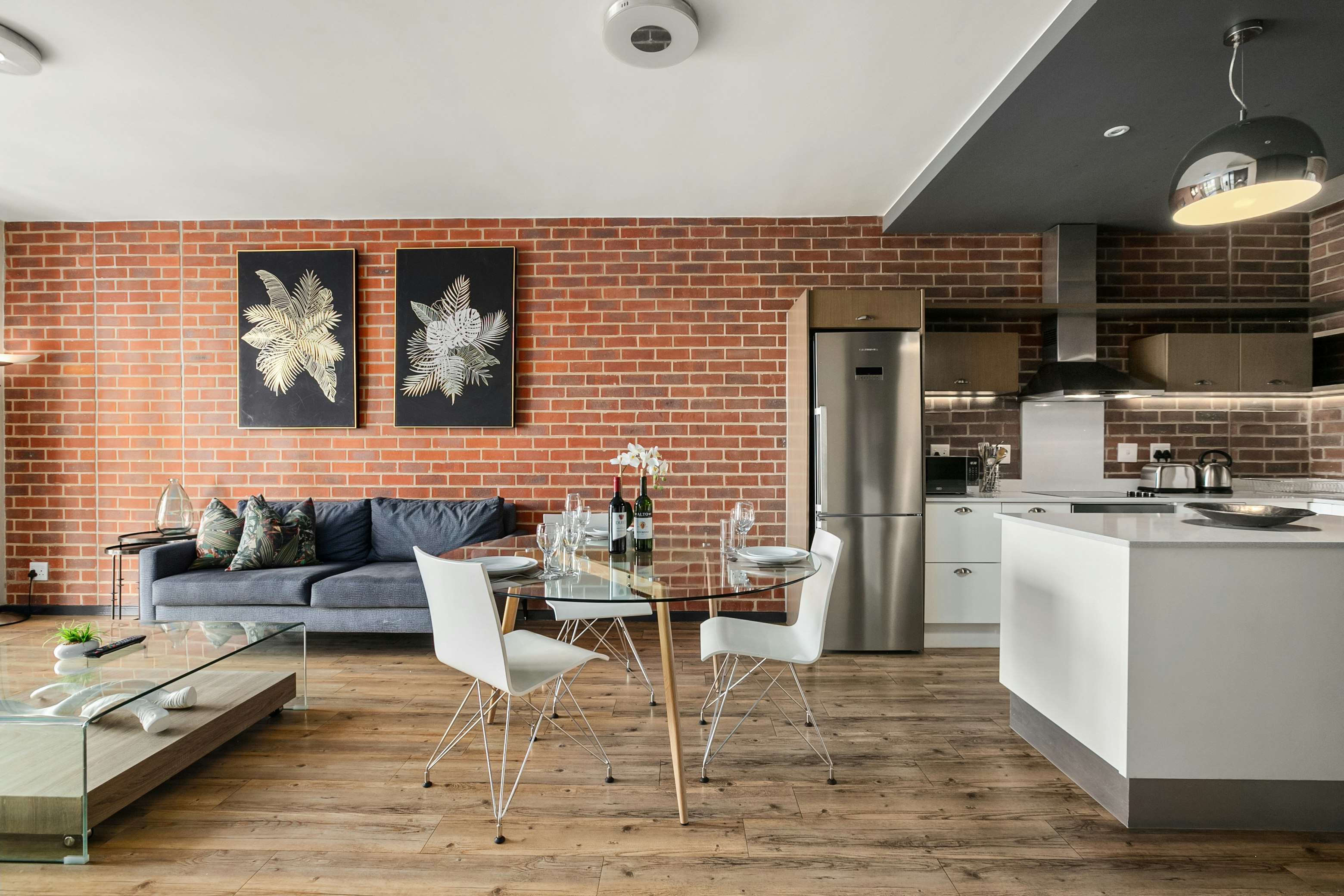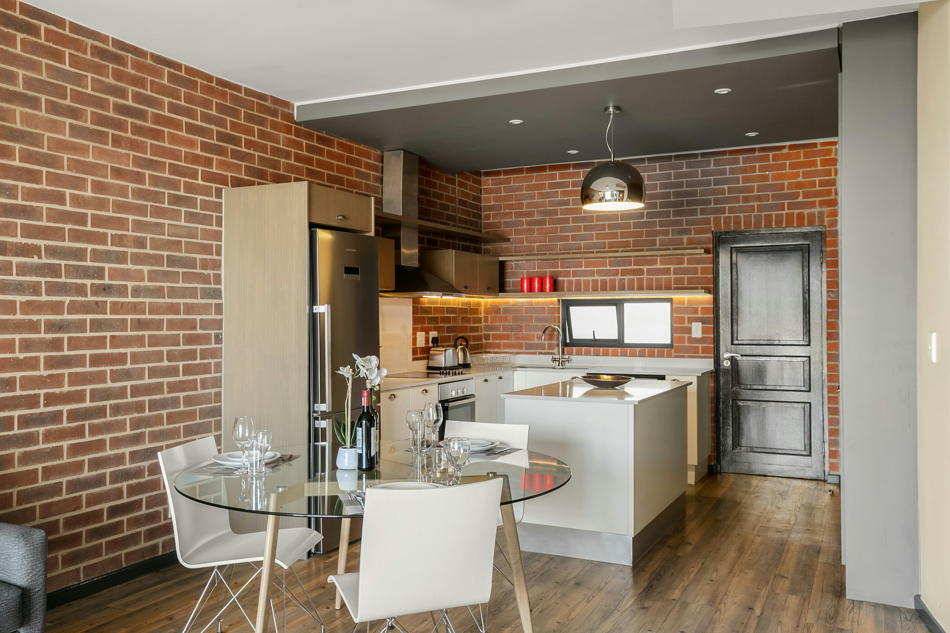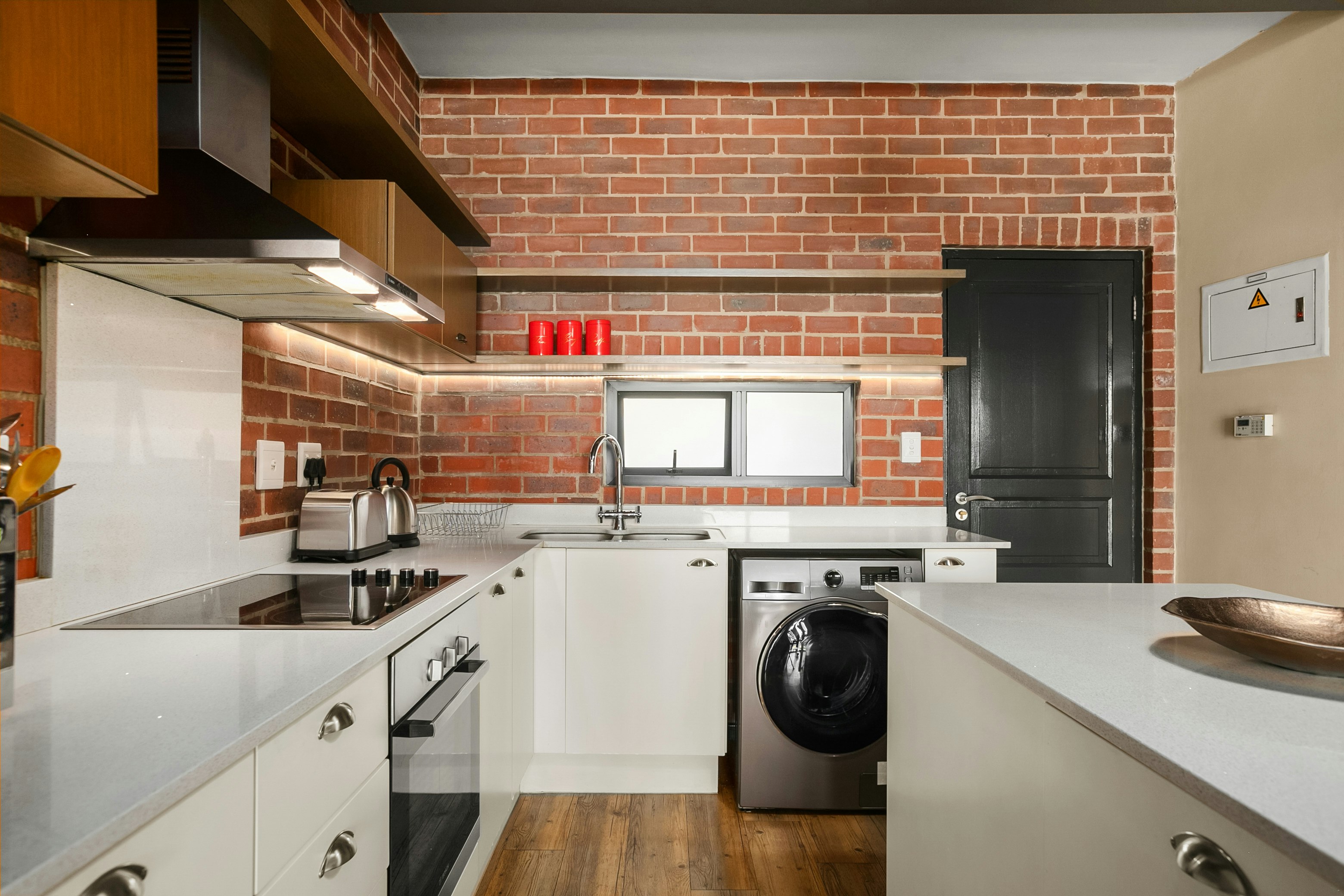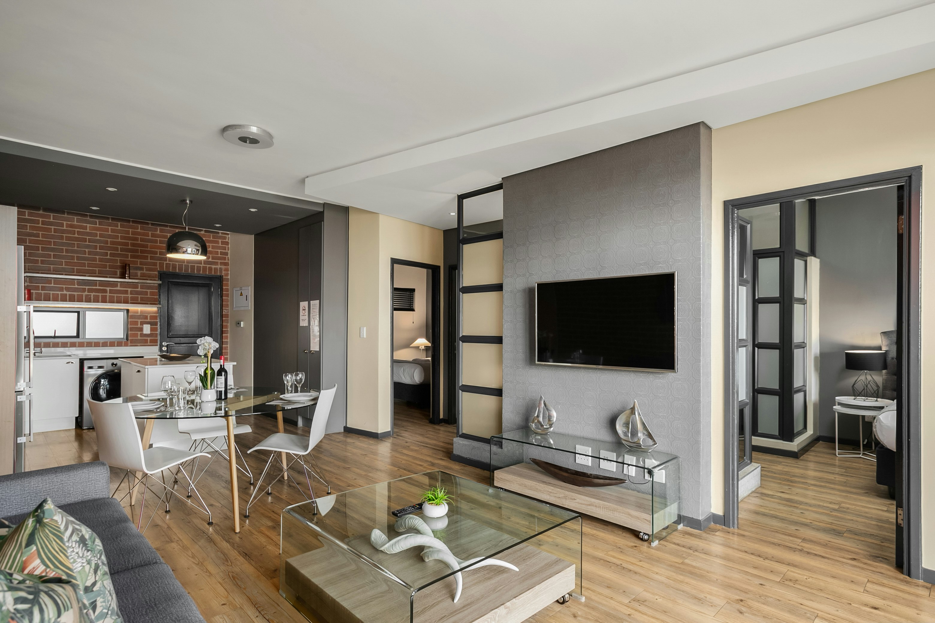 Die woonstel beskik ook oor 'n oopplan-kombuis, -sitarea en -eetarea. Die oopplan-kombuis is met 'n yskas, stoof, oond, mikrogolfoond, ketel, broodrooster en 'n wasmasjien toegerus. Die oopplan-leefarea het 'n etenstafel, stoele en 'n sitarea met 'n slim-TV met toegang tot Netflix en YouTube en lei na 'n balkon.