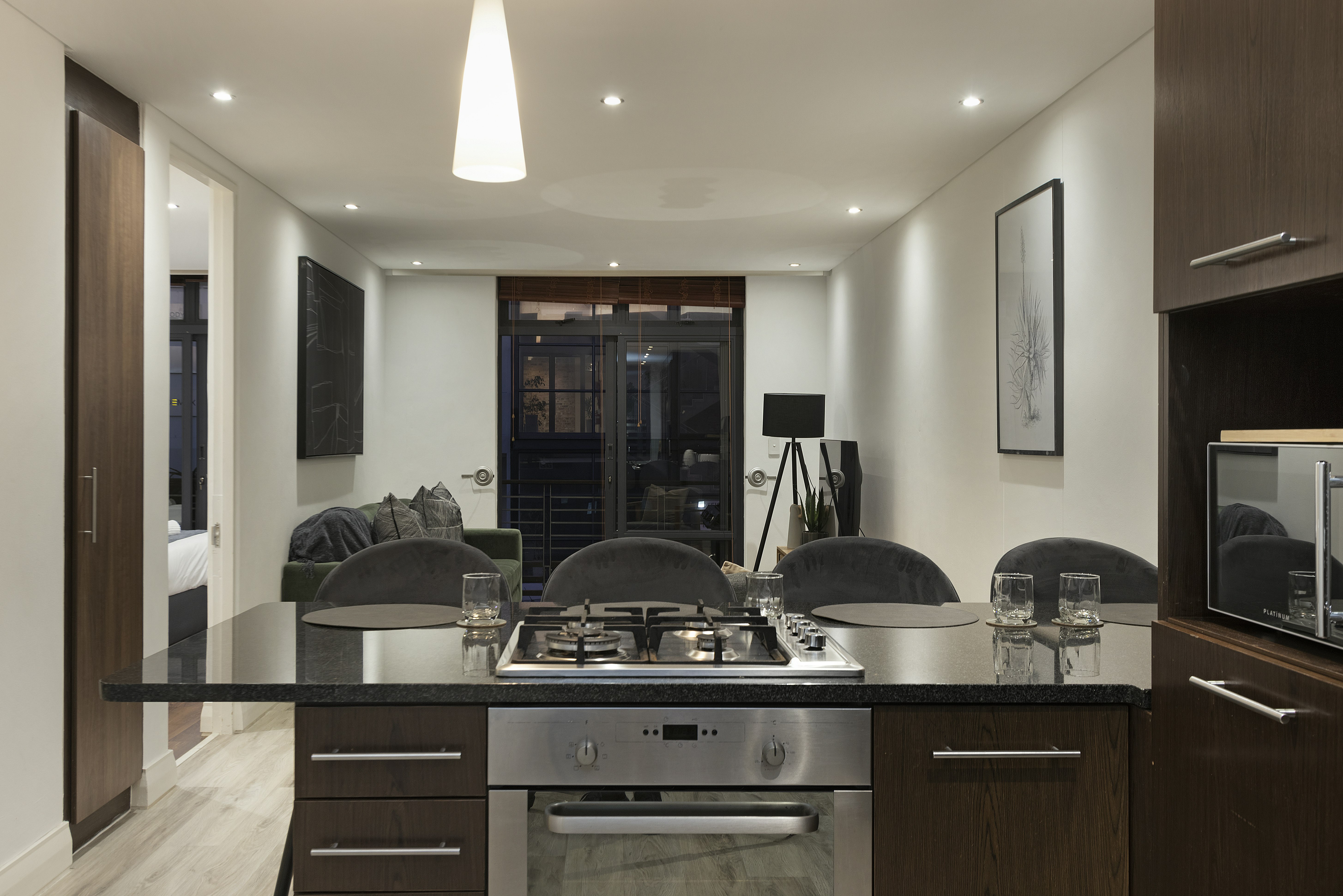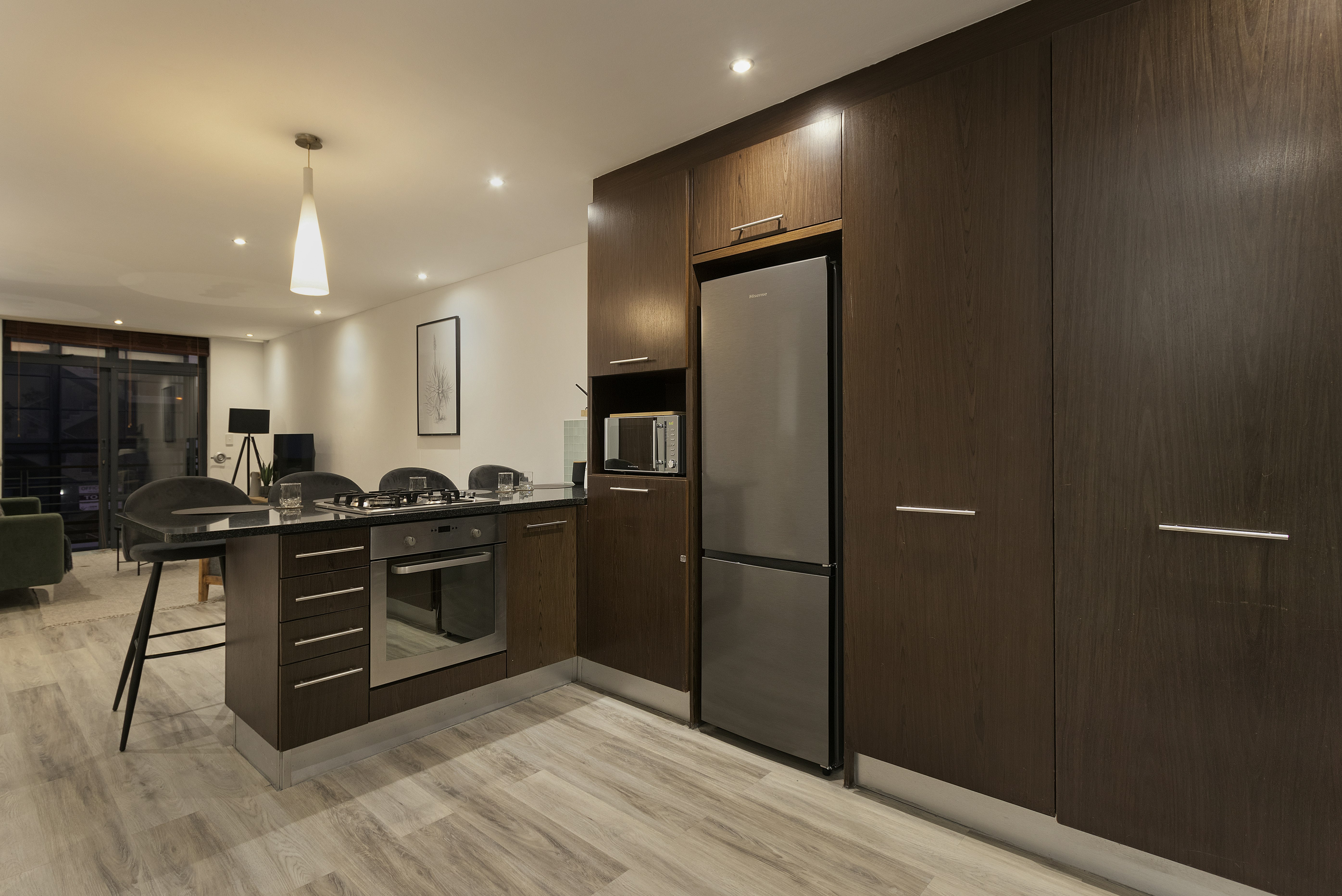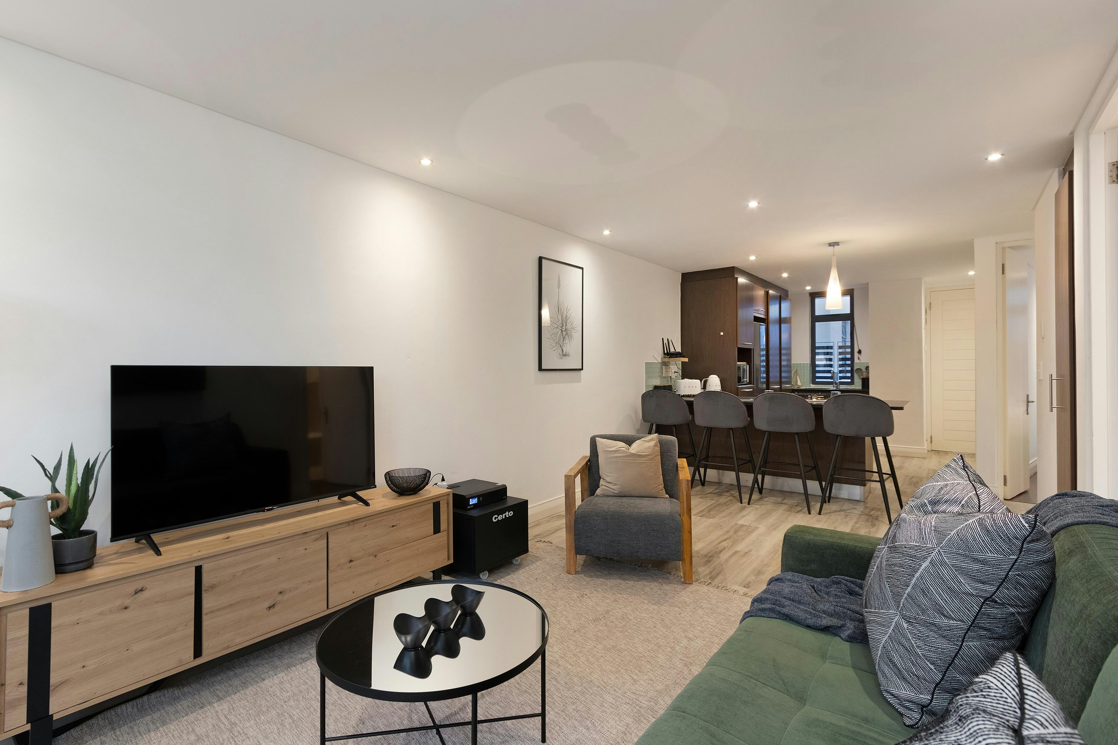 Die oopplan-leefarea beskik oor 'n stylvolle kombuis wat volledig toegerus is met 'n stoof, oond, mikrogolfoond, yskas-vrieskas, eetgerei en breekware, asook 'n ontbyttoonbank met stoele. 'n Skottelgoedwasser en wasmasjien is ook beskikbaar. Vanuit die kombuis lei 'n knus sitkamer met gemaklike sitplek en 'n platskerm-slim-TV. Gratis WiFi is beskikbaar.