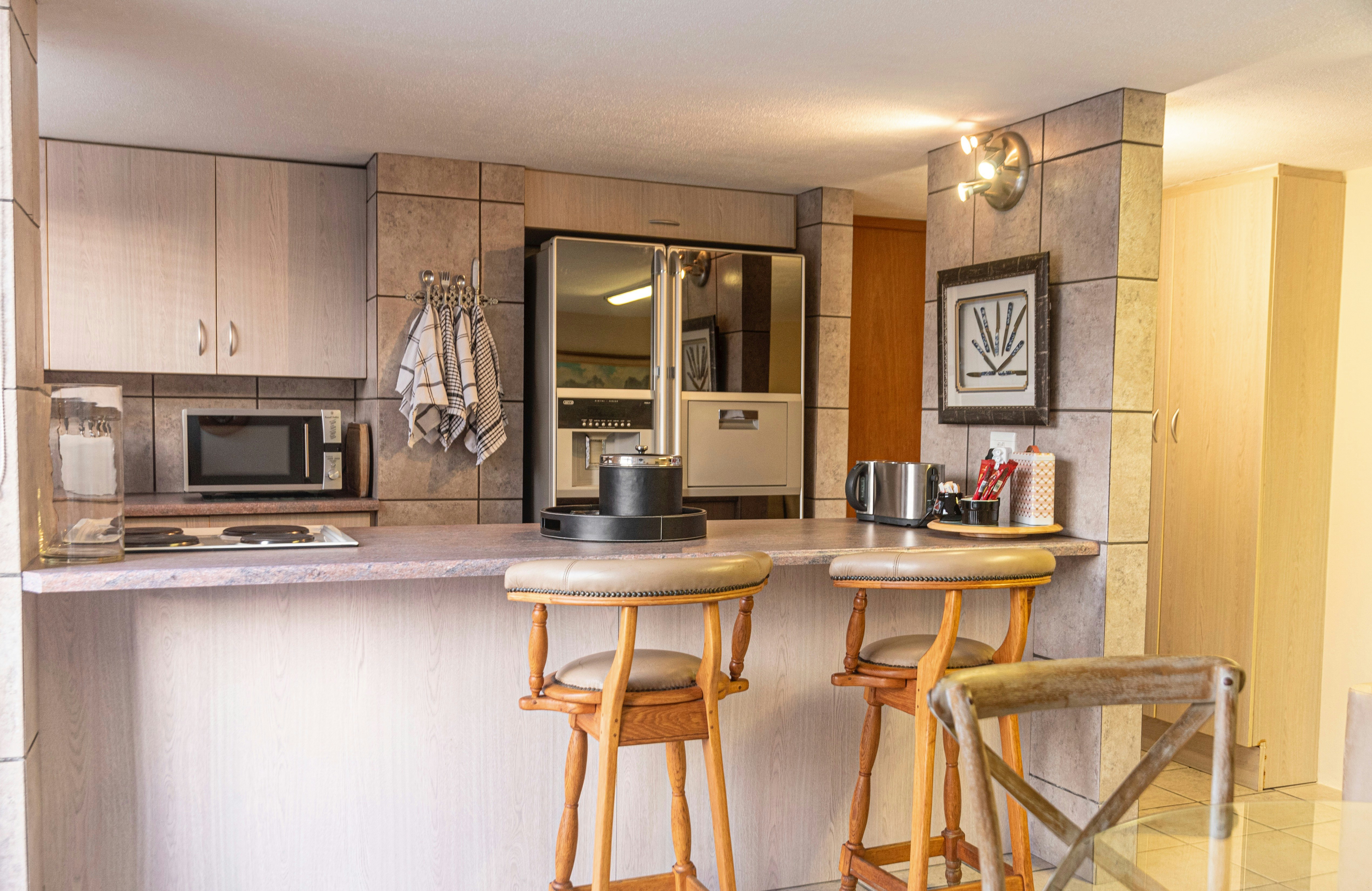 El De Mon is ingerig met 'n koninggrootte-bed en het 'n badkamer met 'n bad en handstort. Handdoeke en linne word voorsien. Die kombuis is toegerus met 'n yskas, mikrogolf, stoof, en oond asook tee- en koffiemaakgeriewe.
