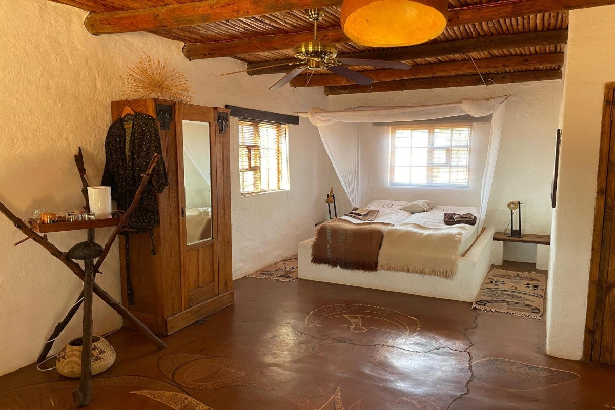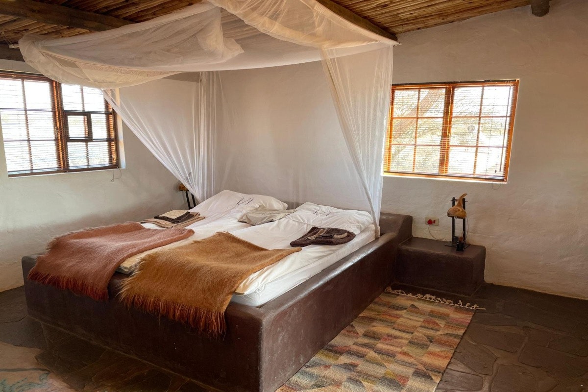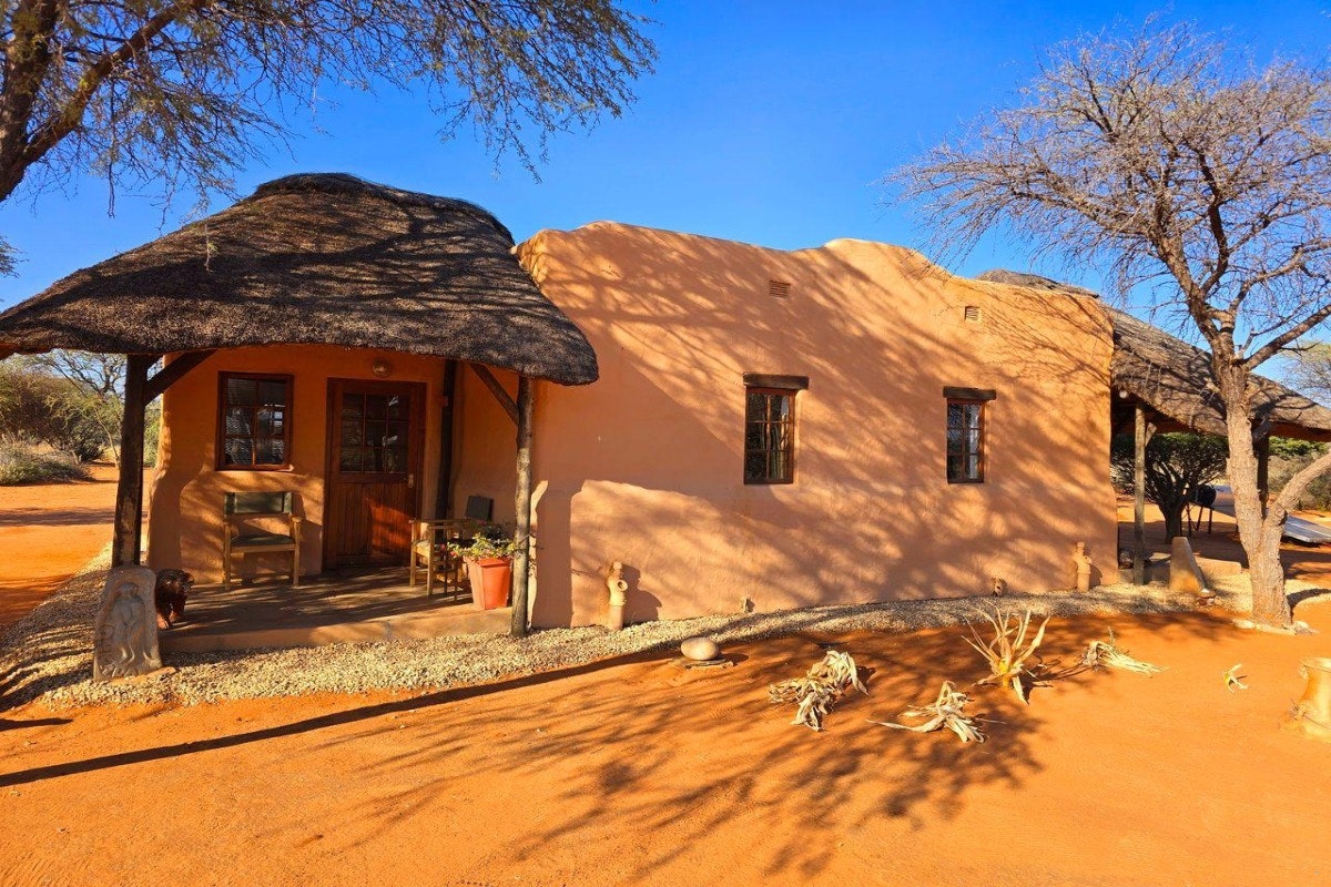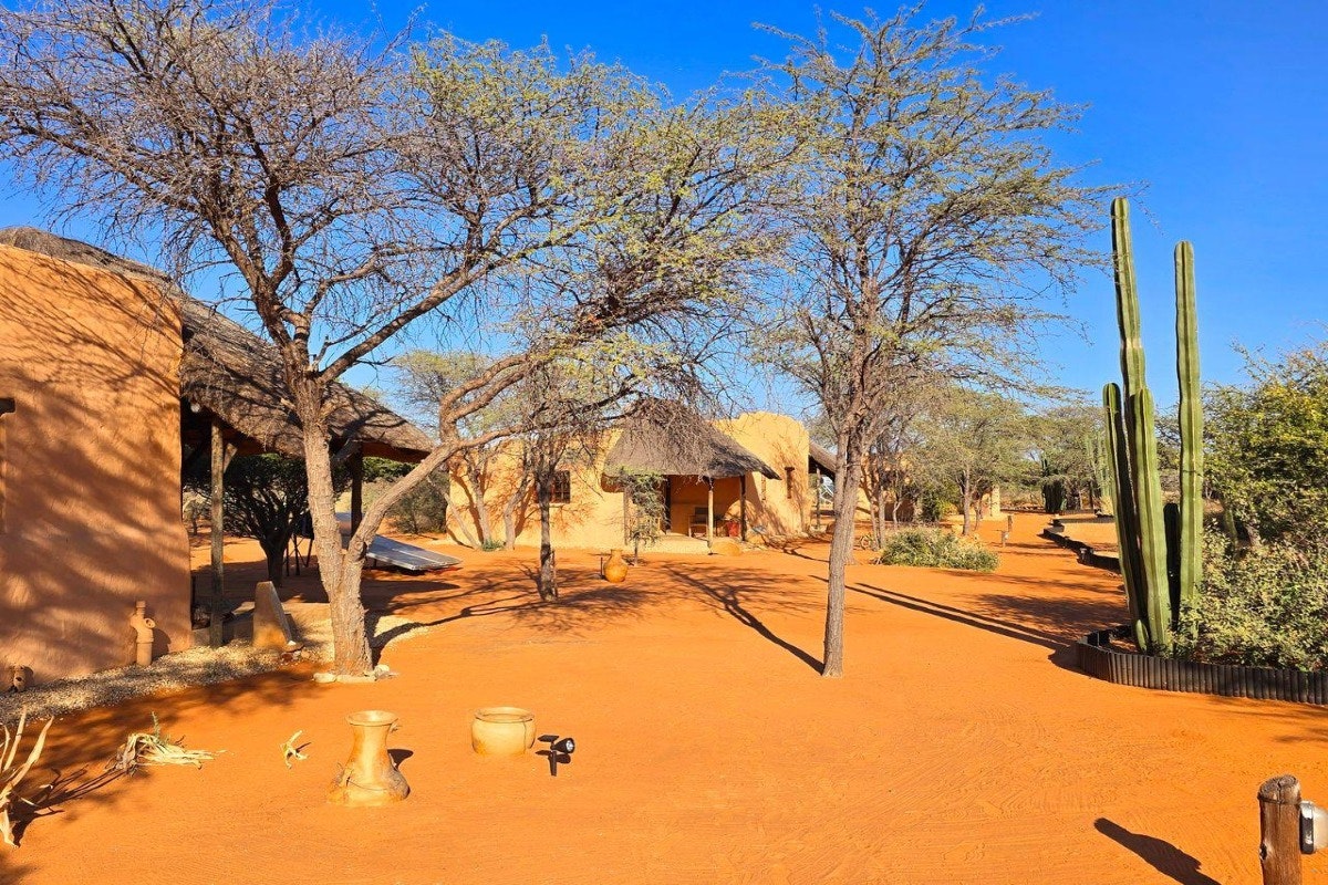 Eningu Clayhouse Lodge is a unique desert retreat situated in Dordabis, artfully crafted from handmade clay bricks that reflect the warm tones of the surrounding Kalahari savannah. This one-of-a-kind lodge blends creativity, comfort, and natural beauty, making it an ideal escape for travellers seeking peace and inspiration.