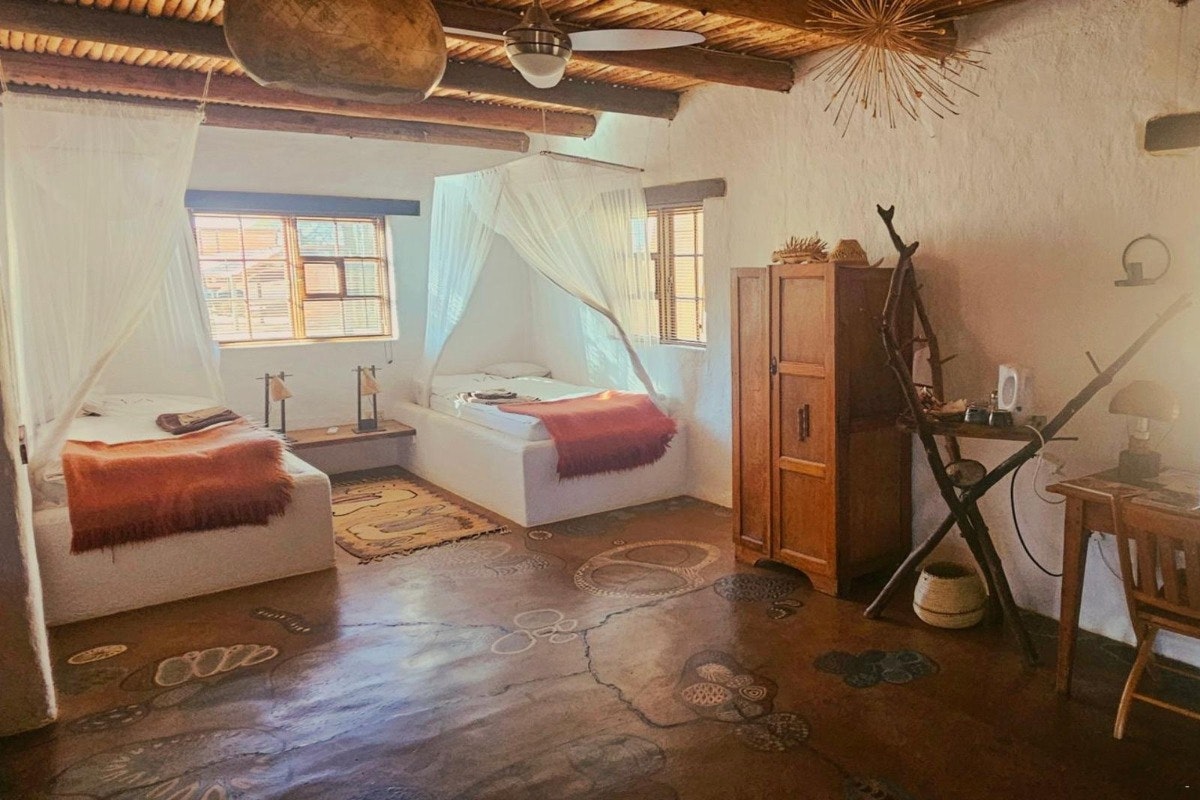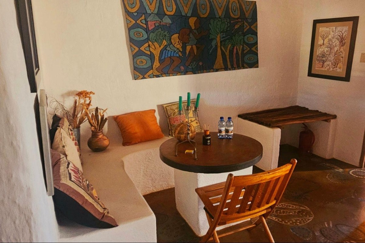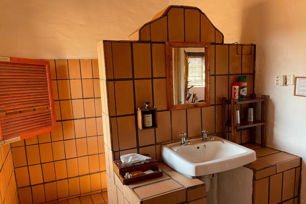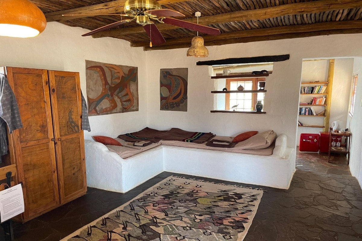 Eningu Clayhouse Lodge is a unique desert retreat situated in Dordabis, artfully crafted from handmade clay bricks that reflect the warm tones of the surrounding Kalahari savannah. This one-of-a-kind lodge blends creativity, comfort, and natural beauty, making it an ideal escape for travellers seeking peace and inspiration.