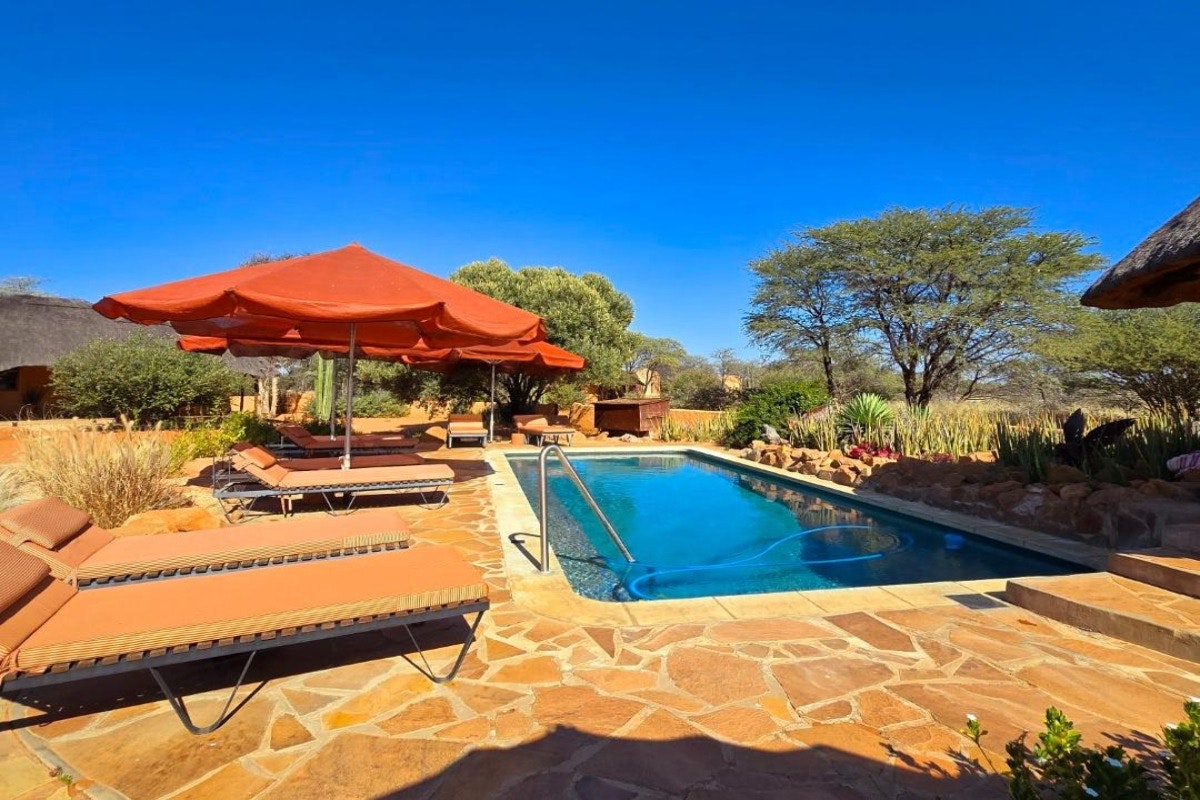 At the heart of the lodge is the welcoming main house, where high thatched ceilings and unique artistic touches set a warm atmosphere. Guests can relax in cosy lounges, browse the library, or enjoy a drink at the bar. Outdoors, a sparkling swimming pool provides relief from the desert heat, while wide terraces showcase breathtaking views of the bushveld and unforgettable Namibian sunsets.