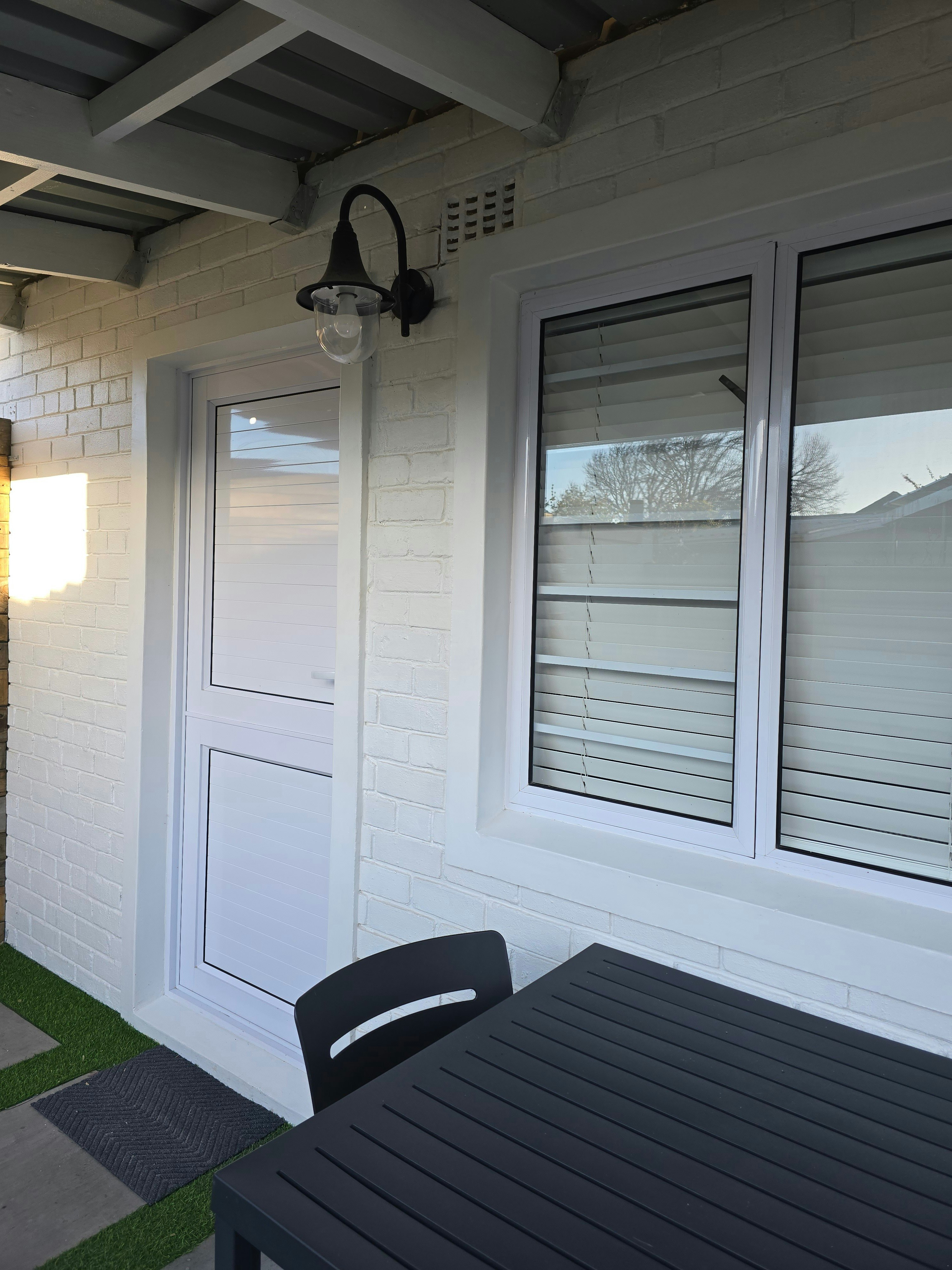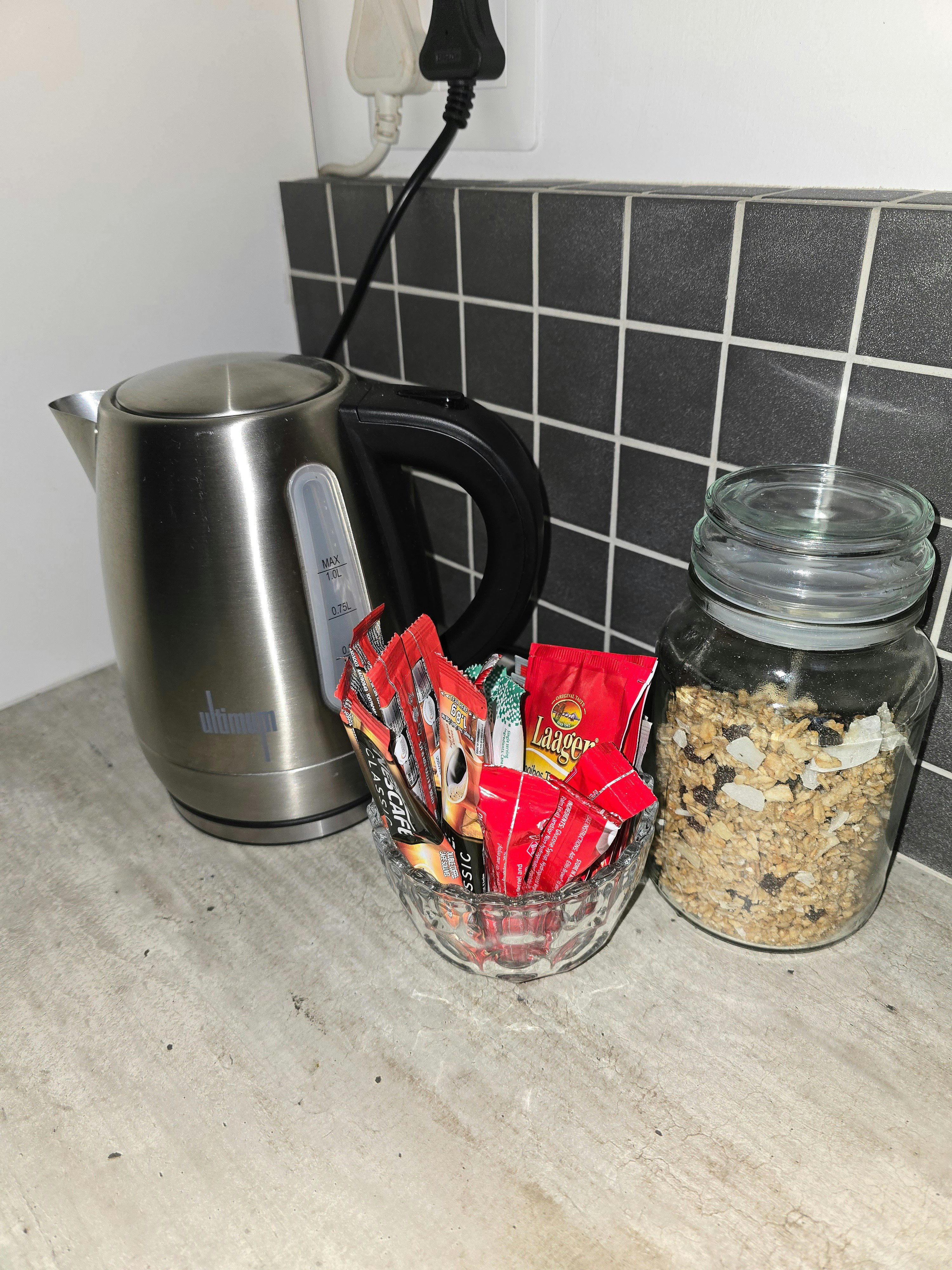 Die kombuis is toegerus met 'n yskassie, mikrogolfoond, induksieplaat, ketel en eetgerei. Gaste ontvang gratis tee en koffie. Daarbenewens kan die kombuistafel as 'n gemaklike werkruimte dien. Daar is 'n buitepatio met 'n braai-area met vuurmaakhout. Vir gaste se vermaak is daar 'n slim-TV met Netflix en Disney+ stroomdienste en gratis WiFi.