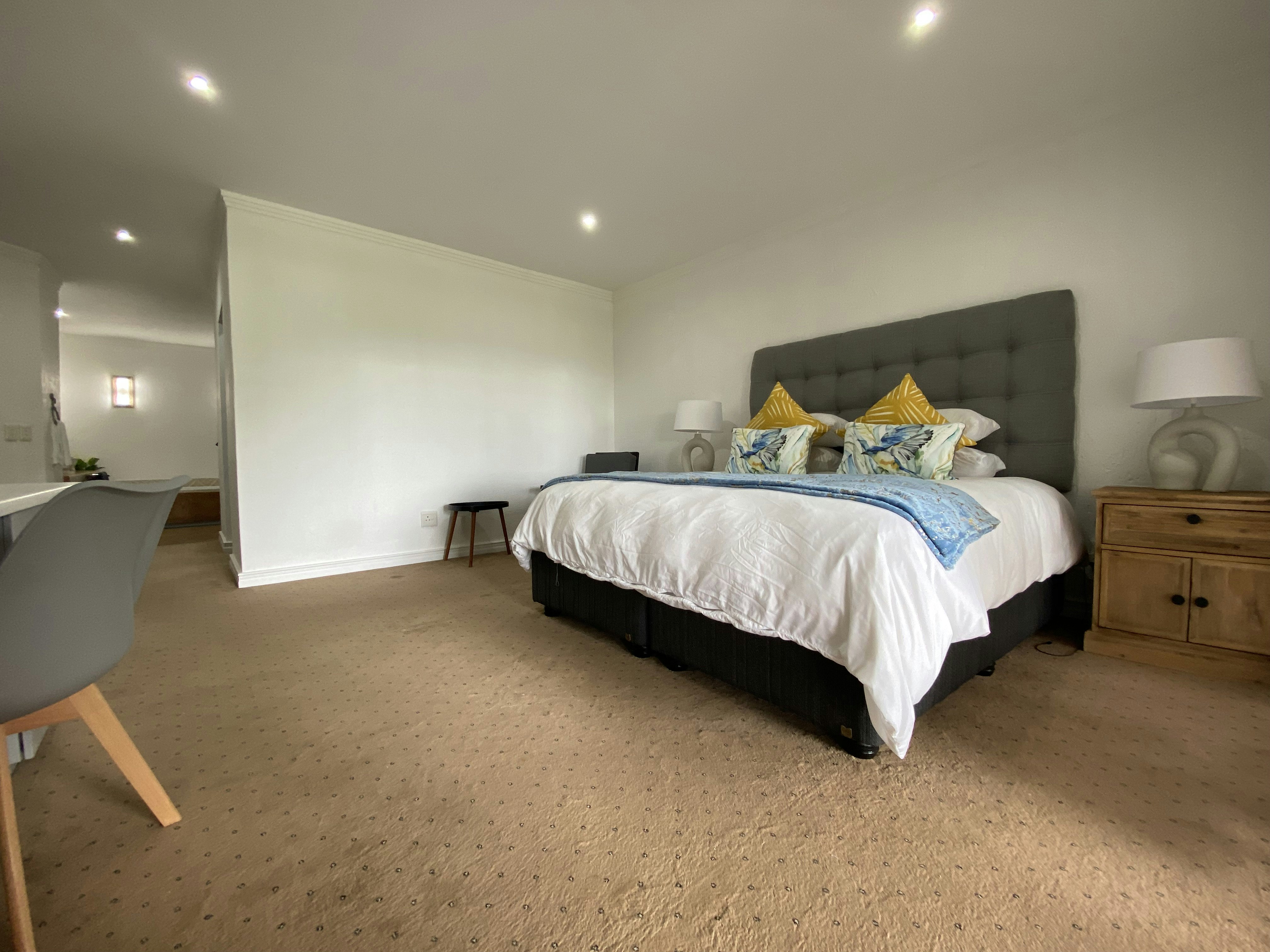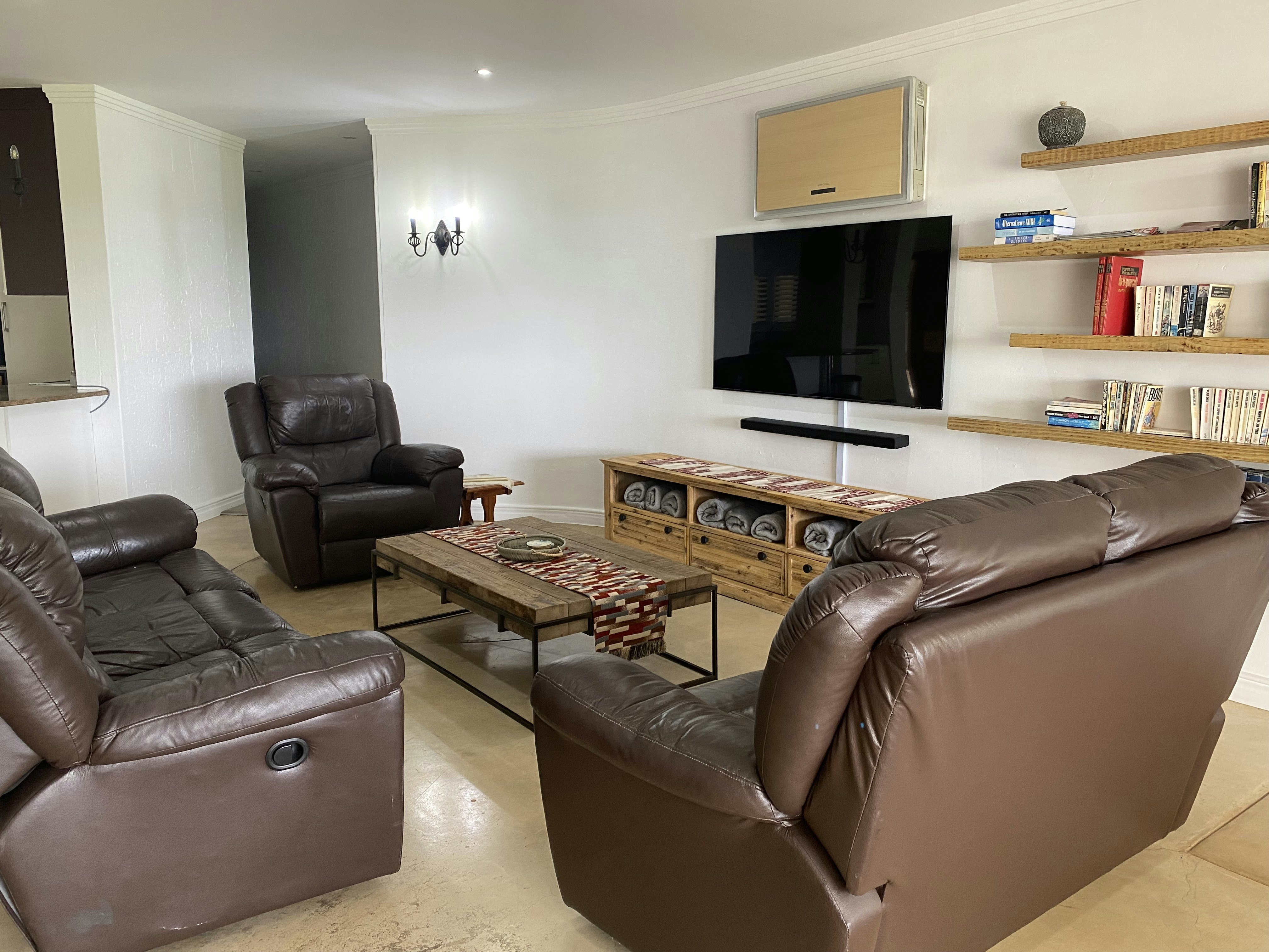 The living area features a lounge, a dining area and a kitchen. The kitchen is equipped with a stove, oven, microwave, fridge-freezer, dishwasher, washing machine, tea- and coffee-making facilities and cutlery and crockery. Smeg appliances ensures a luxury feel. The dining area is furnished with a dining table suitable for 8 guests. The lounge is furnished with a comfortable lounge suite, a coffee table and a TV with DStv. Access to free Wi-Fi is available.