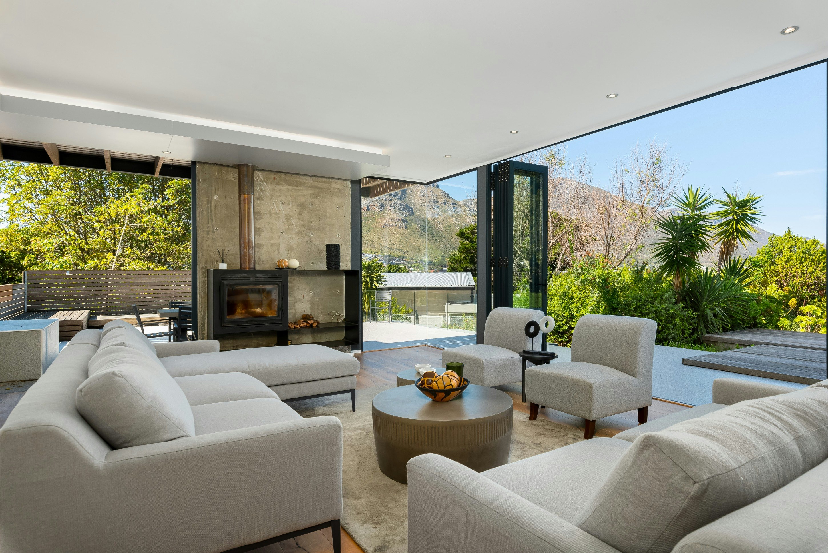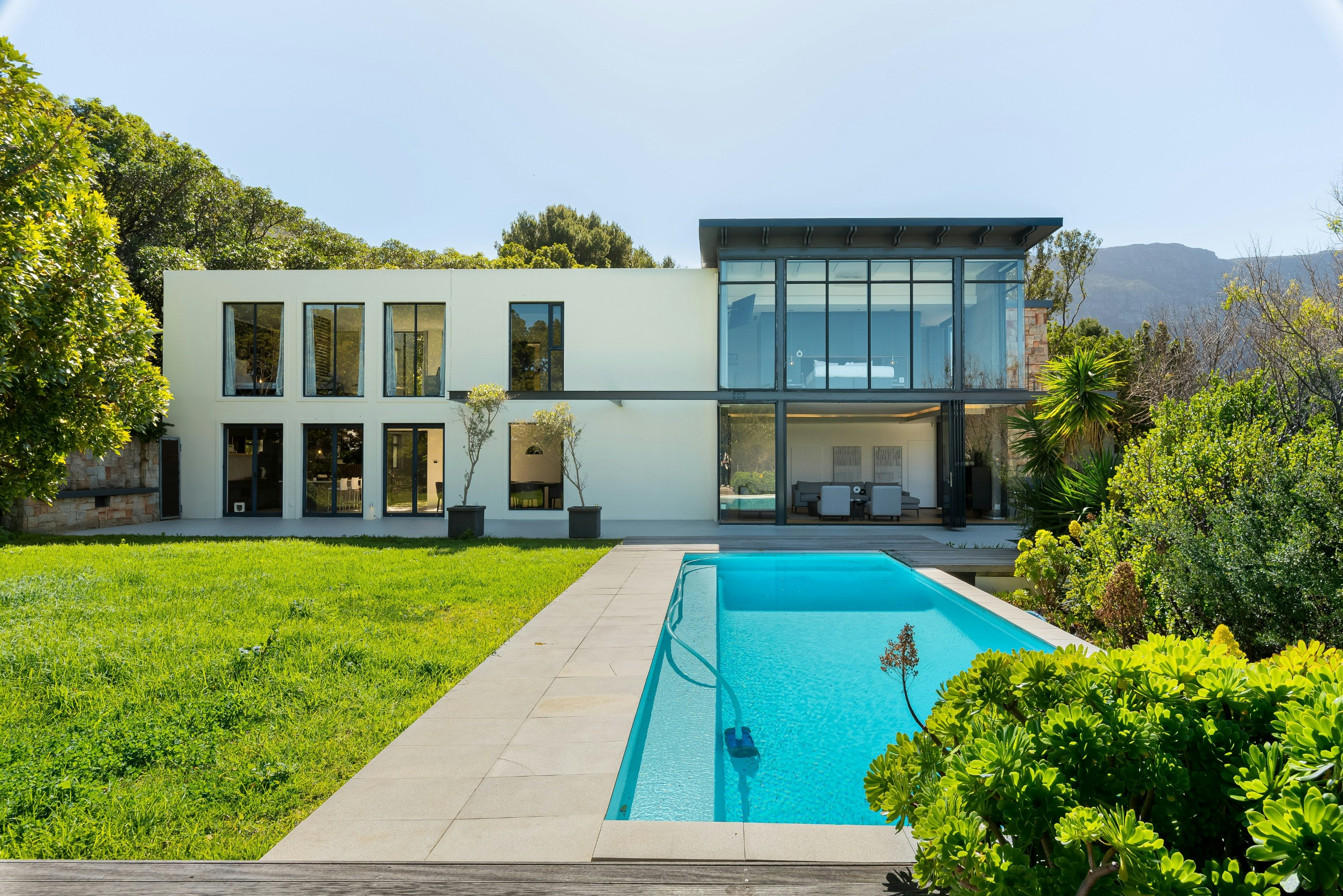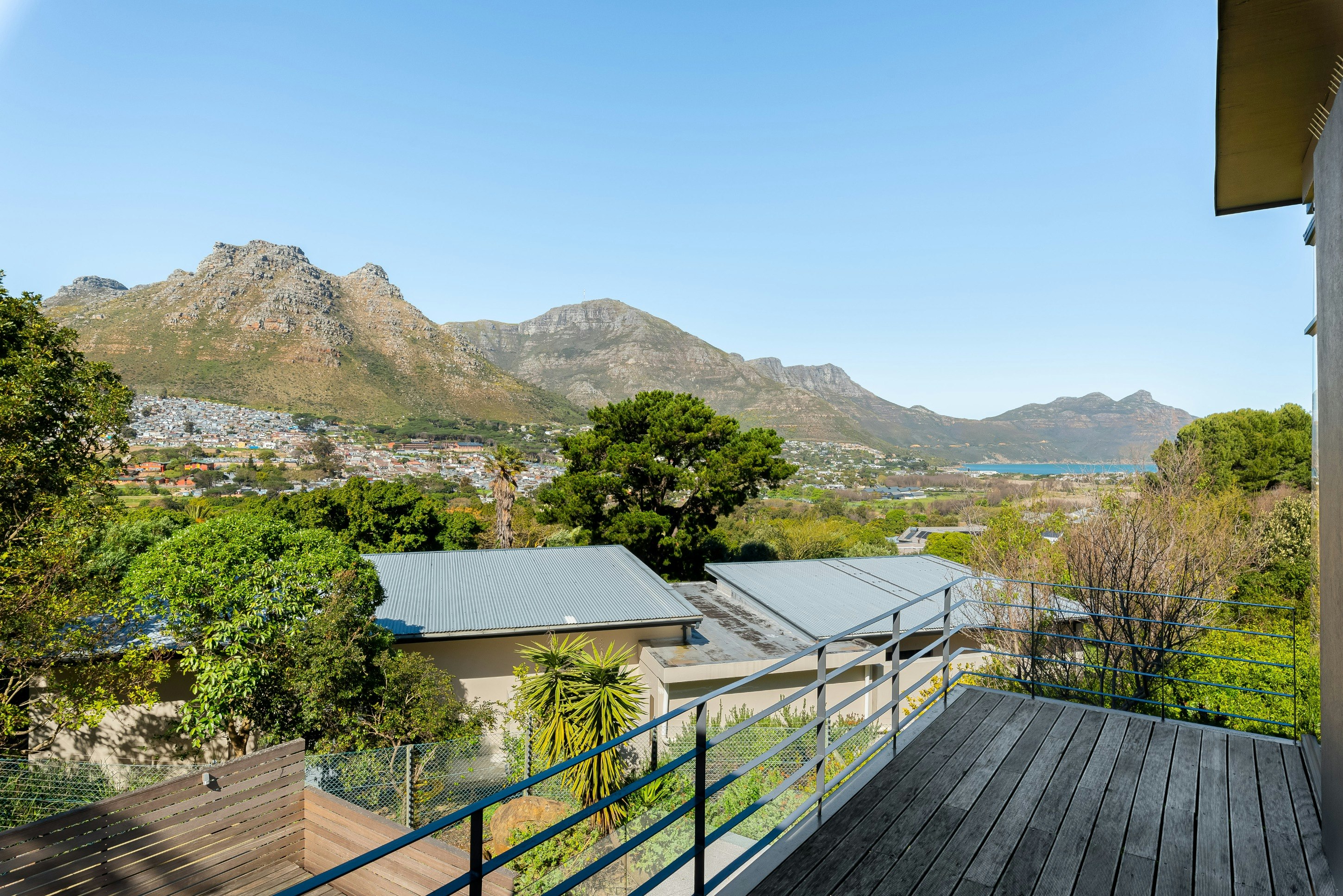 Buite kan gaste 'n swembad, dek en binnehof geniet, 'n sonnige hawe ideaal vir sonbaai, swem en gesinsvermaak. Hierdie uitnodigende ruimte bied die perfekte omgewing om Kaapstad se bekende klimaat te geniet terwyl jy die pragtige berguitsigte inneem. Die huis is ook toegerus met 'n omsetterbattery-rugsteun om noodsaaklike krag, insluitend Wi-Fi en ligte, aan die gang te hou tydens beurtkrag, sowel as veilige parkering met 'n motorhuis en bykomende geplaveide ruimte vir ekstra voertuie.