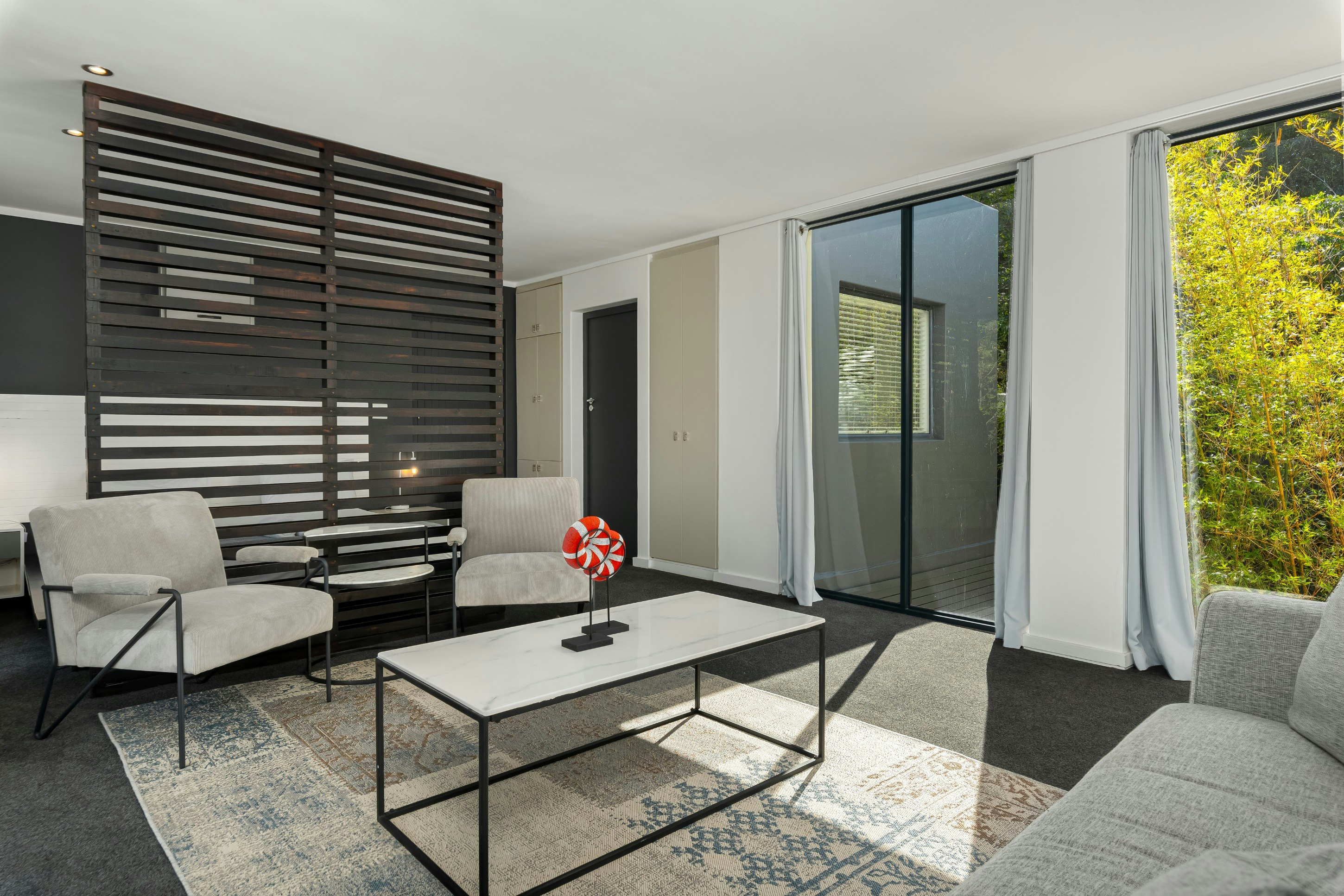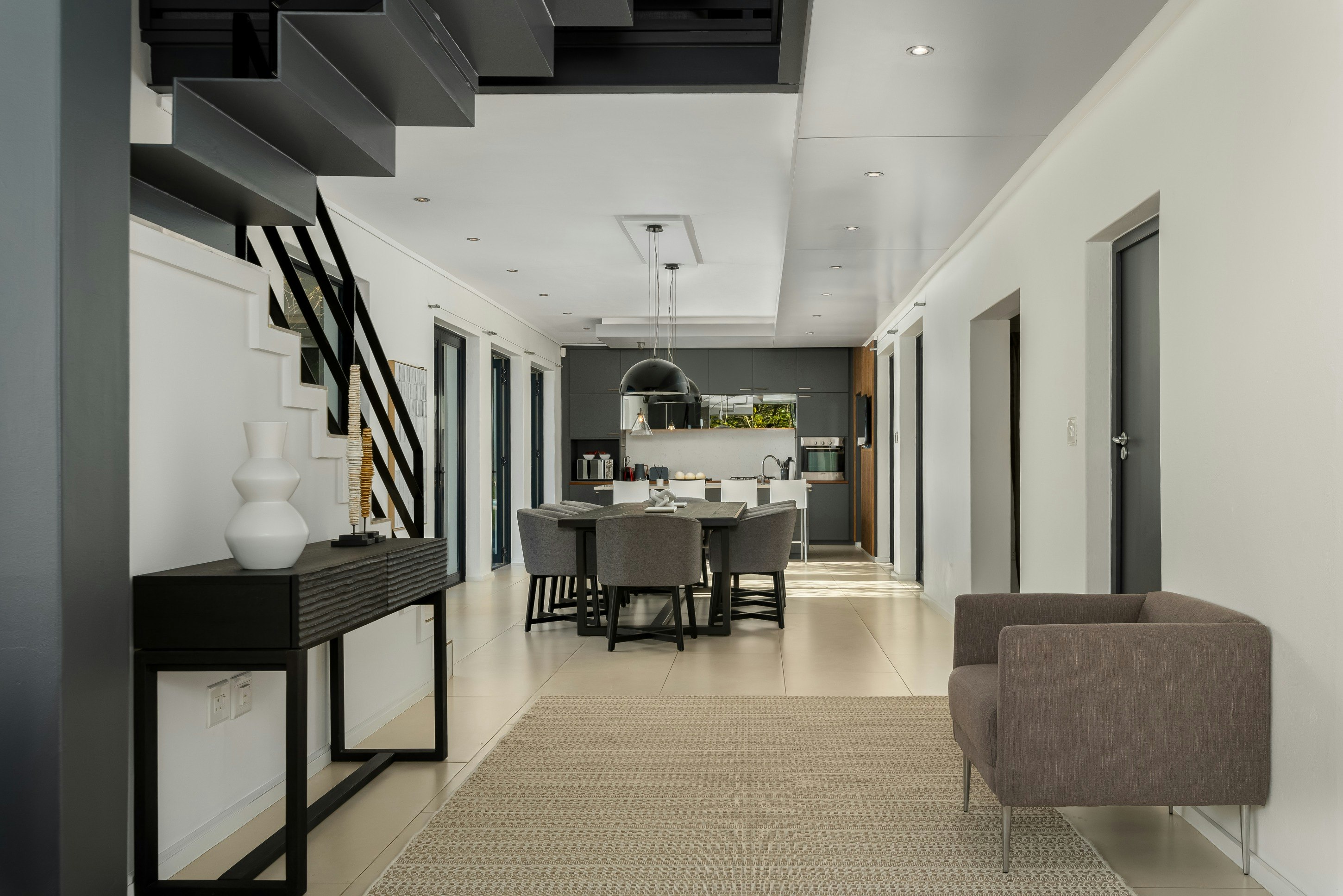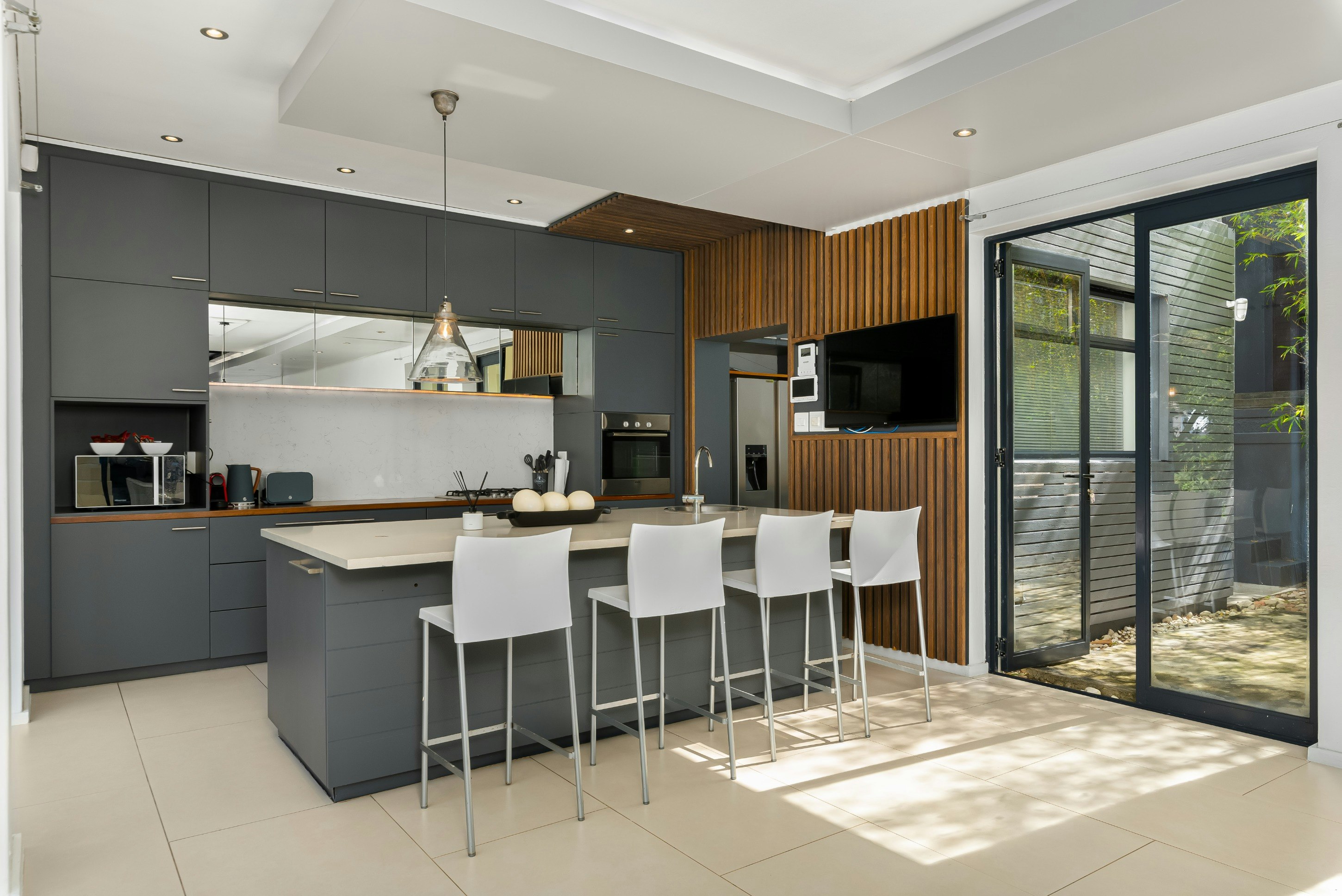 Buite kan gaste 'n swembad, dek en binnehof geniet, 'n sonnige hawe ideaal vir sonbaai, swem en gesinsvermaak. Hierdie uitnodigende ruimte bied die perfekte omgewing om Kaapstad se bekende klimaat te geniet terwyl jy die pragtige berguitsigte inneem. Die huis is ook toegerus met 'n omsetterbattery-rugsteun om noodsaaklike krag, insluitend Wi-Fi en ligte, aan die gang te hou tydens beurtkrag, sowel as veilige parkering met 'n motorhuis en bykomende geplaveide ruimte vir ekstra voertuie.
