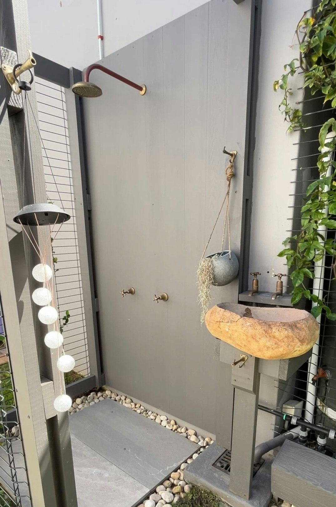 Langs die kombuis is 'n oordekte vermaaklikheidsarea met sitplek, 'n gasbraai, 'n houtvuur-warmbad, speletjies en 'n buitestort.
