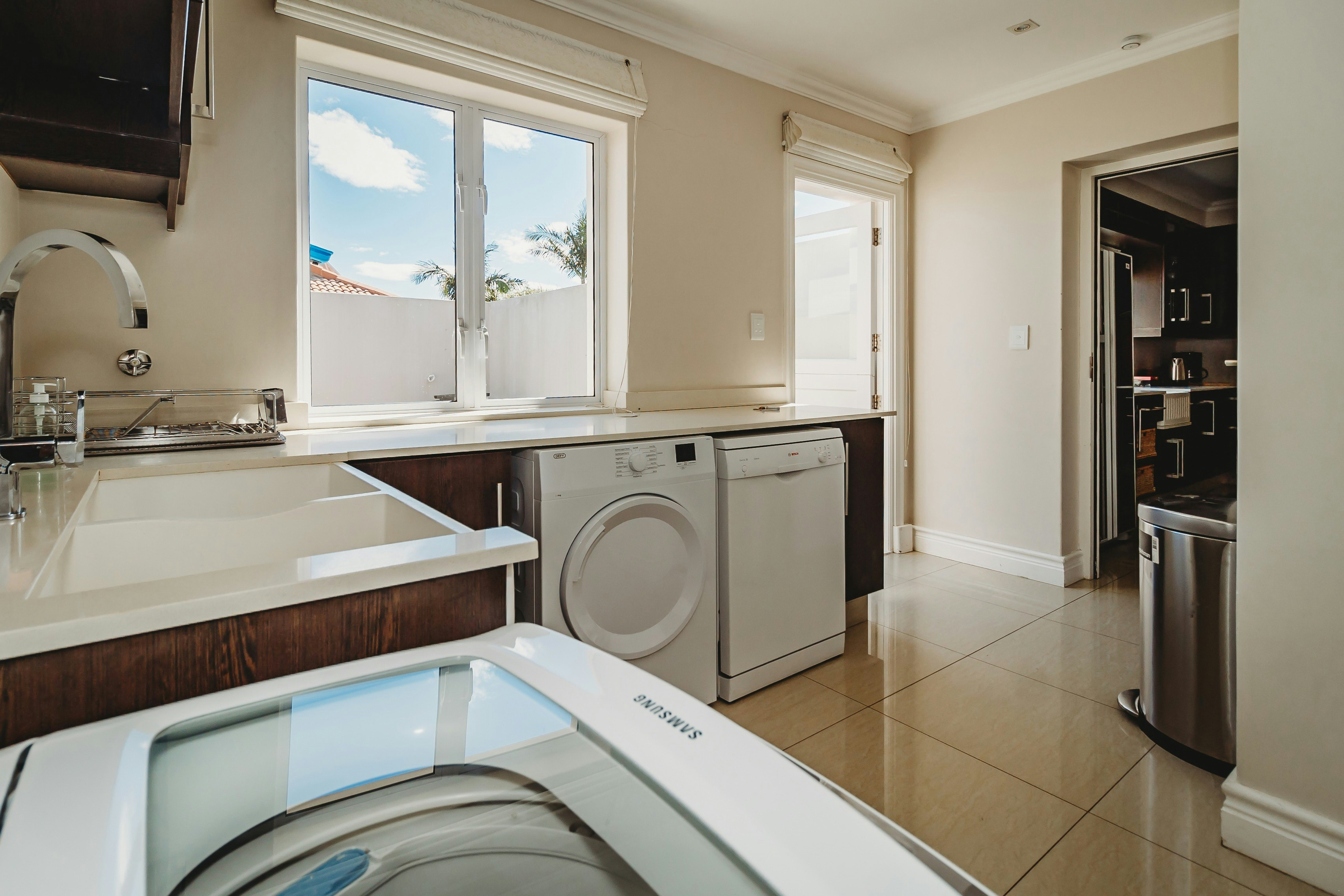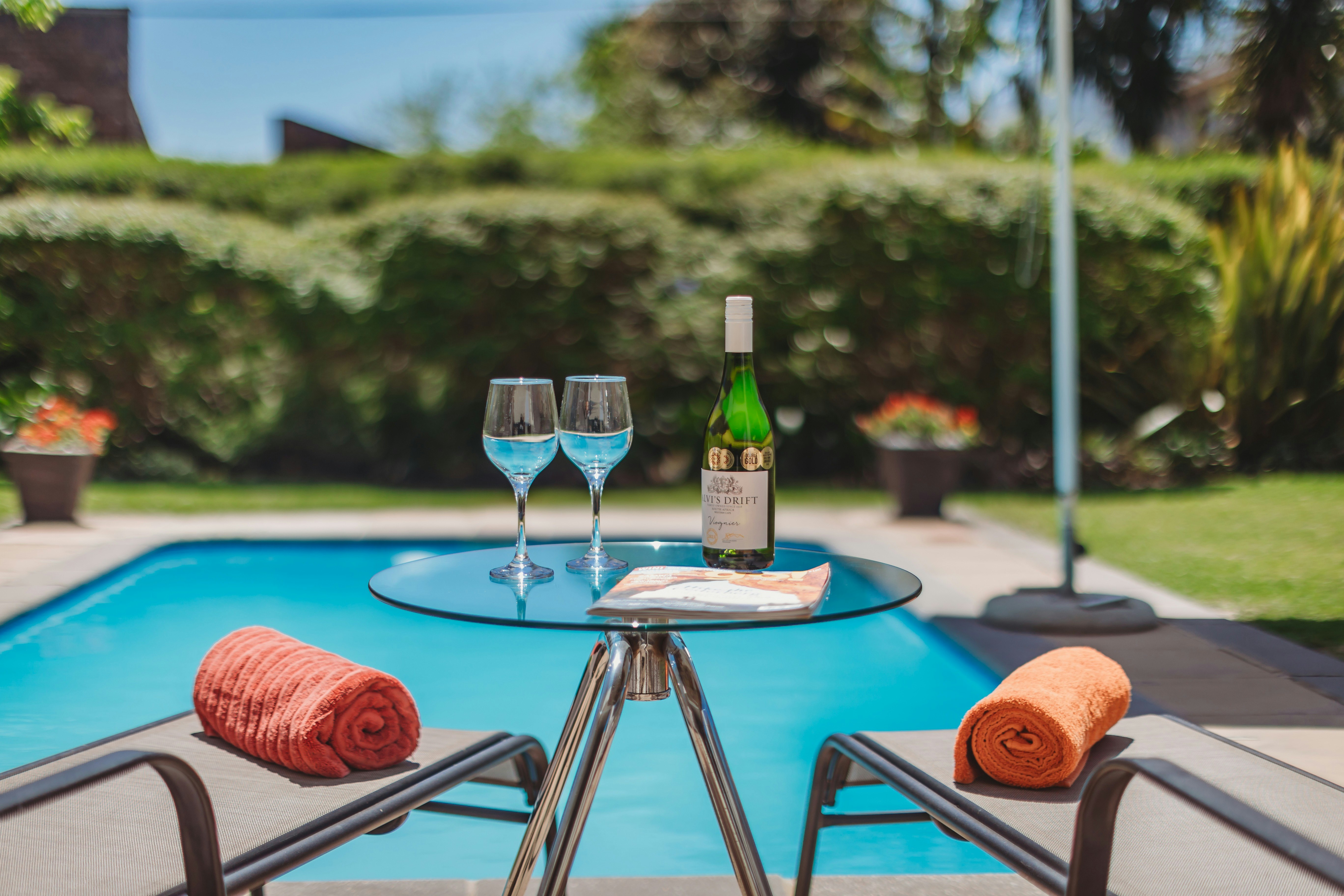 The kitchen is fully equipped for self-catering and contains a stove, oven, fridge-freezer, microwave, cutlery, and crockery. The house features a dining table, comfortable couches, a cosy fireplace, and a TV with DStv. Glass sliding doors lead to the patio with a built-in wood and charcoal grill and a well-kept garden with a pristine pool and comfortable sun loungers. Families with kids can enjoy extras like a trampoline, swingball set, and pool noodles for guests of all ages.