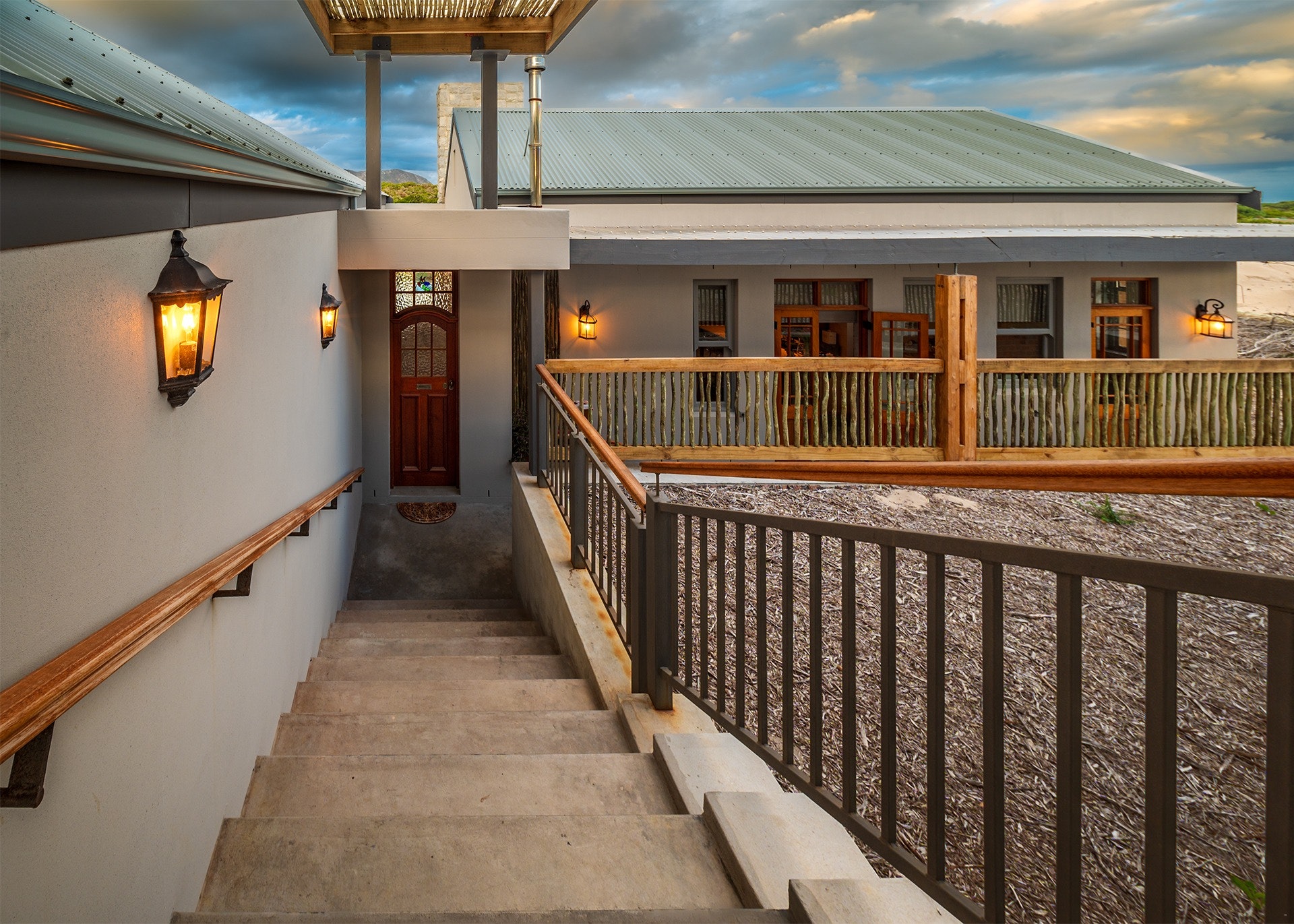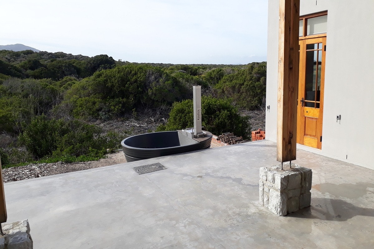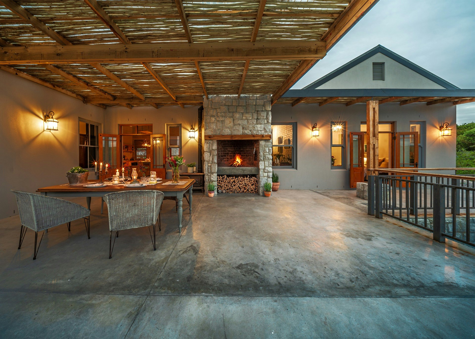 Buite skep 'n onderdakstoep met 'n ingeboude braai en gemaklike buitemeubels die perfekte ruimte om alfresco-maaltye te geniet terwyl jy die omliggende fynbos-plantegroei bewonder. Veilige parkeerplek word voorsien. Die landgoed is ook die tuiste van elande, sebras, bontebokke en springbokke, en beskik oor 'n skilderagtige 10 km-staproete asook toegang tot 'n privaat strand.