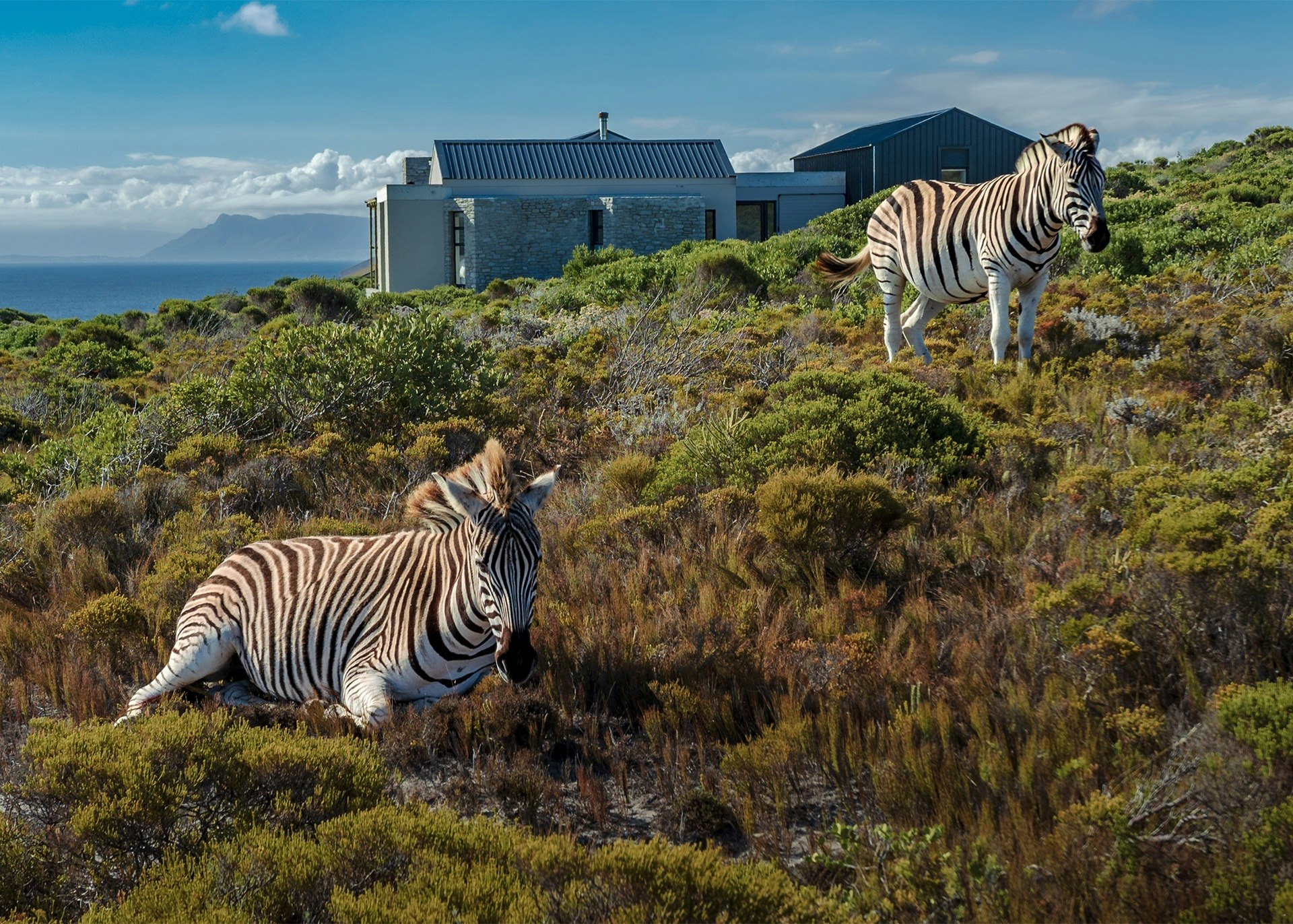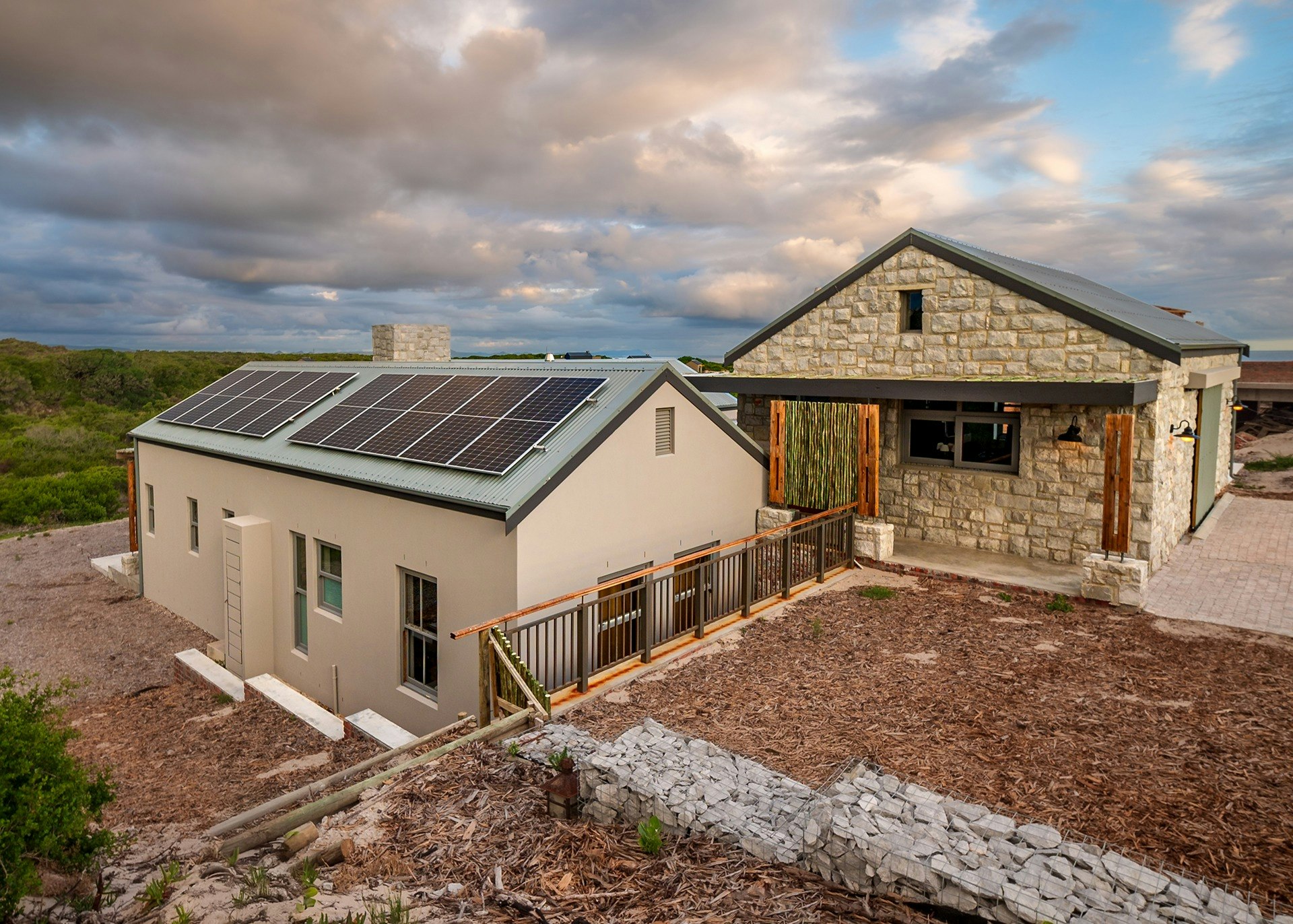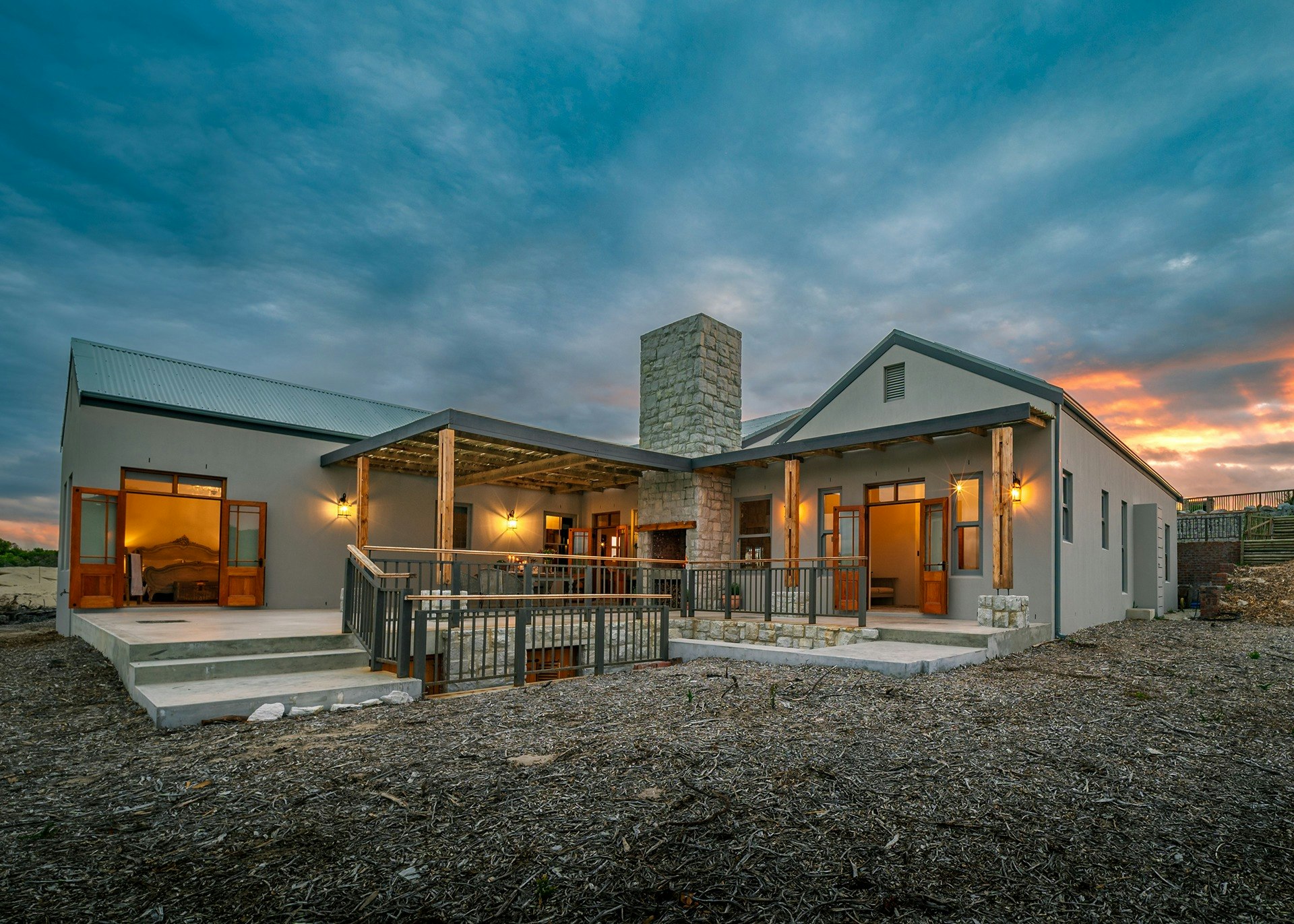 Buite skep 'n onderdakstoep met 'n ingeboude braai en gemaklike buitemeubels die perfekte ruimte om alfresco-maaltye te geniet terwyl jy die omliggende fynbos-plantegroei bewonder. Veilige parkeerplek word voorsien. Die landgoed is ook die tuiste van elande, sebras, bontebokke en springbokke, en beskik oor 'n skilderagtige 10 km-staproete asook toegang tot 'n privaat strand.