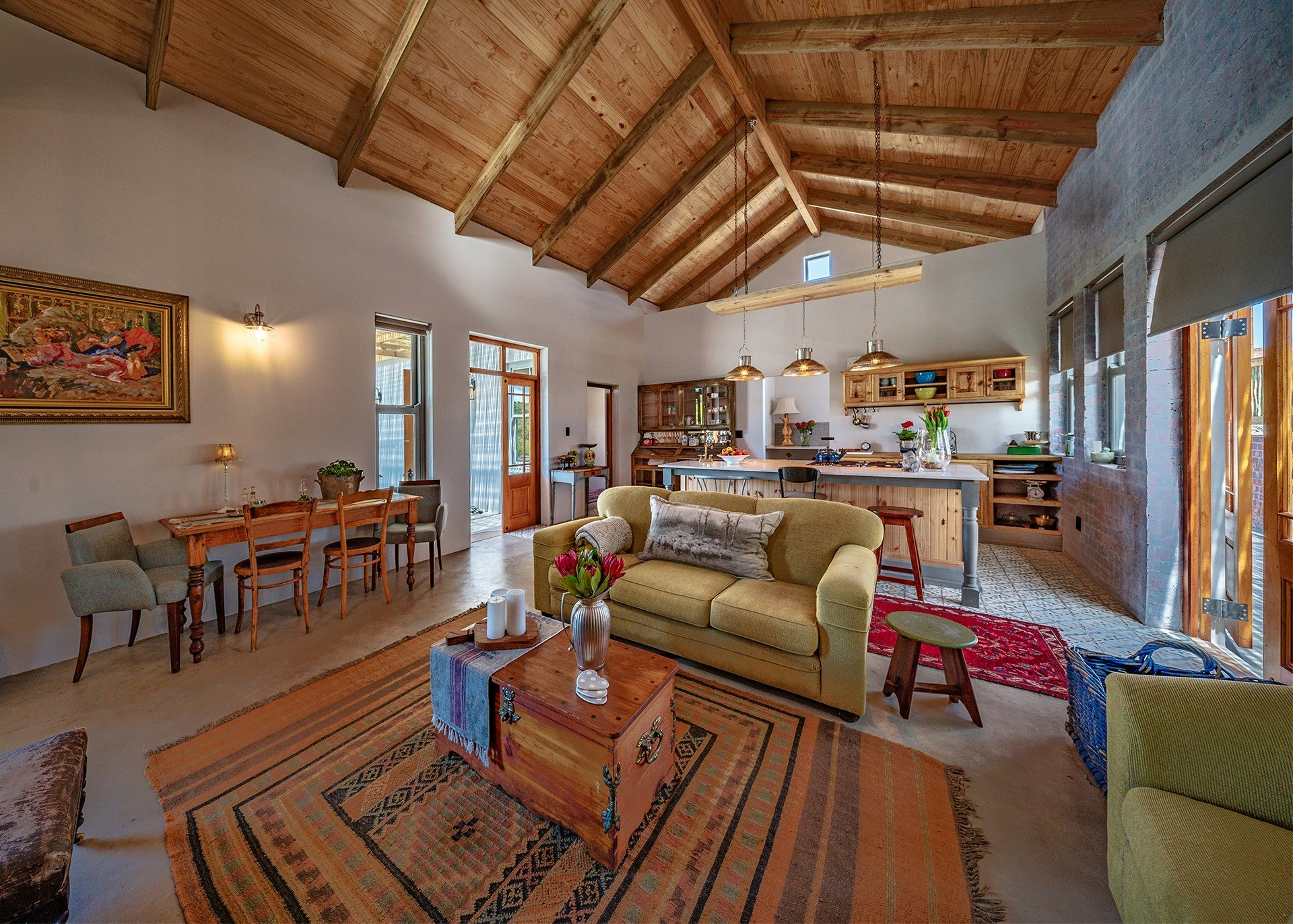 Die ligte en lugtige oopplan-leefarea beskik oor 'n bekoorlike plaasstyl-kombuis wat toegerus is met 'n yskas-vrieskas, gasstoof, gasoond, mikrogolf, eetgerei en breekware, tee- en koffiemaakgeriewe, asook 'n ontbyttoonbank met stoele. Langs die kombuis bied die sitkamer gemaklike rusbanke, 'n 4-sitplek-eetkamertafel en 'n slim-TV met stromingsdienste en 'n verskeidenheid DStv-kanale, insluitend kykNET en SuperSport. Komplimentêre WiFi is beskikbaar.