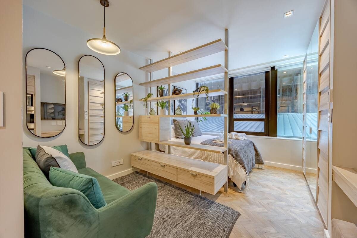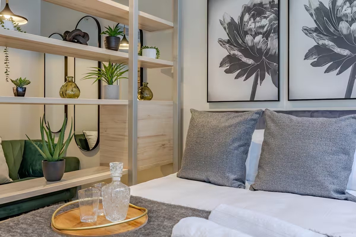 The studio includes a kitchen equipped with a bar fridge, 2-plate induction stove, microwave, cutlery and crockery, as well as tea- and coffee-making facilities. A comfortable seating area with a wall-mounted smart TV offering streaming services and complimentary Wi-Fi access is also provided.